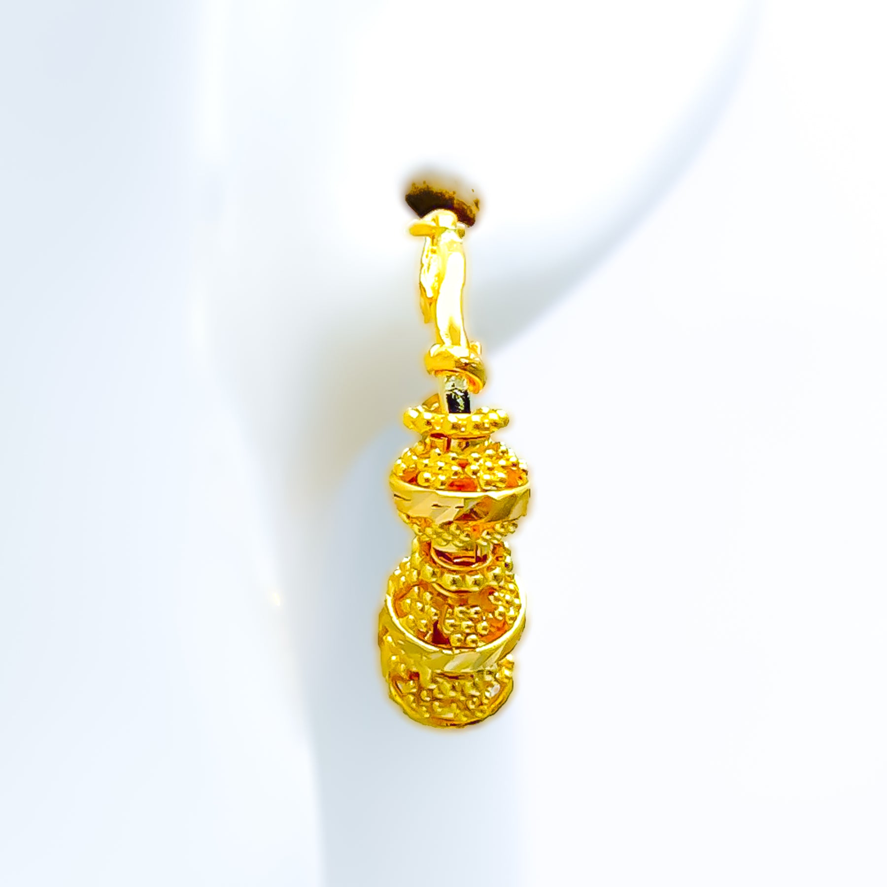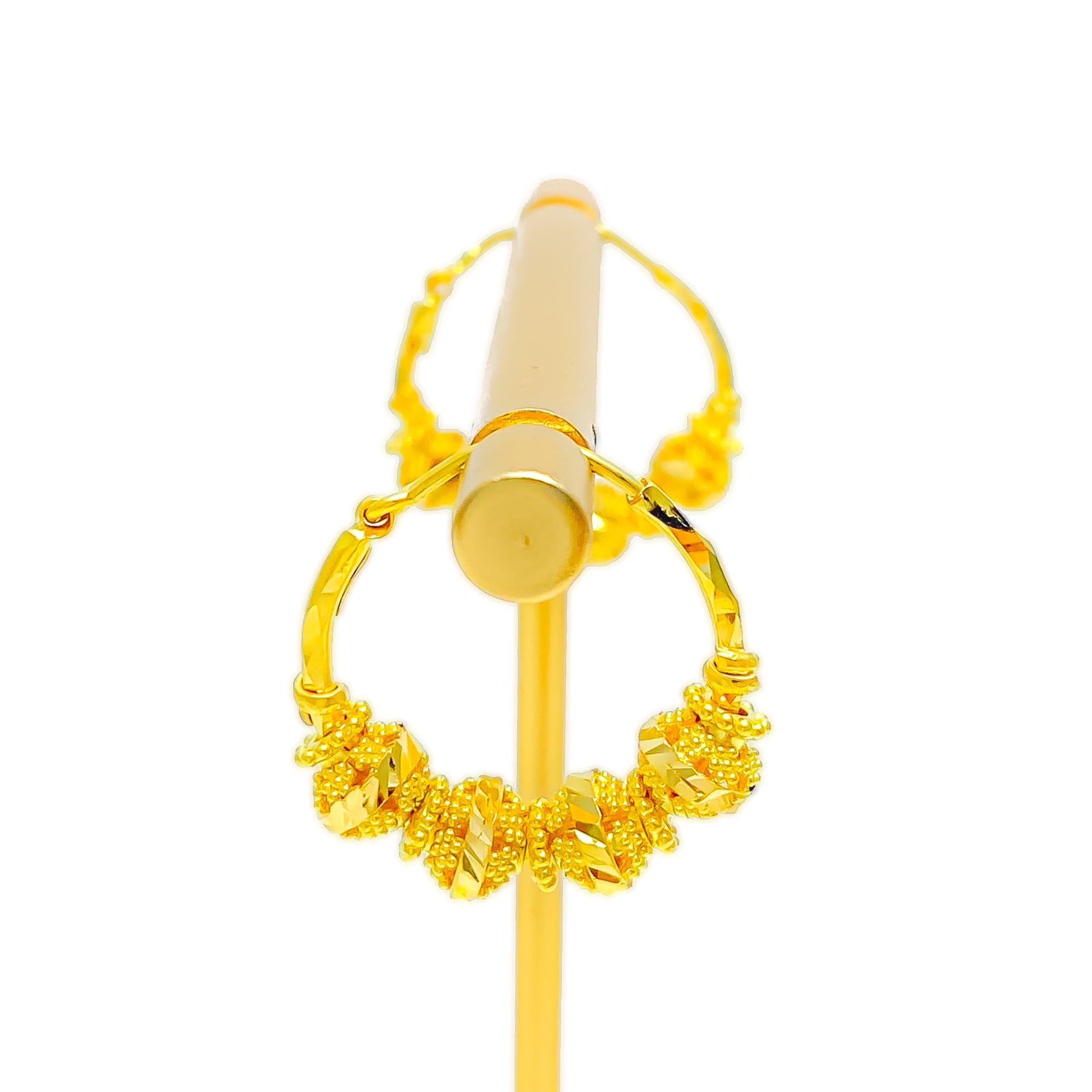 Commanding attention with bold artistry, these 22k gold Bali earrings exude opulence and timeless grandeur. Weighing 7.5 grams with a 0.75-inch diameter, they balance substance with refined design. The radiant yellow gold finish amplifies their luxurious appeal, making them a statement of modern sophistication and enduring beauty.