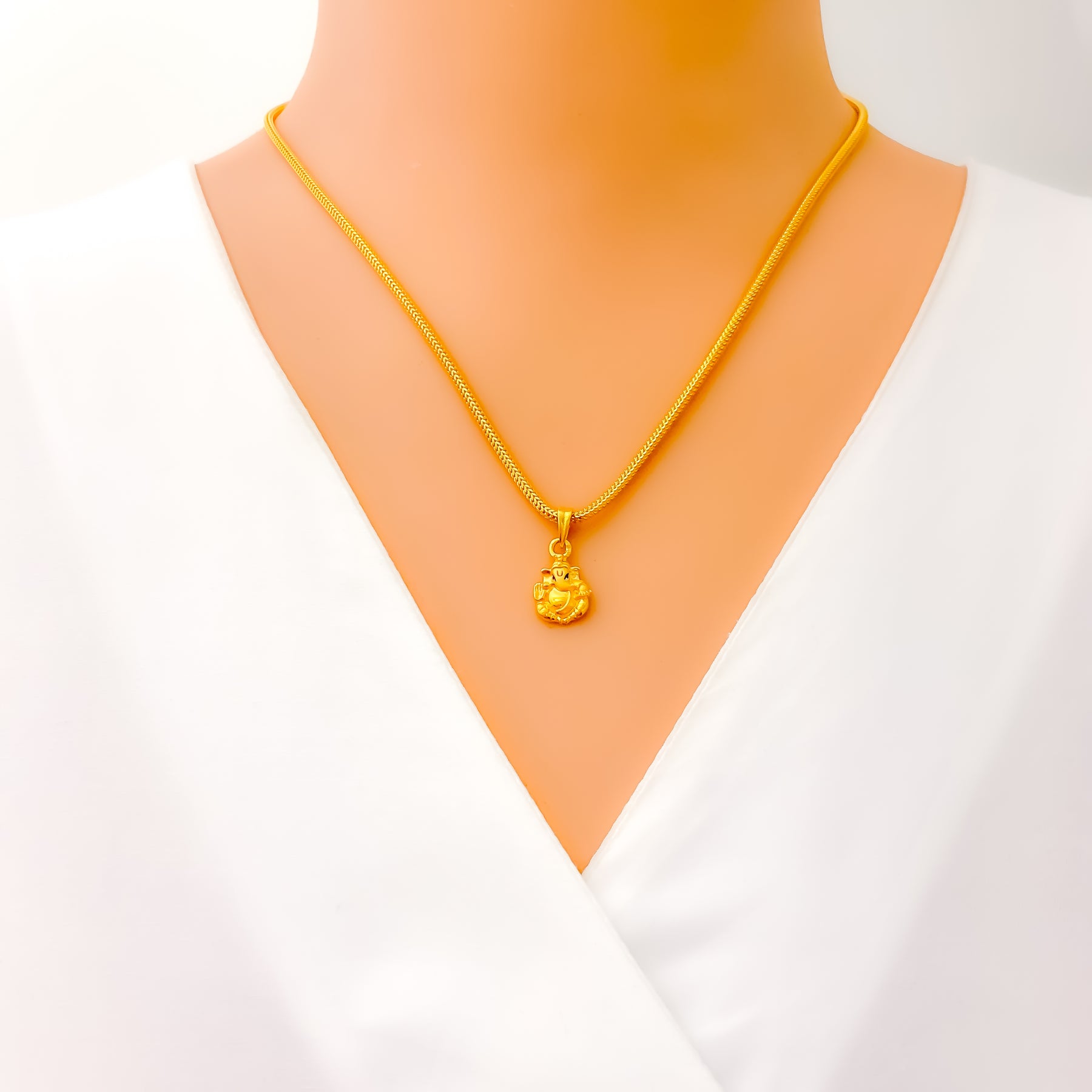 Luxurious 22k yellow gold pendant weighs 1.9 grams, featuring an exclusive Ganesh design with warm radiant elegance. The 0.75 inch length offers a compact yet meaningful presence ideal for everyday spiritual styling. Designed as a standalone piece, it pairs effortlessly with a variety of chains. Its polished finish delivers timeless devotion with refined contemporary charm.