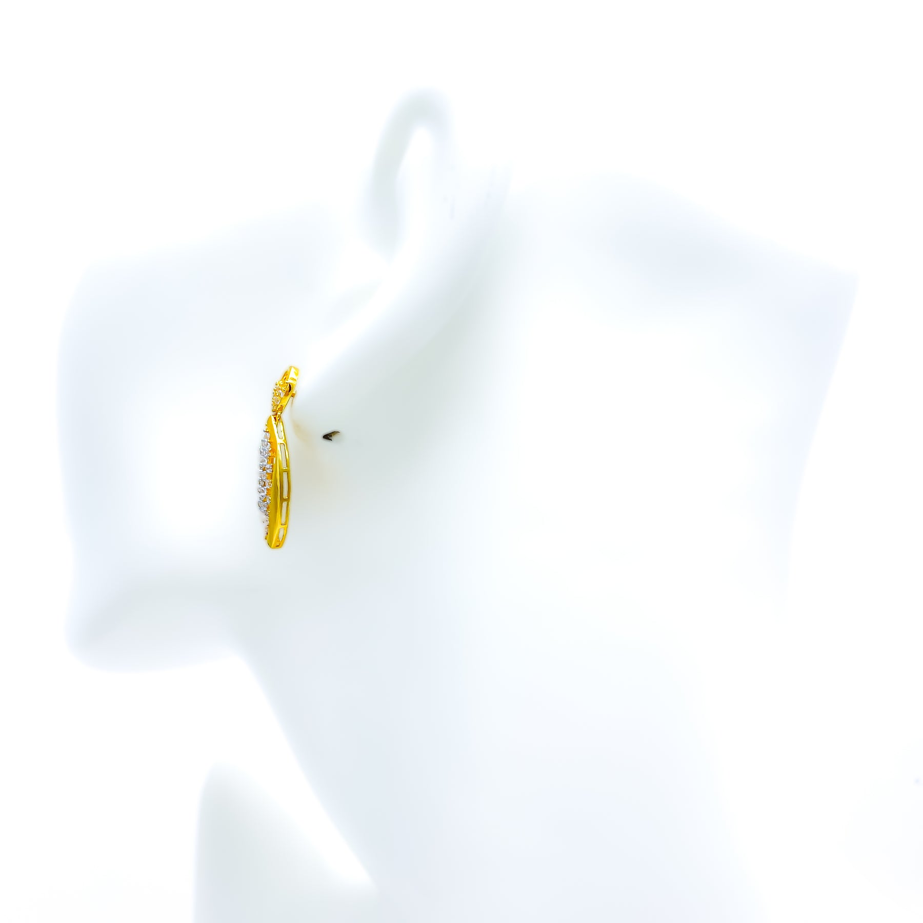 These elegant hanging earrings sparkle with luminous CZ stones that enhance their graceful 1.25-inch silhouette with refined brilliance. The 5.7-gram yellow gold design strikes a polished balance between lightweight comfort and eye-catching presence, perfect for both daily wear and special occasions. Their fluid movement adds a touch of sophistication that effortlessly elevates any look. Secured with dependable screw backs, they offer a versatile and timeless addition to any thoughtfully curated jewelry collection.
