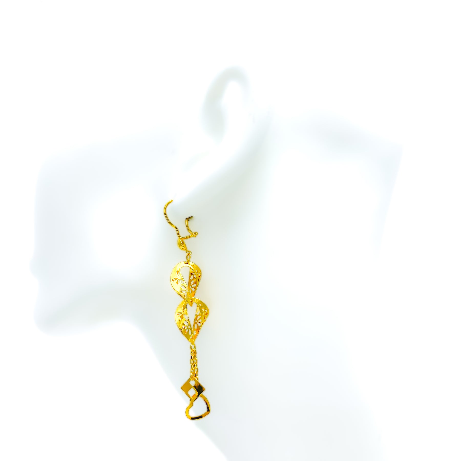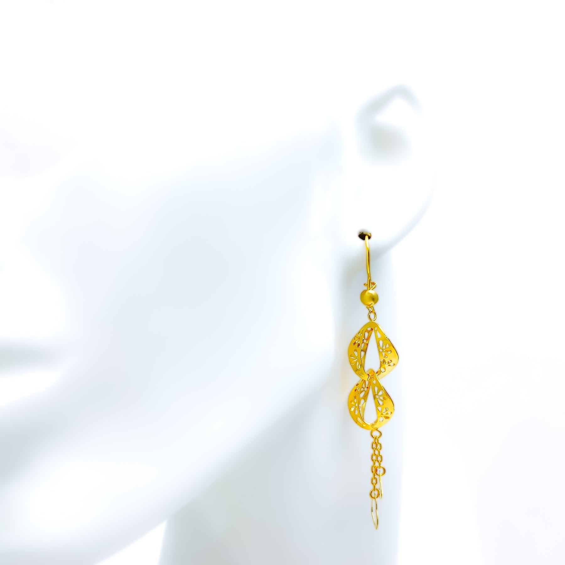 Beautifully designed in 21k yellow gold, these 5.6-gram earrings feature intricate cutwork patterns and a graceful 3.2-inch drop. The elongated hanging style, secured with hook backs, offers a flawless blend of craftsmanship and elegance. A striking choice for refined, statement-ready styling.