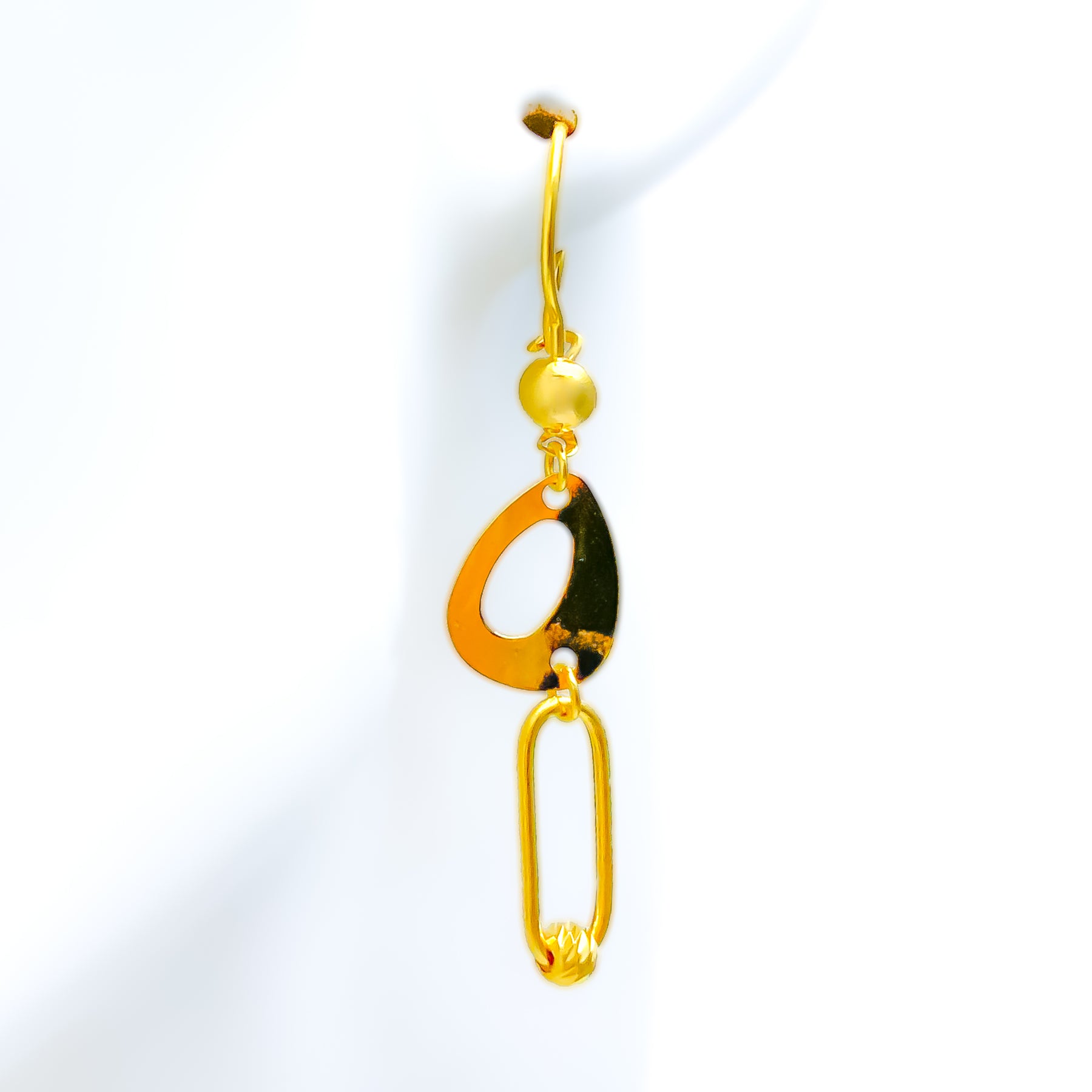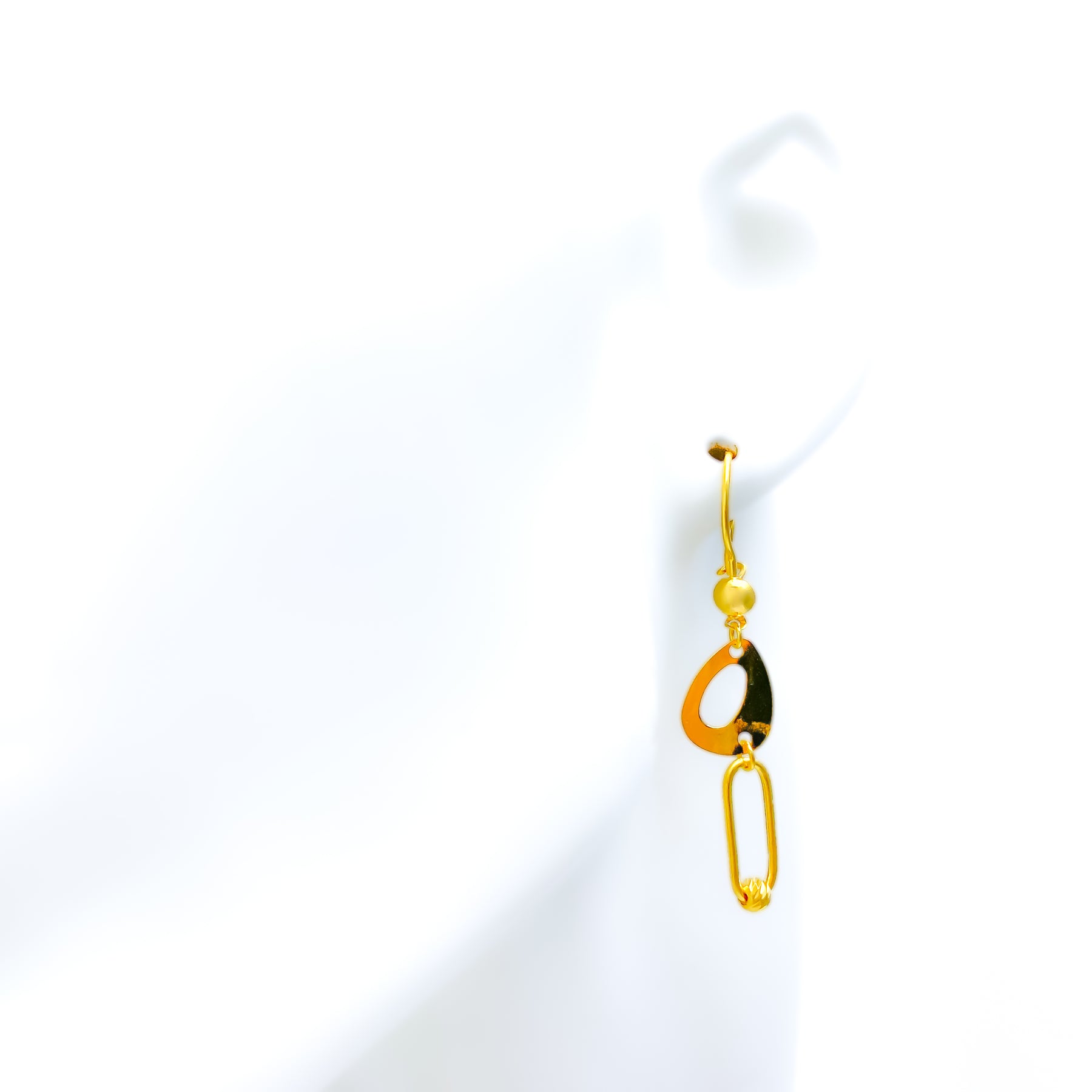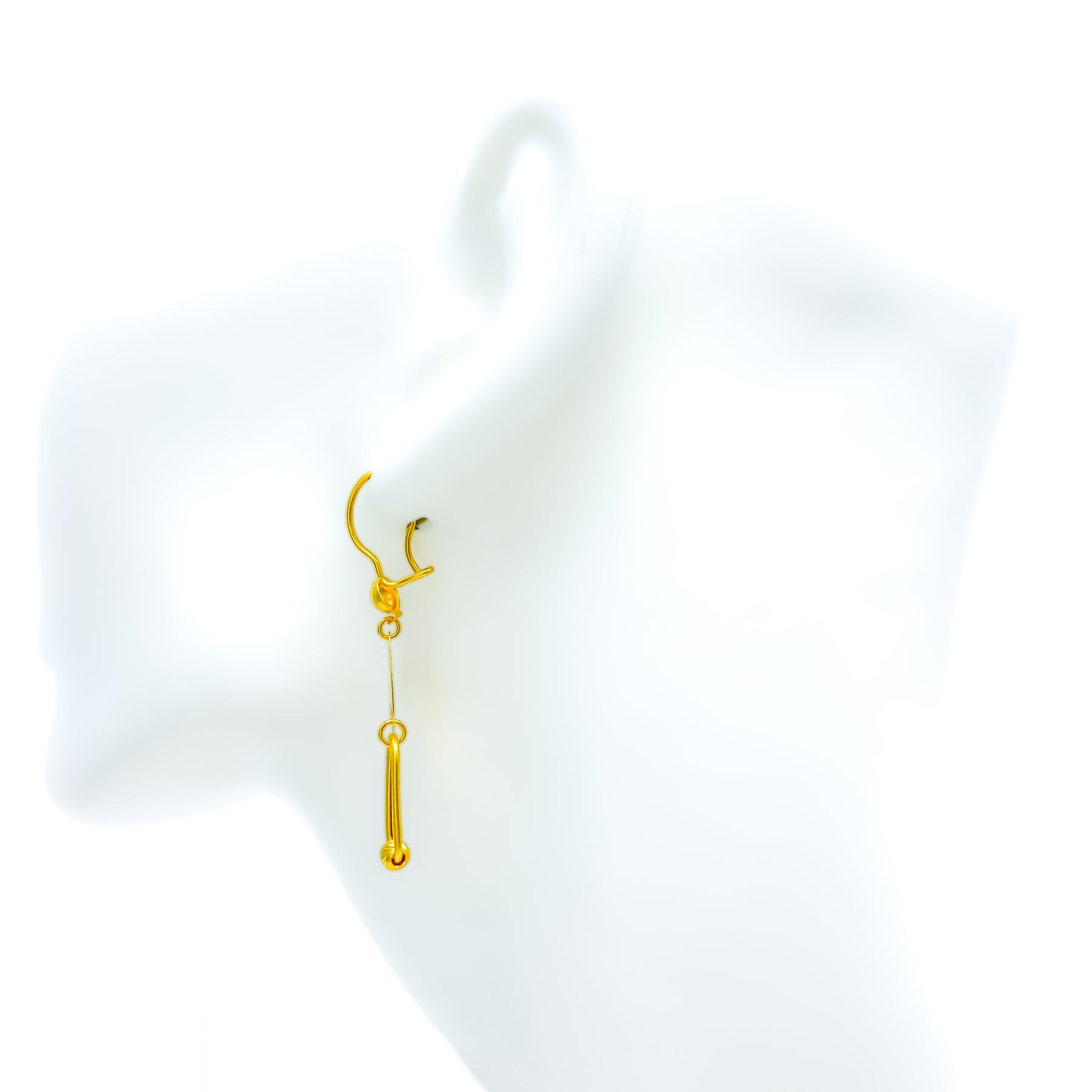 Uniquely refined, these 21k yellow gold earrings weigh 2.6 grams and feature a distinctive hanging silhouette with a graceful 2.2-inch drop. Finished in a polished glow and secured with hook backs, they blend rarity with elegance. A signature piece perfect for everyday luxury or refined layering.