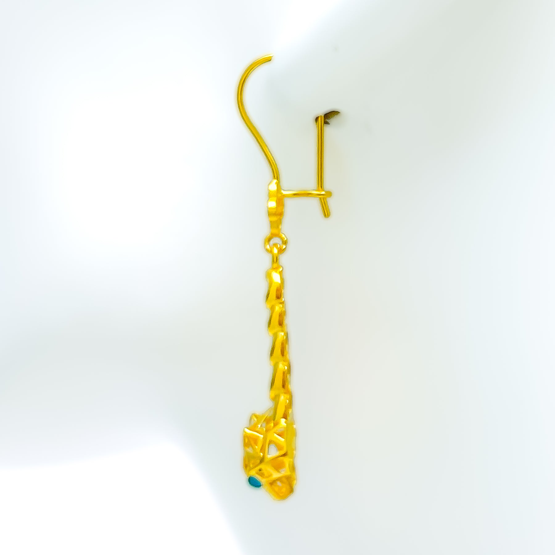 Bold yet refined, these 21k yellow gold earrings weigh 4.4 grams and feature a grand hanging design that exudes statement-worthy elegance. With a length of 1.8 inches and classic hook backs, they offer secure, graceful wear. A striking blend of style and sophistication for any occasion.