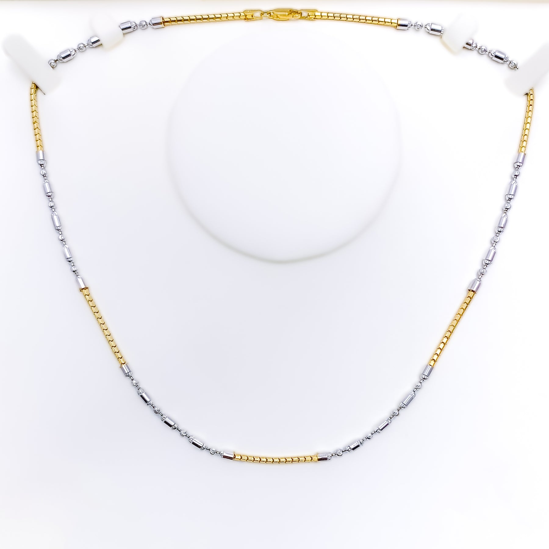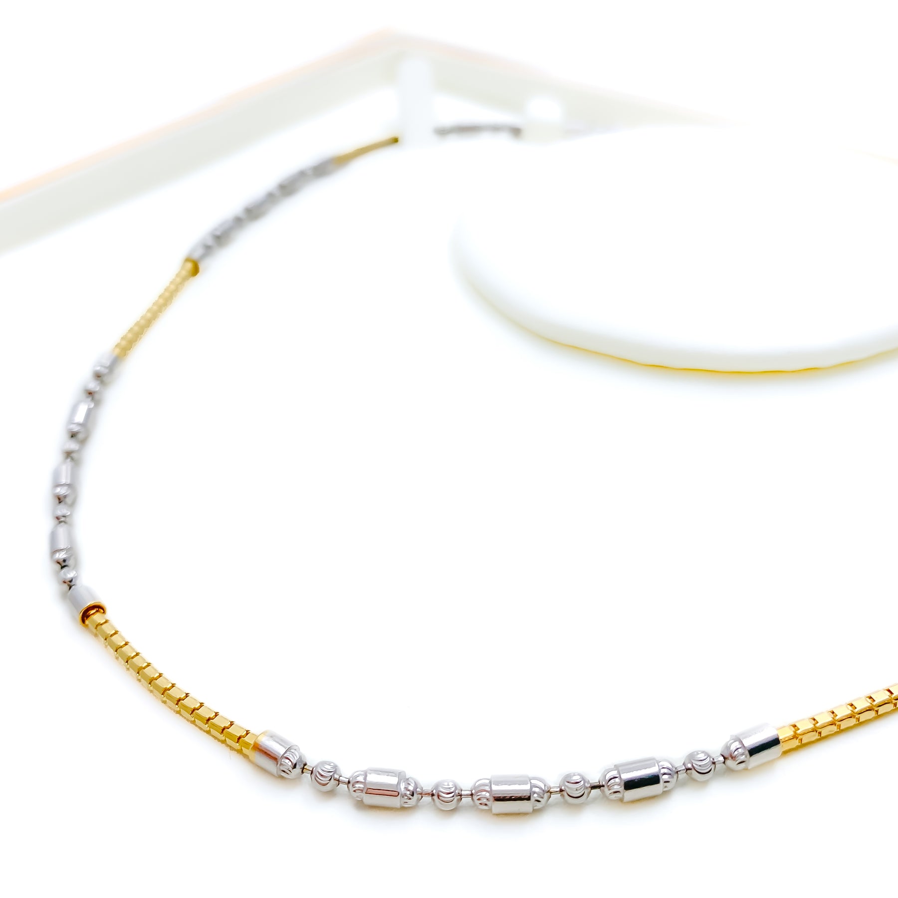 This elegant 18k gold chain, weighing 12.2 grams, features alternating yellow and white gold beads for a refined two-tone effect. Measuring 18" in length with a 3mm width, it offers a perfect balance of style and comfort. The polished finish enhances its luminous appeal, secured by a lobster lock. A versatile accessory that adds sophistication to both everyday wear and special occasions.