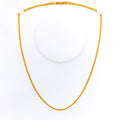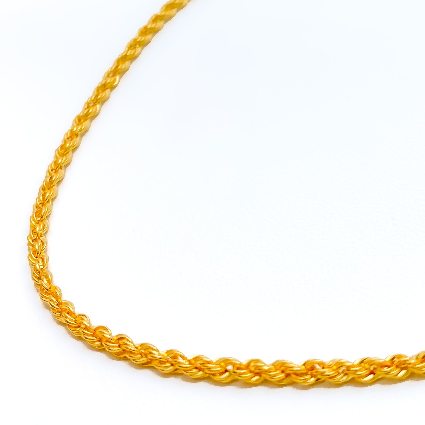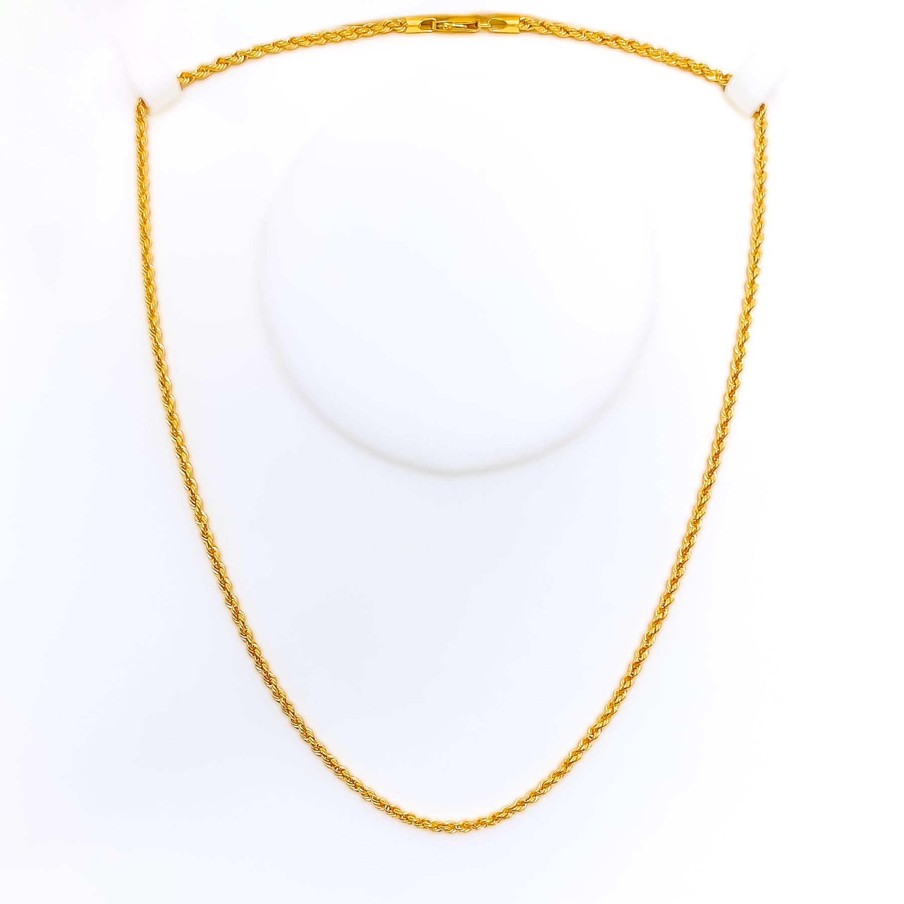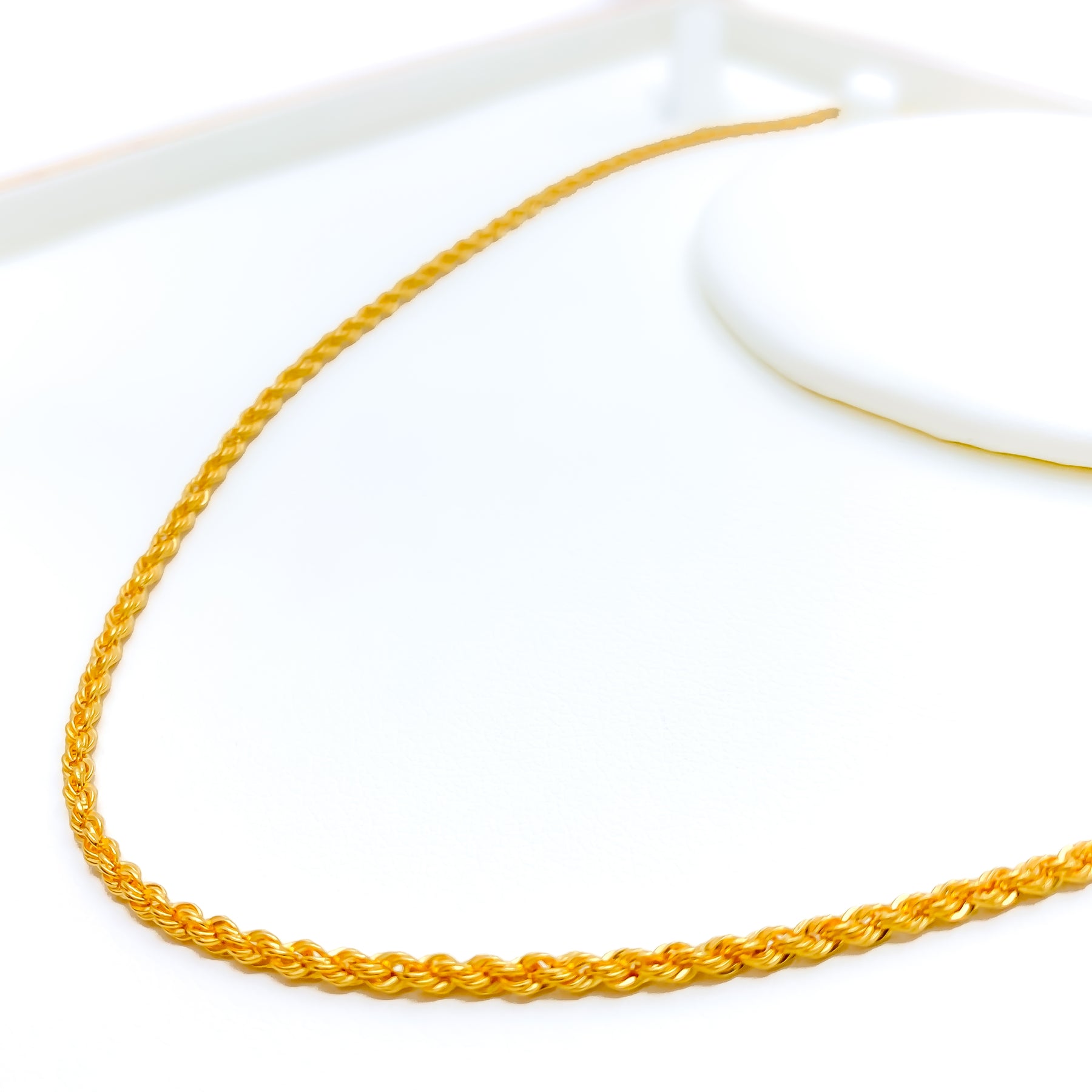 Delicately crafted, this 22k yellow gold rope chain weighs 3.5 grams and features a slender 1.5mm width with a signature twisted texture. Measuring 16 inches in length, it sits elegantly at the neckline and is secured with a classic lobster lock. Ideal for layering or wearing with a petite pendant, this piece offers lightweight charm with timeless golden allure.