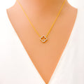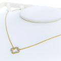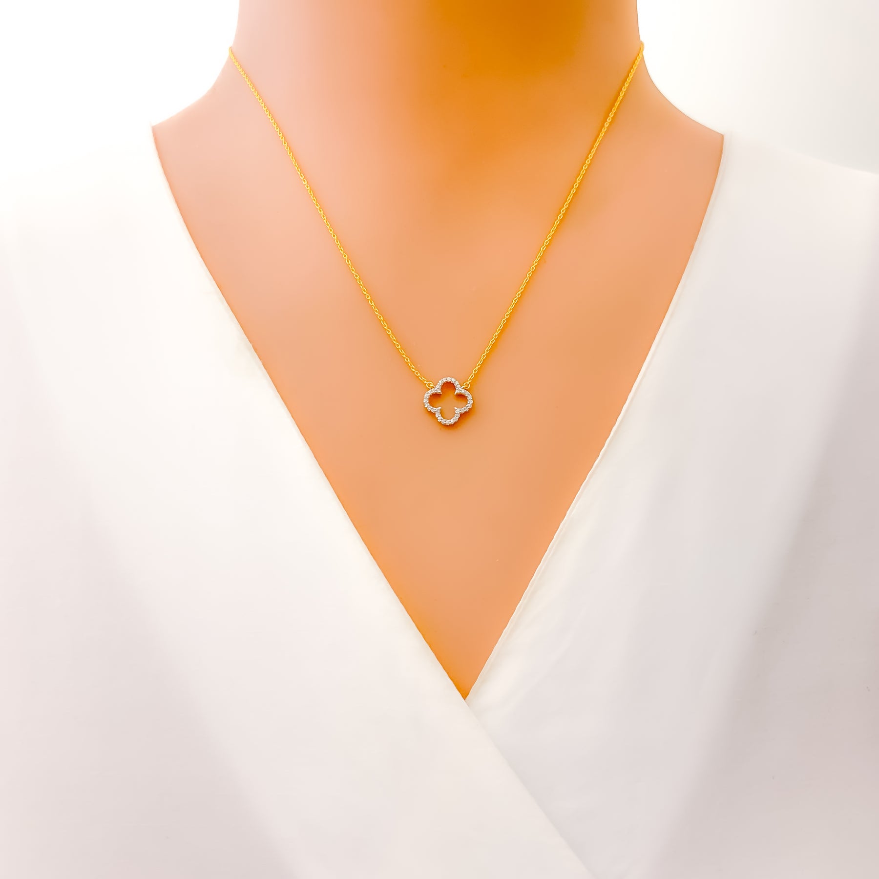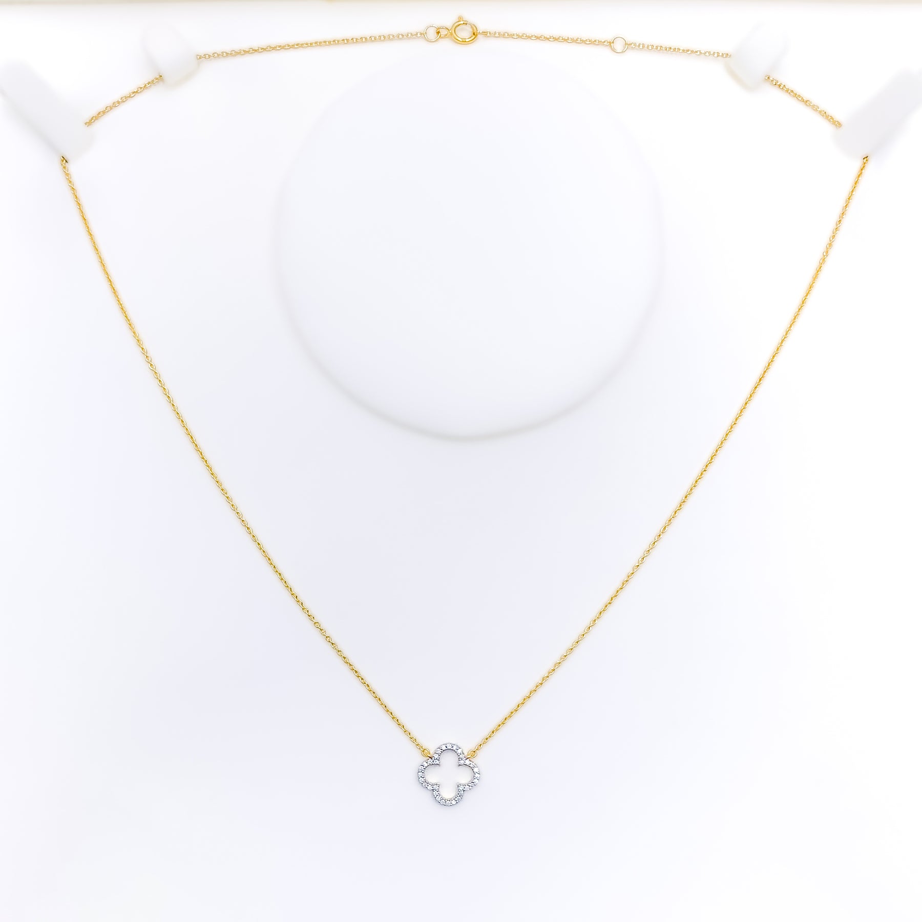 Radiating charm and brilliance, this 18k yellow gold necklace weighs 2.0 grams and features a luminous clover-shaped pendant adorned with 0.11ct of round brilliant cut diamonds in G-H color and VS clarity. The 17-inch chain is secured with a lobster ring lock and offers a graceful 0.5-inch drop for added elegance. With its polished finish and symbolic design, this necklace blends luck and luxury, making it a timeless choice for everyday wear or meaningful gifting.