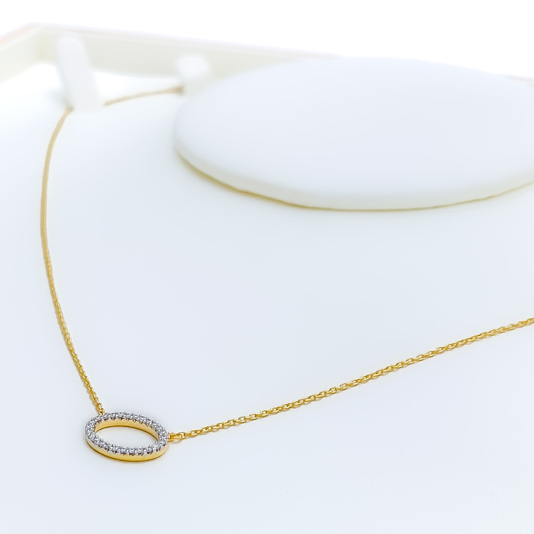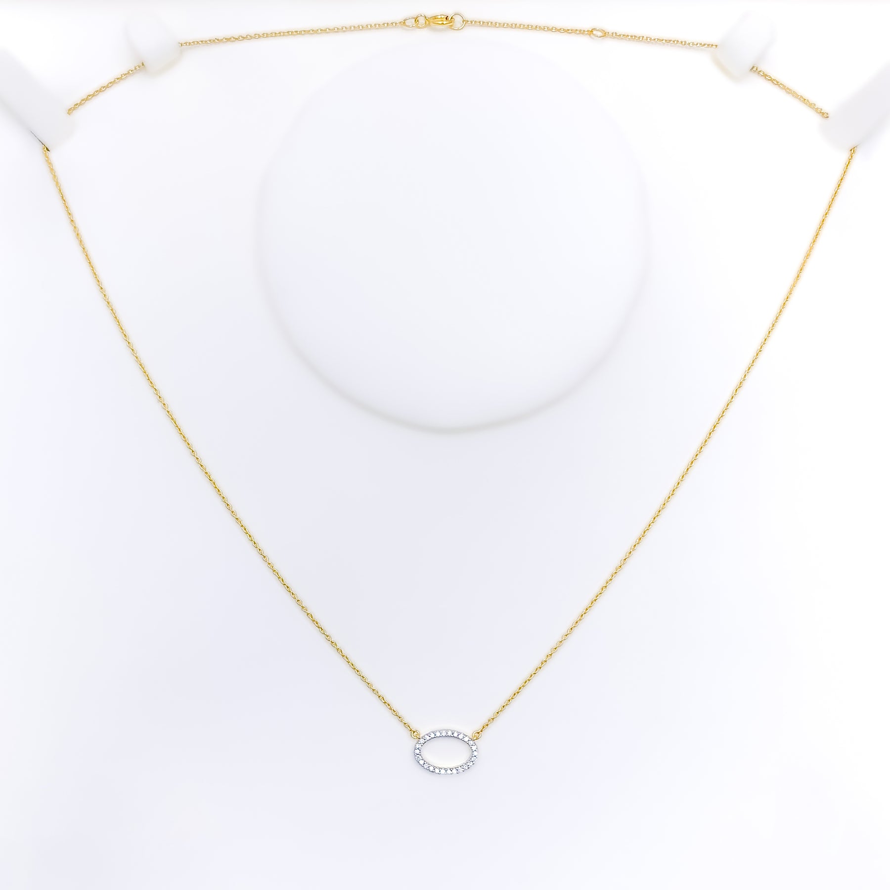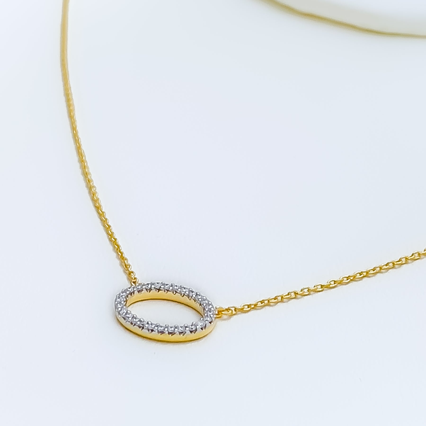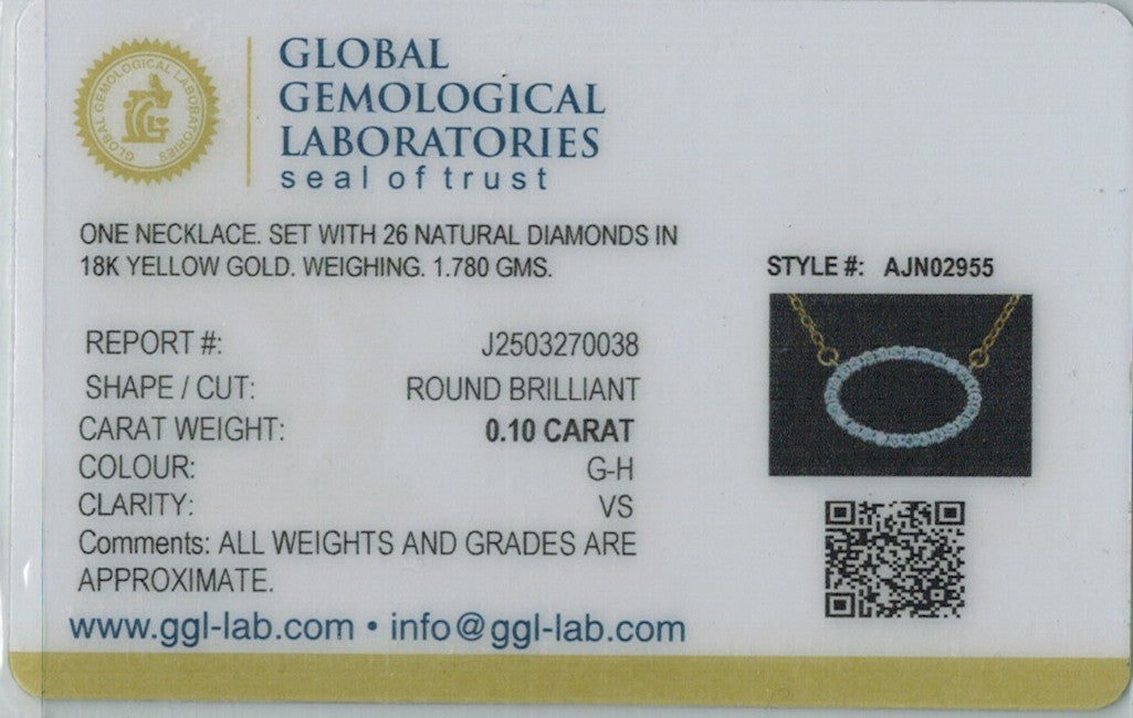 Elegant and enduring, this 18k yellow gold necklace weighs 1.7 grams and features a refined oval pendant adorned with 0.10ct of round brilliant cut diamonds in G-H color and VS clarity. The 17-inch chain includes 2 inches of adjustable links and secures with a lobster ring lock for a comfortable, customizable fit. With a graceful 0.3-inch drop and GGL certification, this piece offers timeless sparkle and sophistication—perfect for those who appreciate classic design with a polished, luxurious touch.
