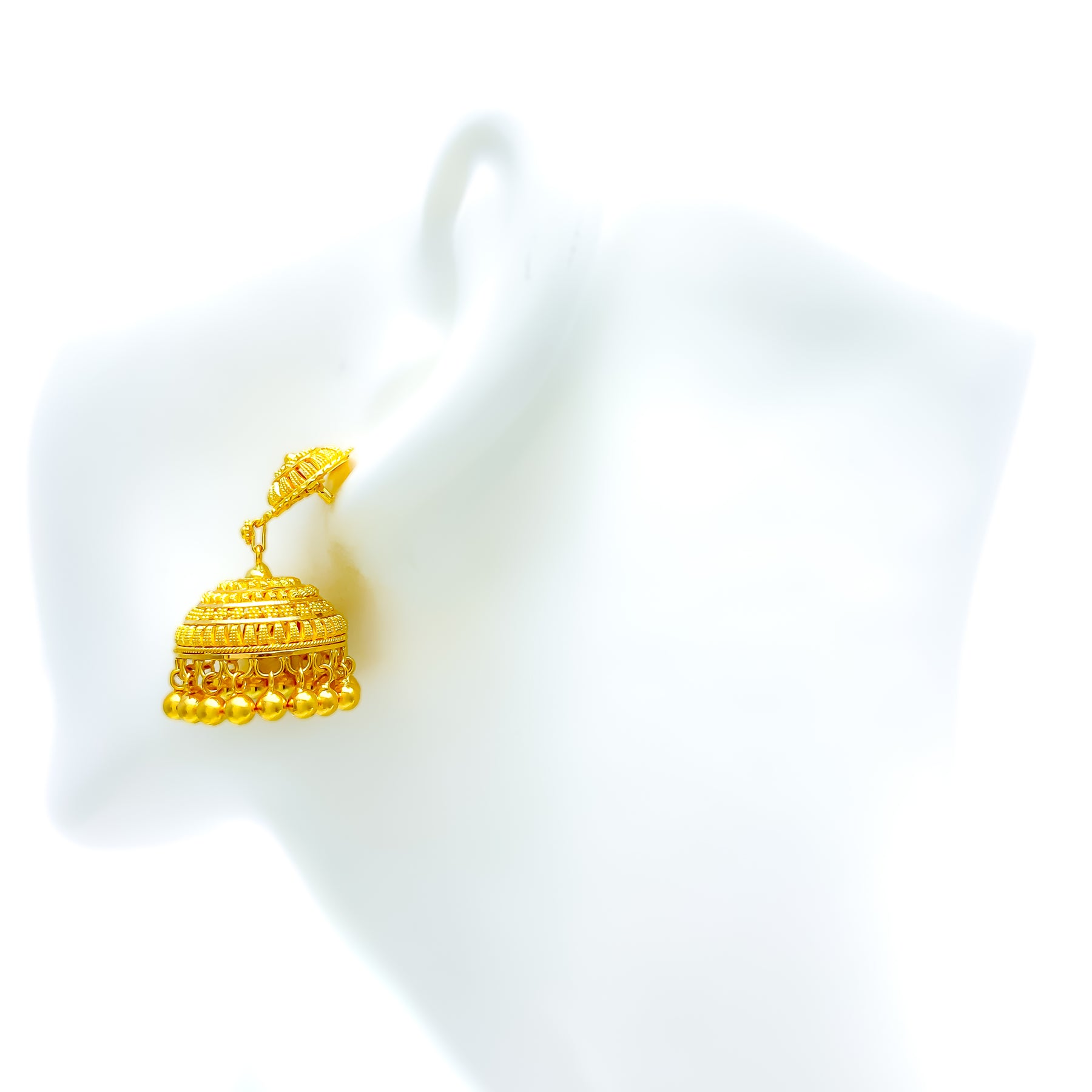 Rich in traditional elegance, these 22k yellow gold Jhumki earrings are designed to evoke a timeless, heirloom aesthetic. Weighing 19.8 grams with a 1.5-inch length, they feature ornate beading that adds depth and texture. Their structured silhouette and screw back closure offer both grace and security. Ideal for those seeking a lasting piece of cultural and ornamental beauty.