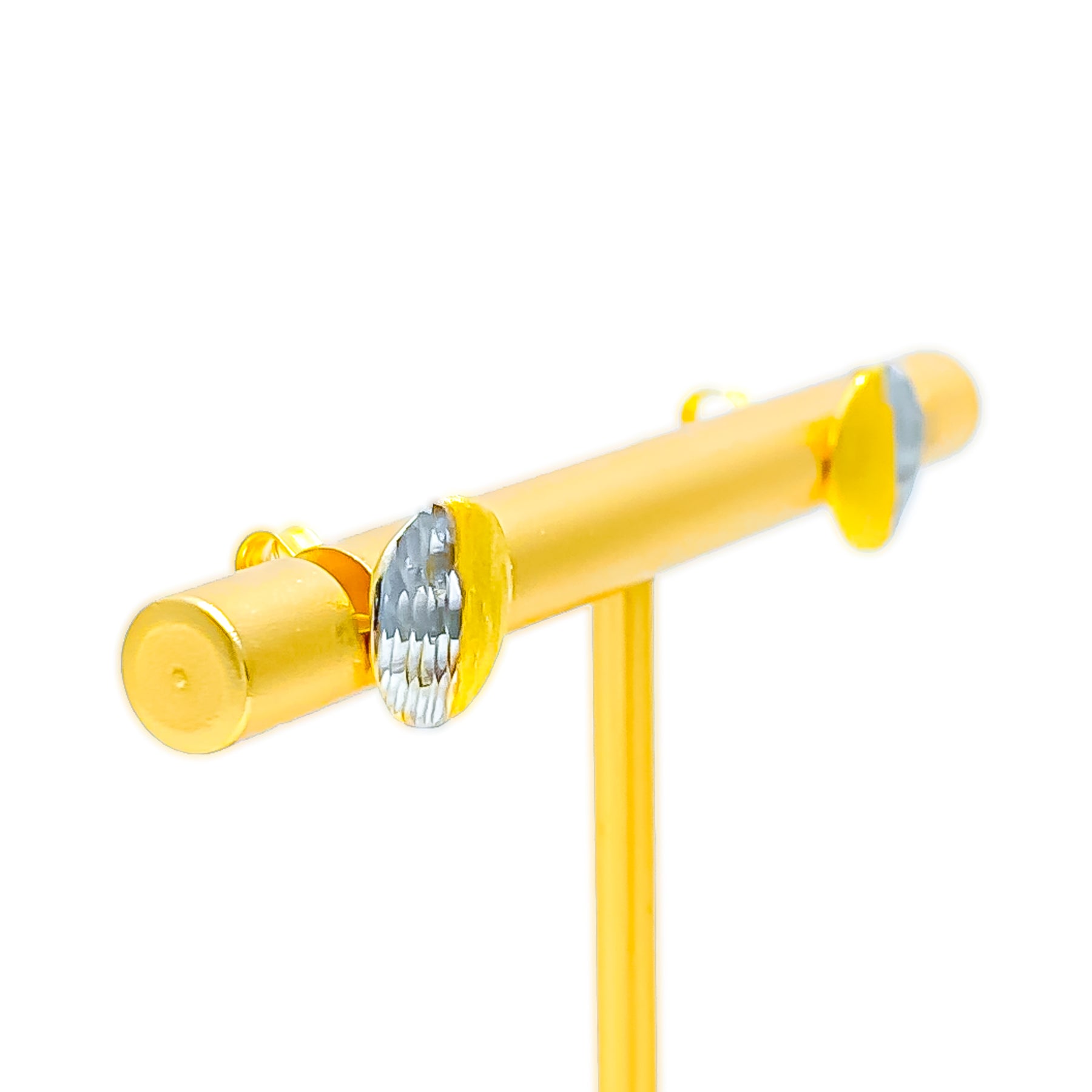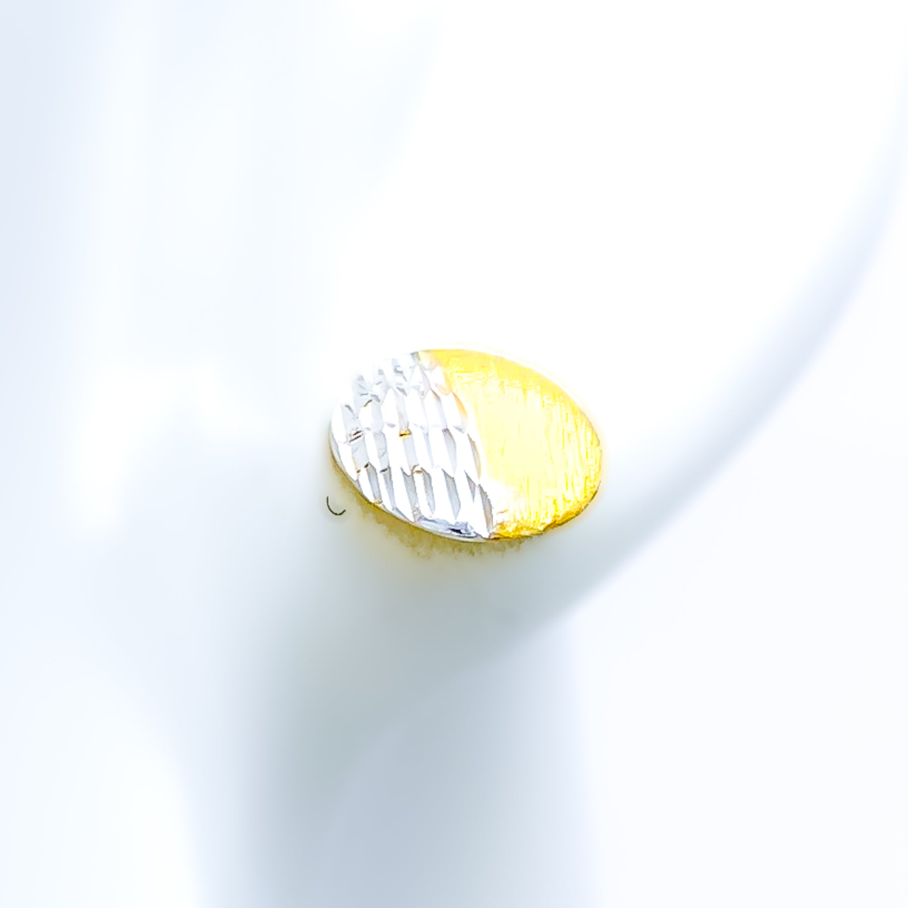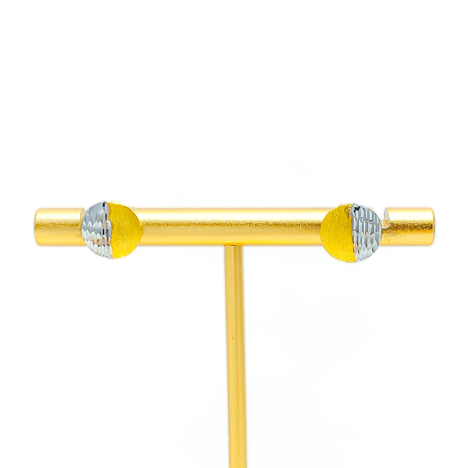 Exuding refined sophistication, these two-tone tops in 22k gold bring a perfect blend of elegance and modern style. The contrasting finishes create a subtle yet striking visual appeal. Lightweight and versatile, they transition seamlessly from daily wear to formal occasions. Finished with secure push back posts, they ensure lasting comfort and ease.