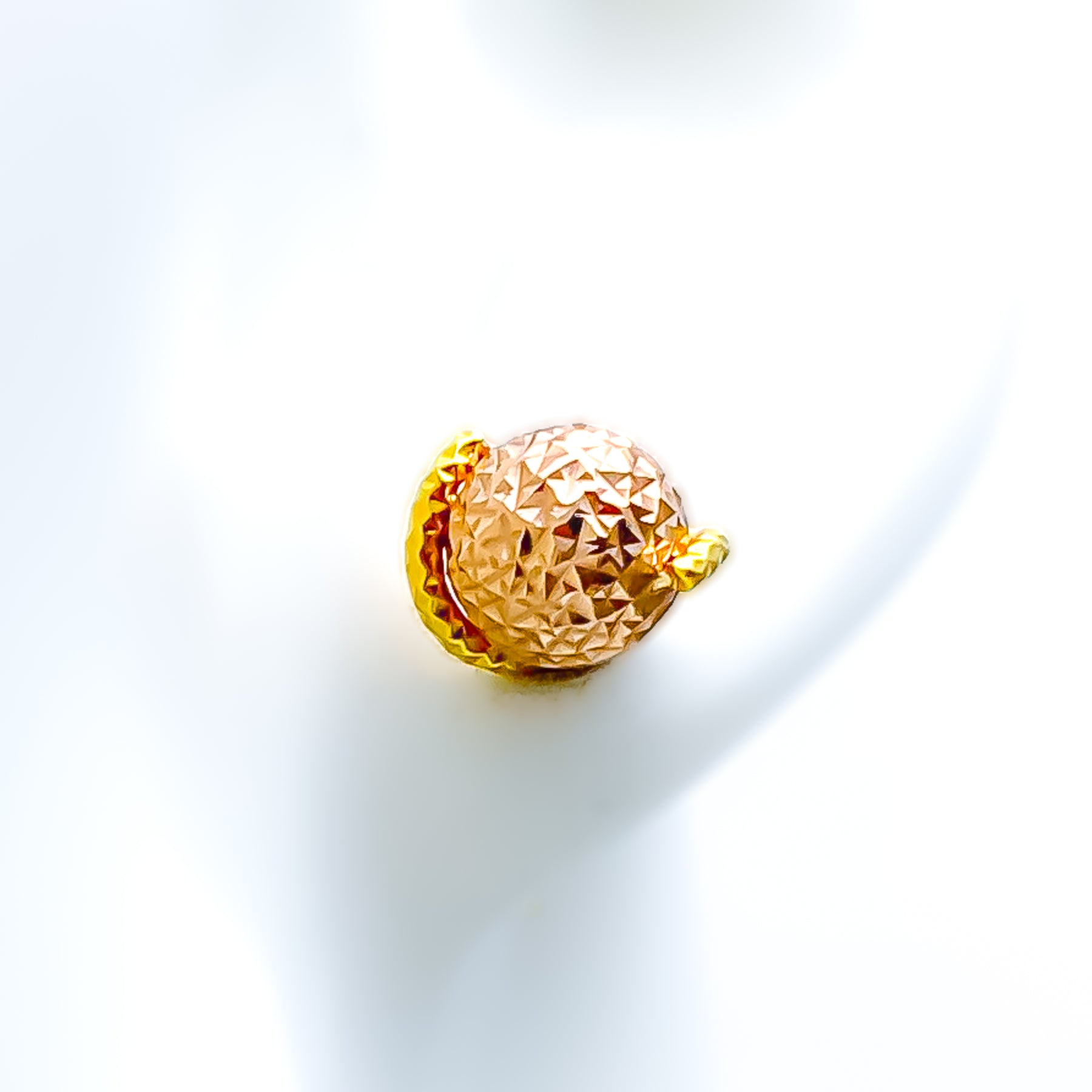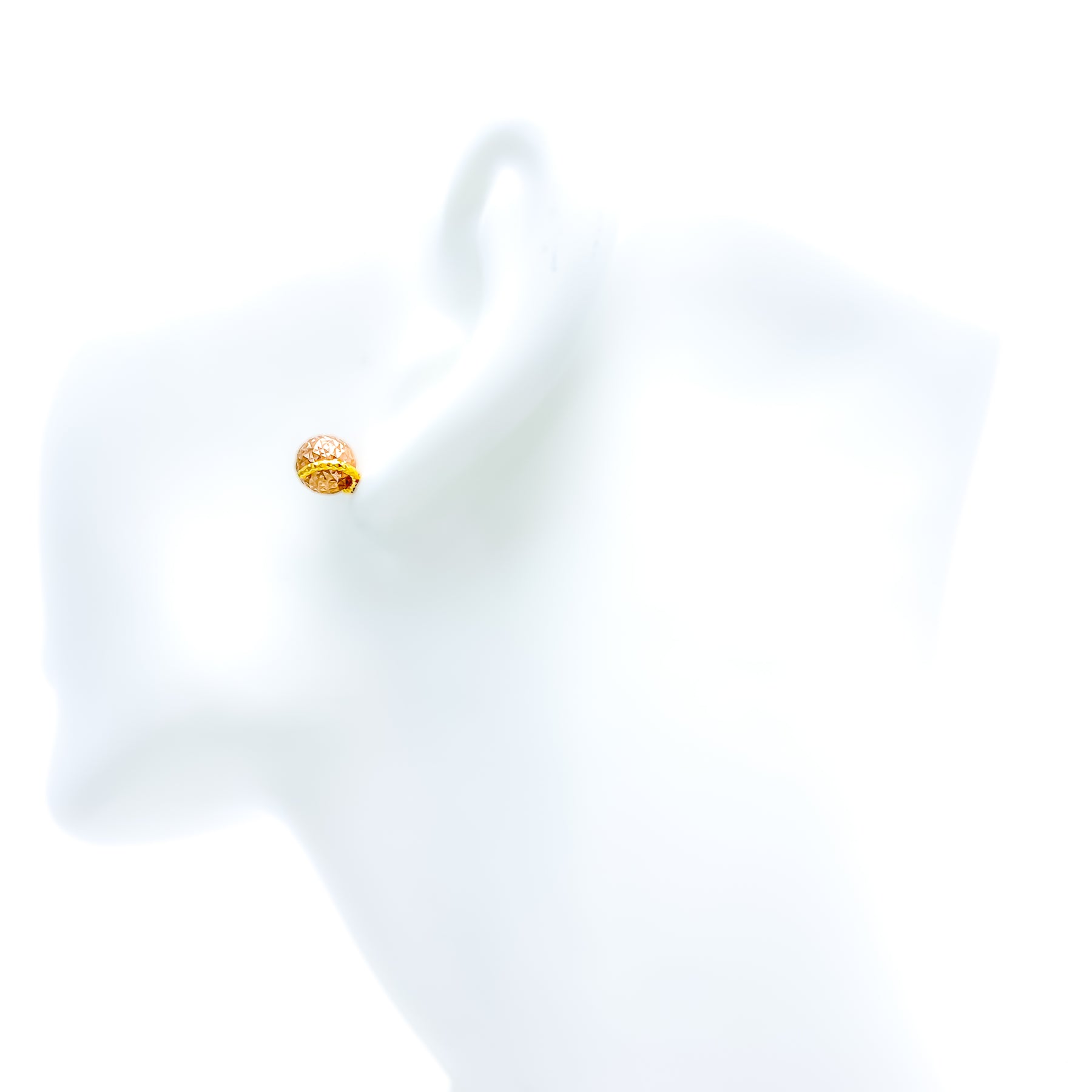 Crafted in brilliant 22k yellow gold, these 2.8-gram earrings stand out with a distinctive iridescent glow across their 0.4-inch diameter. Designed with classic push backs, they ensure secure and stylish wear. A bold yet elegant choice for adding personality and polish to any refined look.