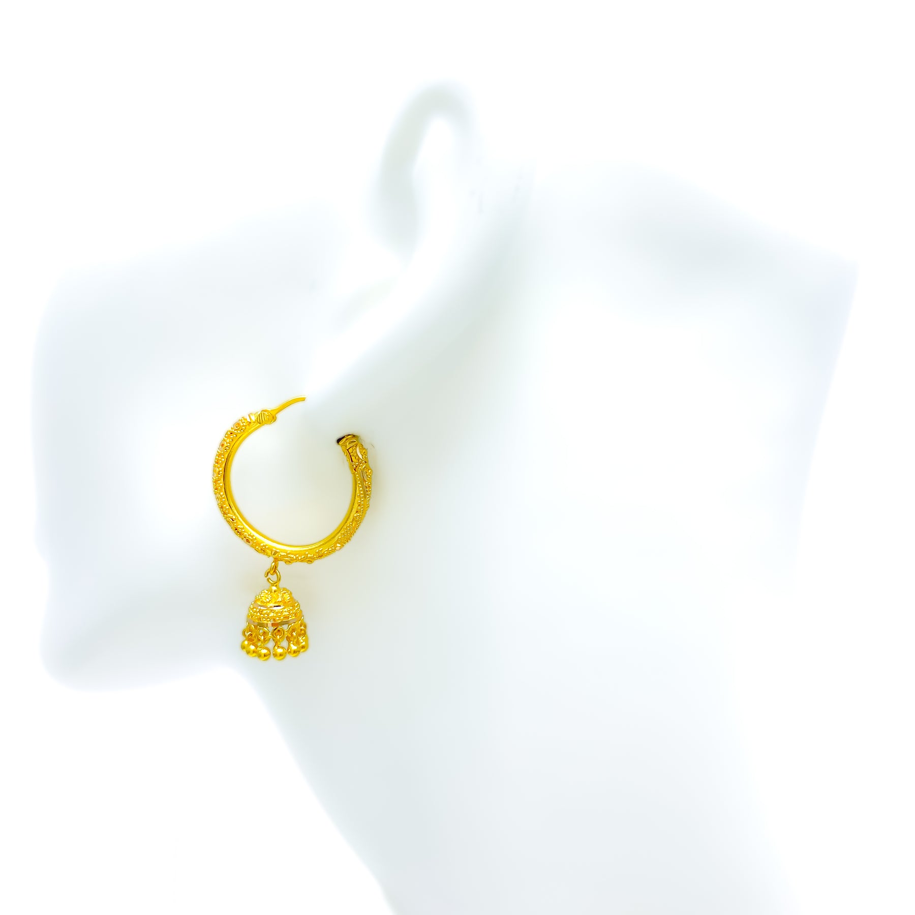 This sophisticated pair of 22k yellow gold Bali earrings, weighing 11.6 grams, features a tasteful hoop design that radiates exclusive charm. The polished finish enhances their golden brilliance, creating a refined glow. With a 1" diameter, they balance subtlety and elegance with ease. A timeless accessory that elevates both everyday style and festive attire with graceful sophistication.