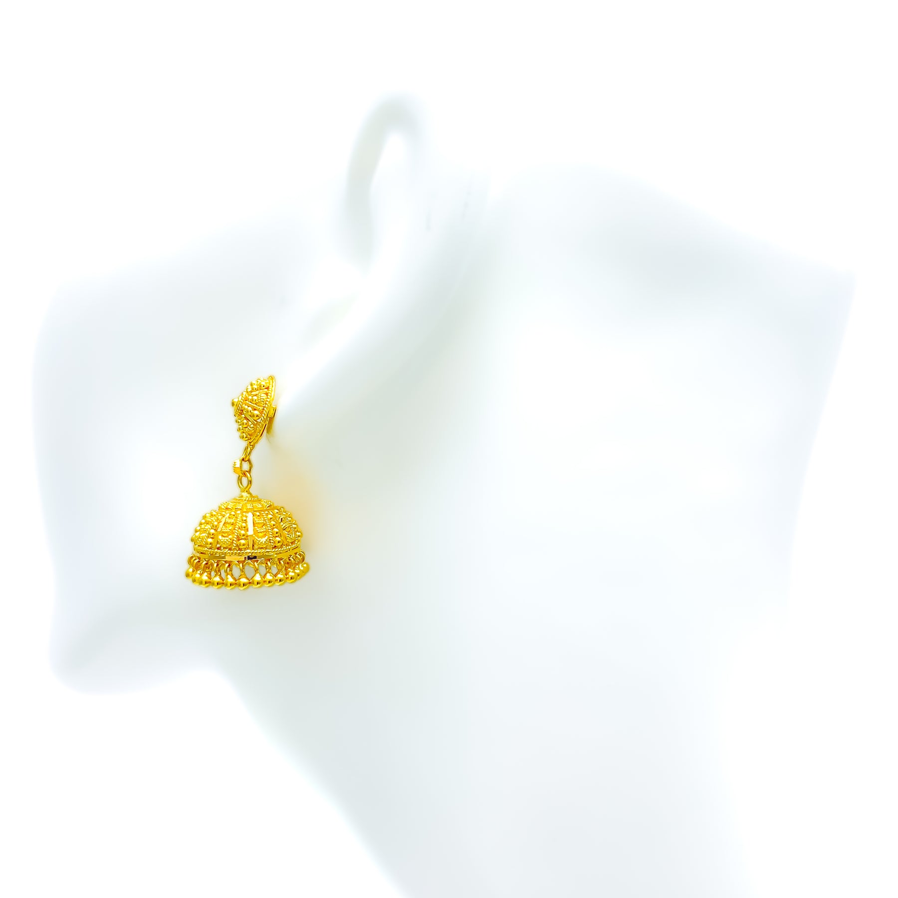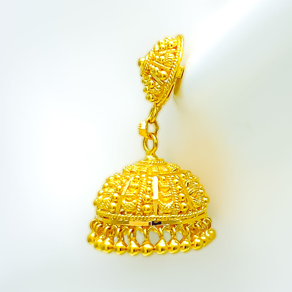 Gracefully layered with graduating beads and floral accents, these 22k yellow gold Jhumki earrings exude delicate sophistication. Weighing 12.8 grams with a 1.3-inch length, they present a balanced blend of structure and movement. The floral elements enhance their traditional charm with a soft, ornamental flair. Secured with a screw back, they’re ideal for festive wear with timeless elegance.