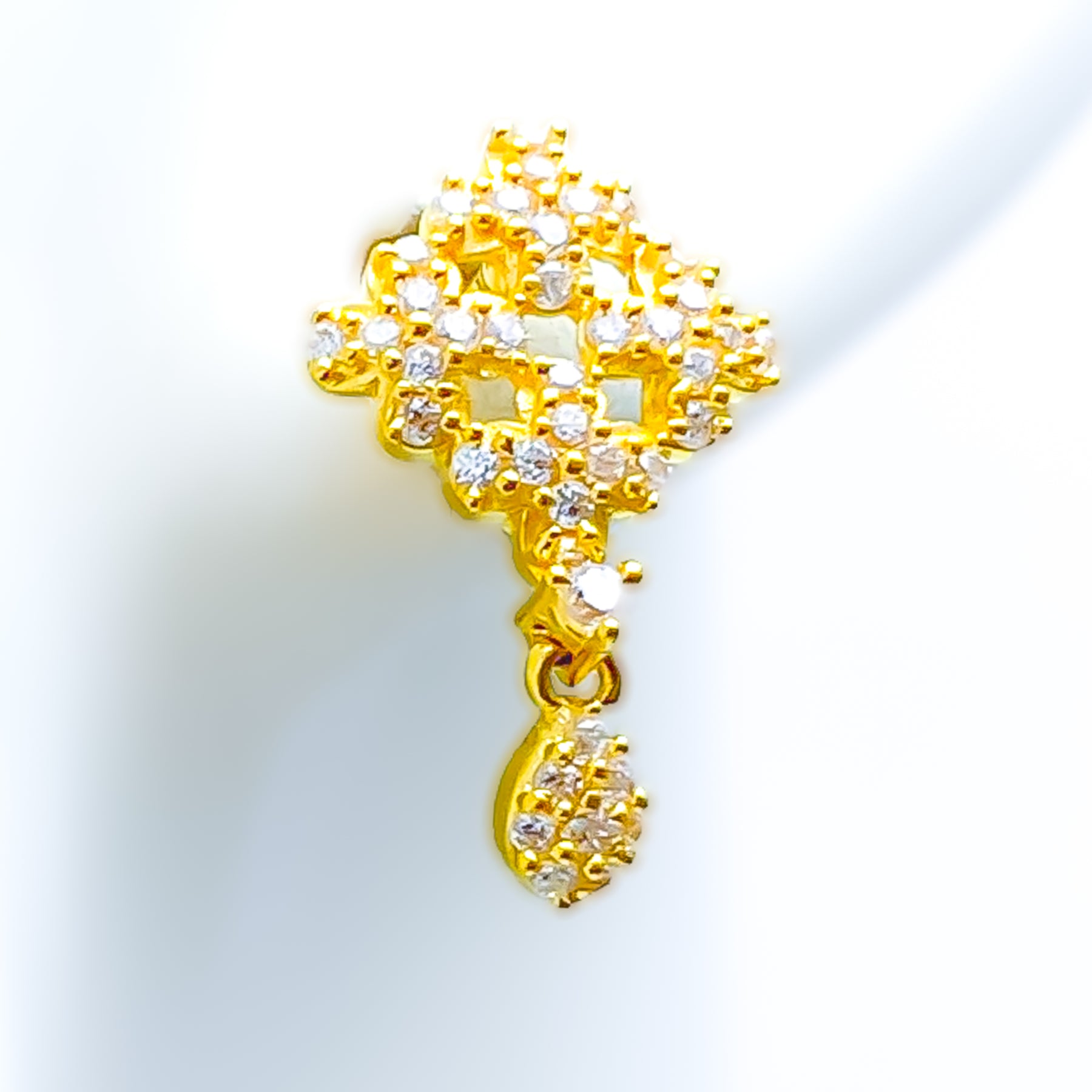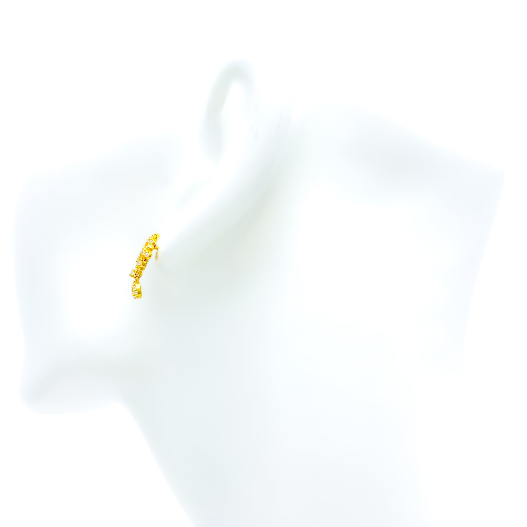 Delicately radiant, these 22k gold earrings weigh 3.5 grams and feature sparkling CZ stones set in an elegant, lightweight design. Measuring 0.75 inches with secure screw-back posts, they provide effortless comfort without compromising on brilliance. The luminous yellow gold finish enhances their refined charm, making them an ideal choice for both everyday sophistication and understated glamour. Perfect for those who favor graceful sparkle in a light, wearable silhouette, these earrings deliver timeless beauty with modern ease.