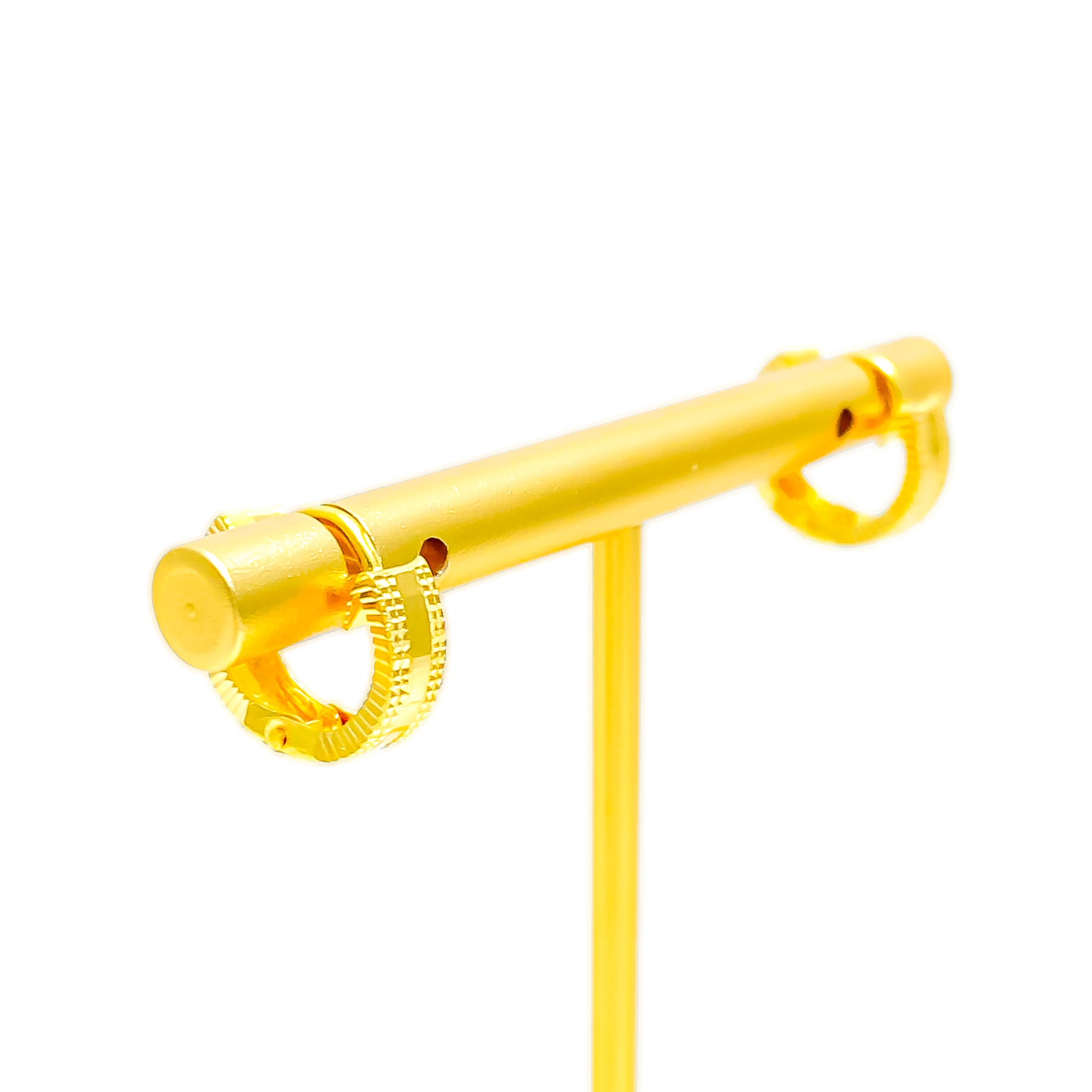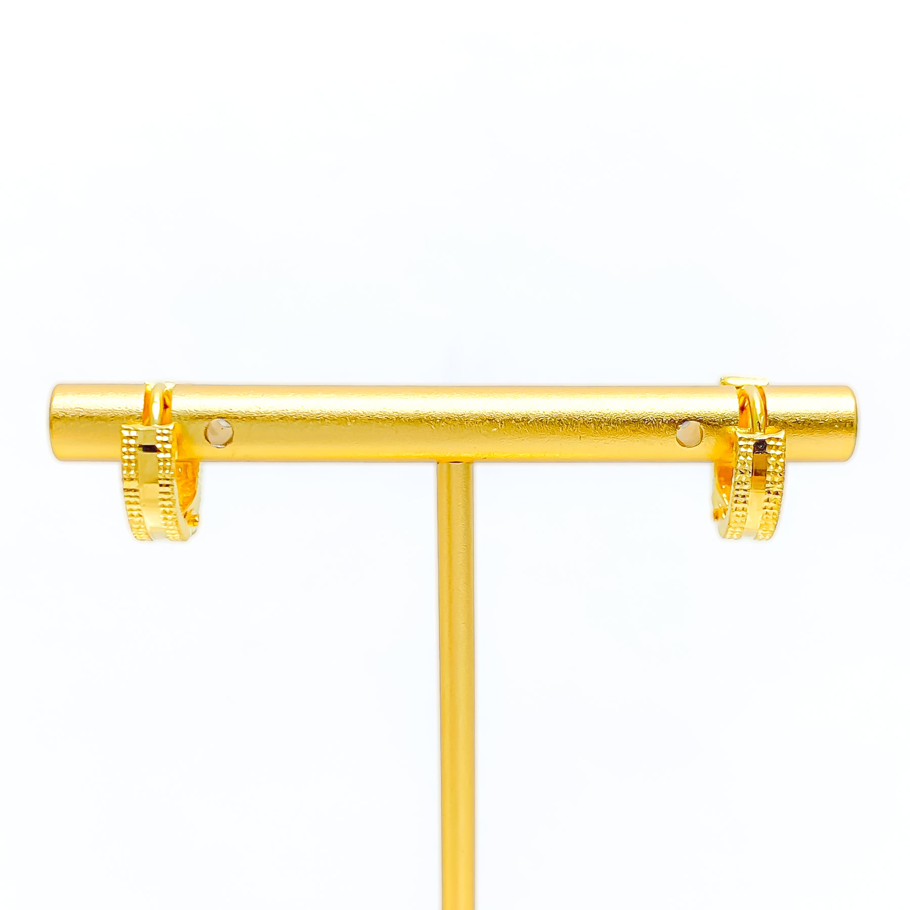 Lustrous and compact, these 22k yellow gold earrings weigh 1.9 grams and exude richness through their radiant finish and classic Bali-style hoop design. Measuring 0.5 inches in length, they feature a secure clip lock for easy, comfortable wear. Their opulent glow and timeless silhouette make them a beautiful everyday luxury, perfect for enhancing both traditional and modern looks with subtle elegance.