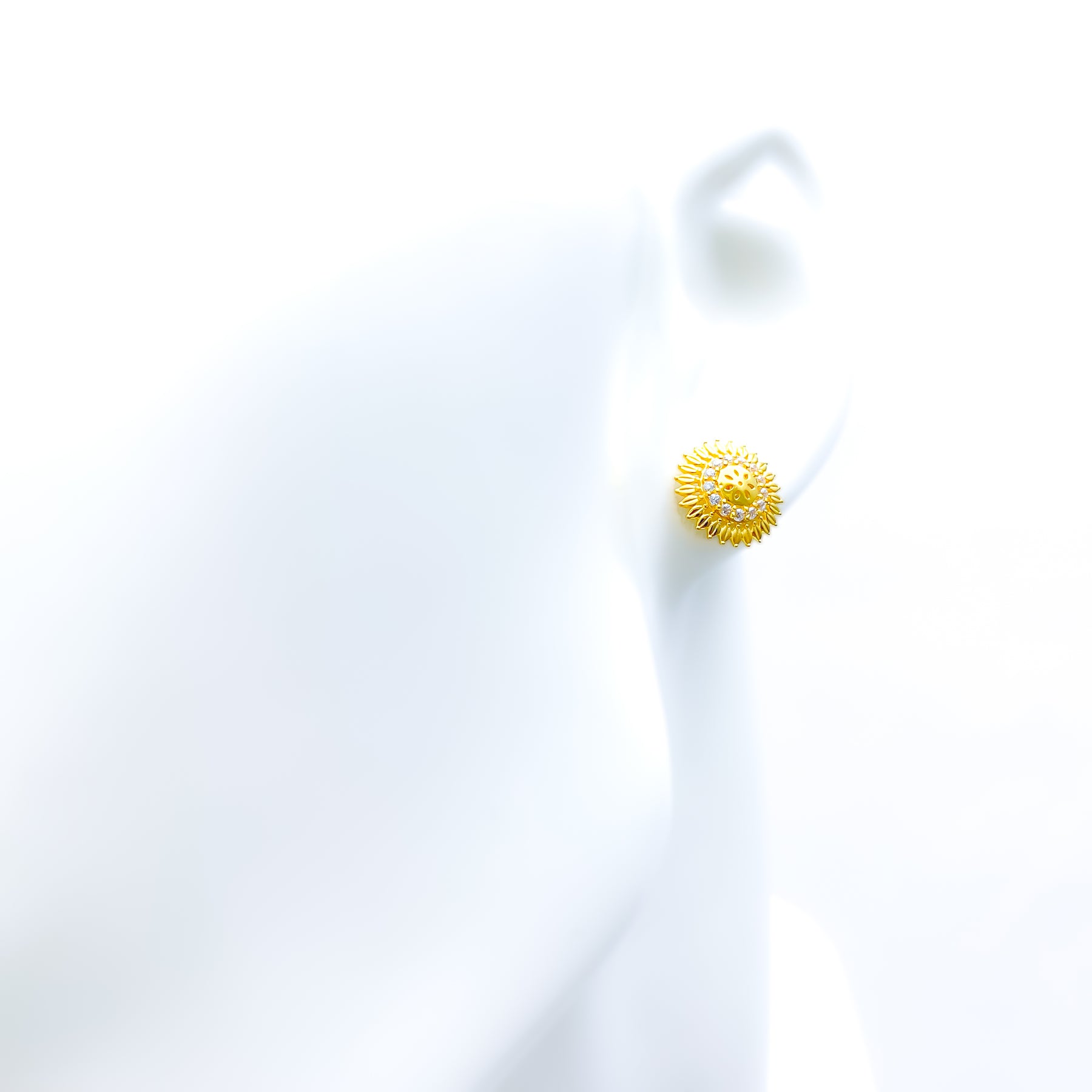 Graceful and regal, these 22k yellow gold earrings weigh 3.2 grams and feature a delicate 0.5" diameter adorned with soft blush-toned cubic zirconia for a refined pop of color. The screw-back posts ensure a secure and comfortable fit, making them ideal for both daywear and festive occasions. With their palatial charm and subtle elegance, these tops bring a graceful warmth to any jewelry collection.