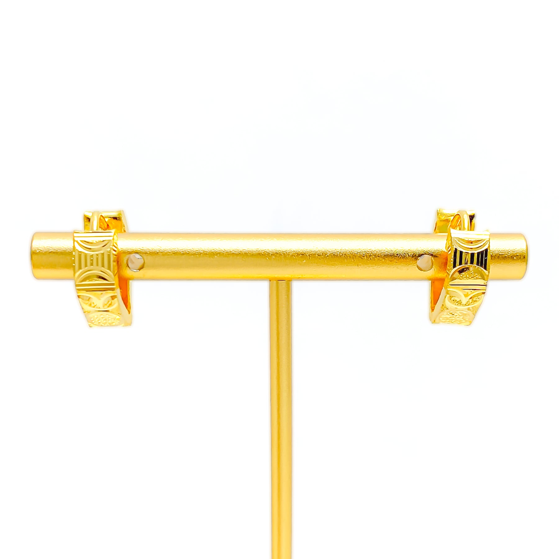 Polished and refined, these 22k yellow gold earrings weigh 2.9 grams and feature a chic striped texture that adds depth and dimension to their classic hoop silhouette. Measuring 0.6 inches in length, they’re designed in a traditional Bali style and secured with a reliable clip lock for comfortable all-day wear. Perfect for adding a subtle touch of elegance to both everyday and festive outfits, these earrings blend timeless charm with a sleek golden finish.