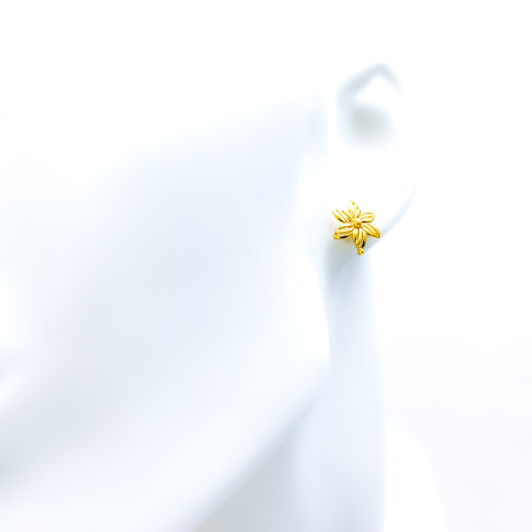 Shimmering with charm, these finely crafted 22k yellow gold earrings radiate floral beauty and everyday polish. Weighing 2.3 grams with a 0.5" silhouette, they combine delicate detail with a rich glow. Designed with secure screw-back posts for lasting comfort and refined allure.