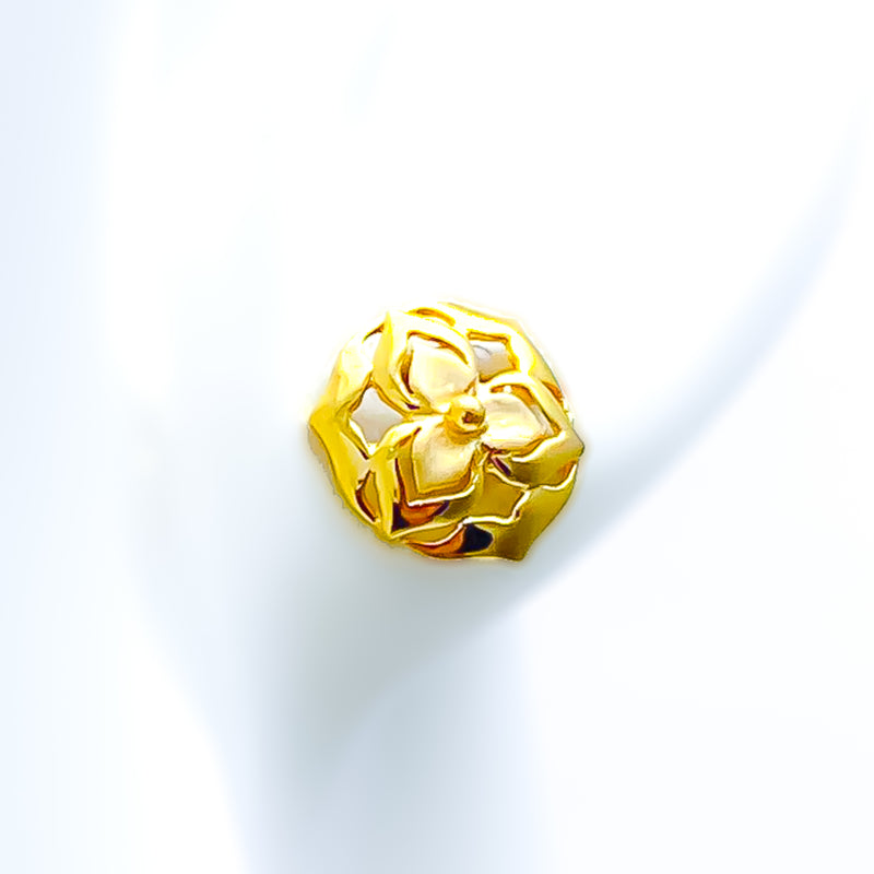 Stylishly petite yet captivating, these 22k gold floral top earrings boast a chic, detailed motif that adds a modern flourish to any ensemble. Weighing 1.5 grams and finished in radiant yellow gold, their 0.3" length and secure screw-back post offer effortless elegance and daily wearability.