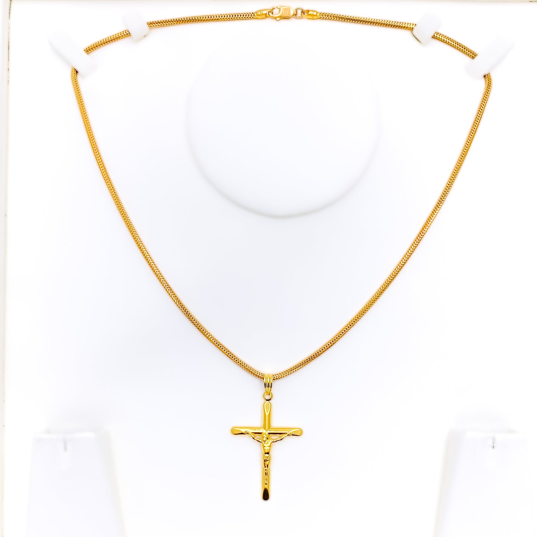 This striking pendant is meticulously crafted from luminous 22k yellow gold, showcasing a confident and timeless design. Its polished surface radiates a rich golden glow, enhancing its visual impact. The substantial weight and clean lines offer a refined yet powerful presence. Perfect for expressing faith with both strength and elegance.