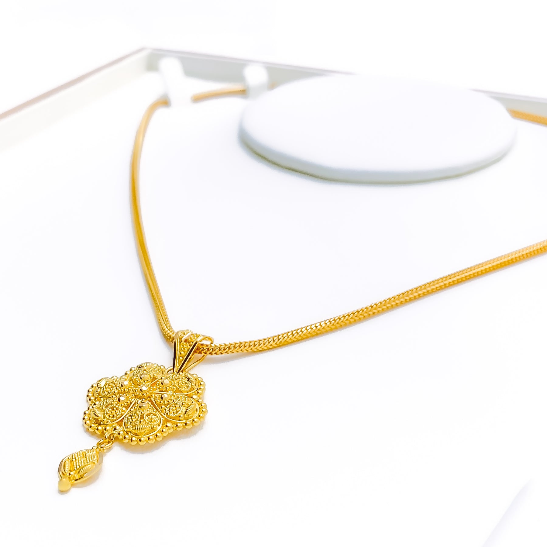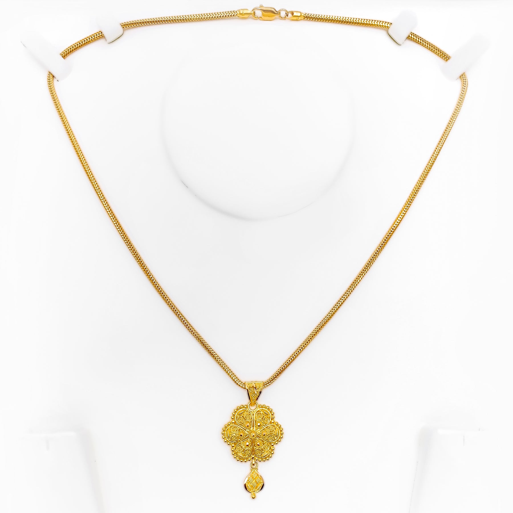 This 22k gold pendant captivates with its bold flower-inspired design, weighing 4.5 grams. The yellow gold finish enhances its intricate details, creating a stunning and elegant look. Measuring 1.75 inches in length, it is a statement piece that effortlessly complements any chain (not included). Perfect for those who appreciate timeless beauty with a bold twist, this pendant adds sophistication to any jewelry collection.