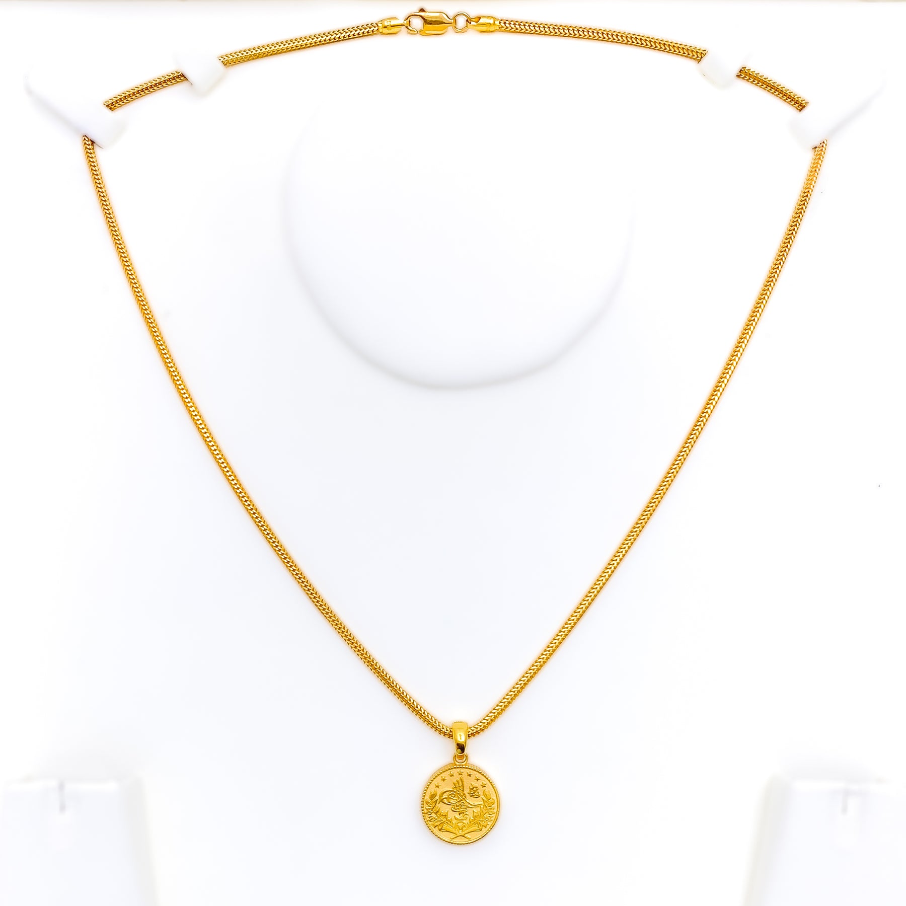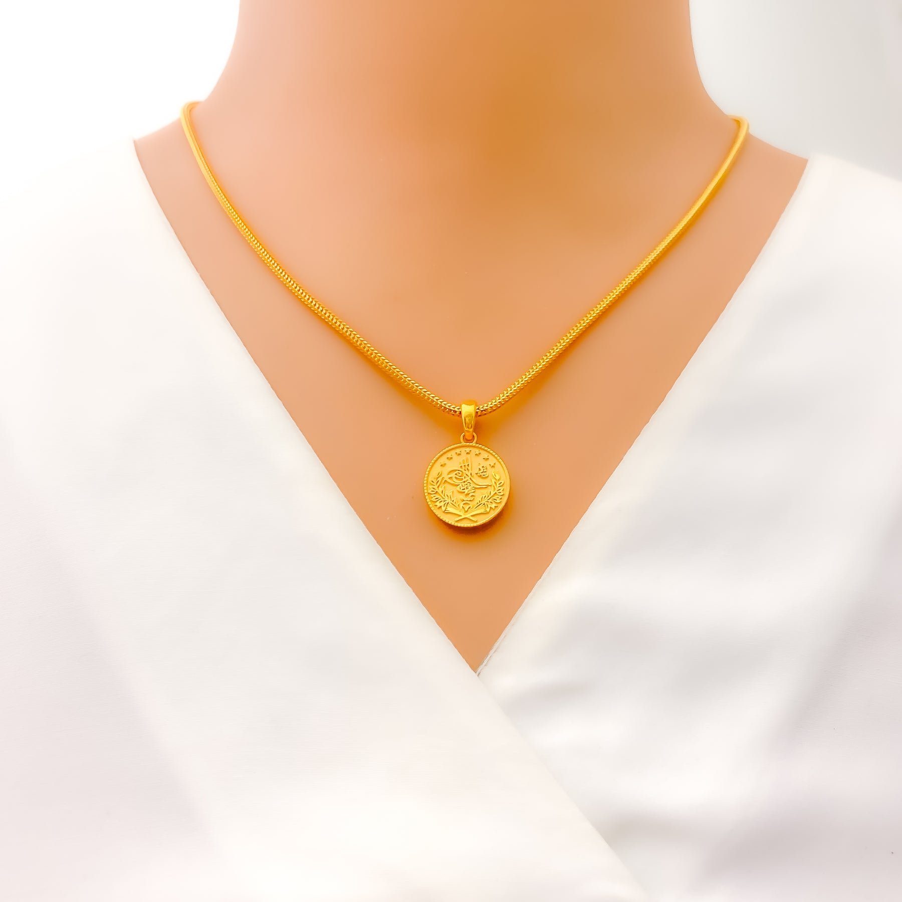 This 22k gold pendant, weighing 3.9 grams, showcases a bold yet graceful design that exudes sophistication. The yellow gold finish accentuates its elegant details, making it a striking piece for any occasion. With a compact length of 0.9 inches, this pendant offers a perfect blend of subtlety and boldness. Ideal for those who appreciate refined craftsmanship and timeless beauty, this pendant can be paired with any chain of your choice. Its graceful design and radiant gold make it a cherished addition to any jewelry collection, adding a touch of elegance to any outfit.