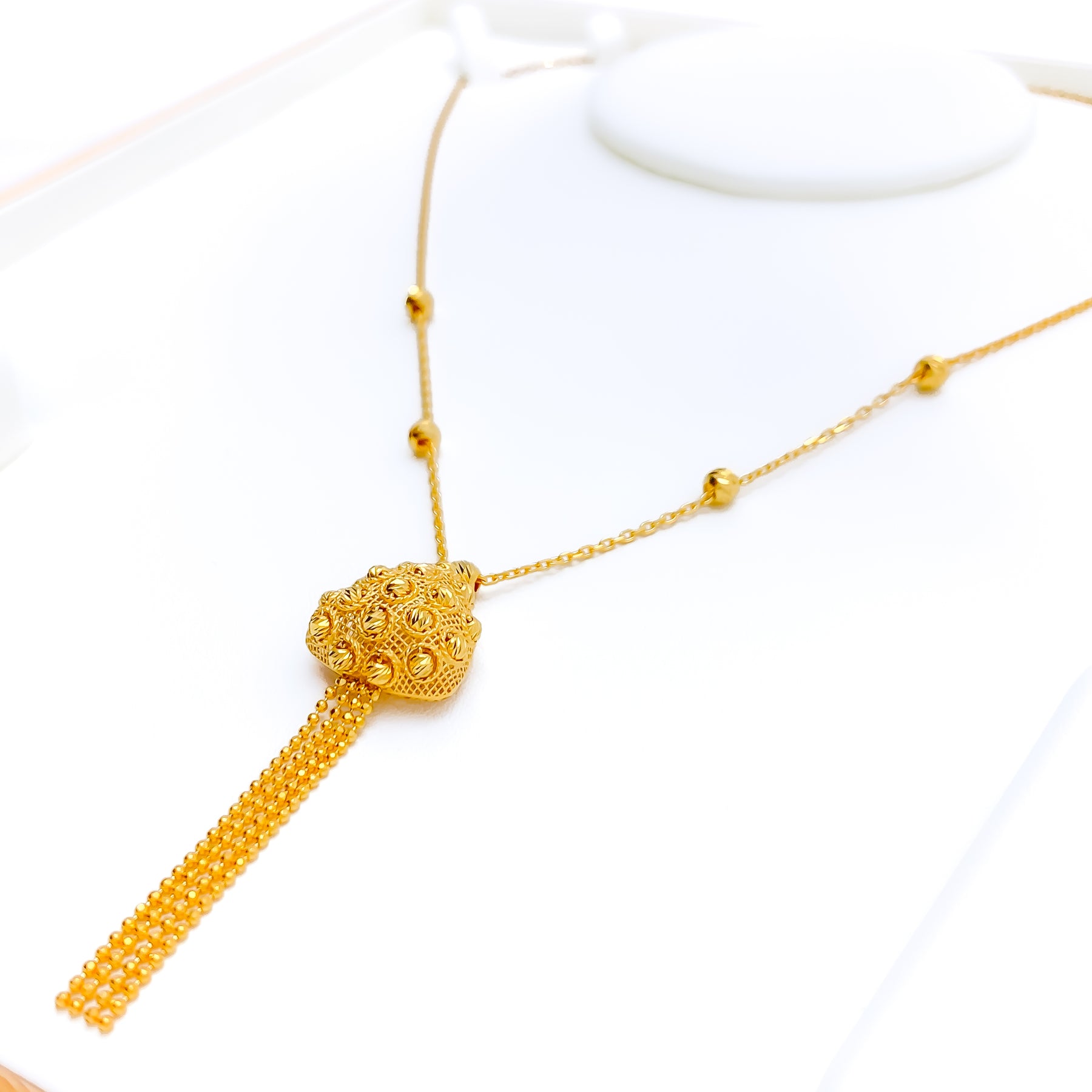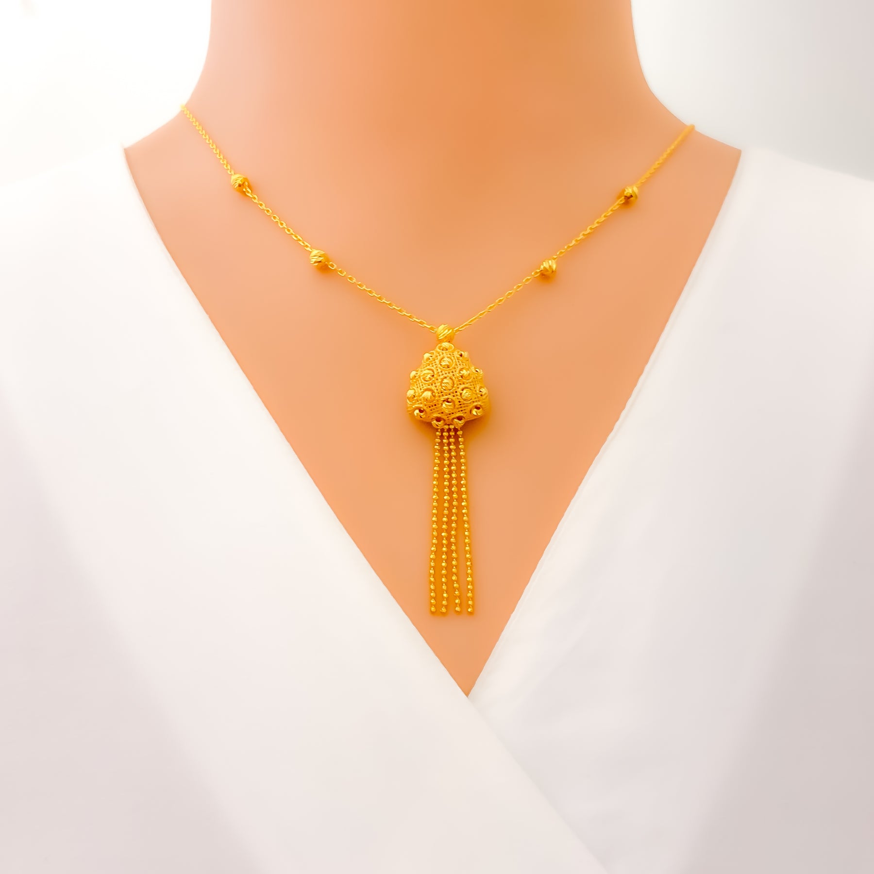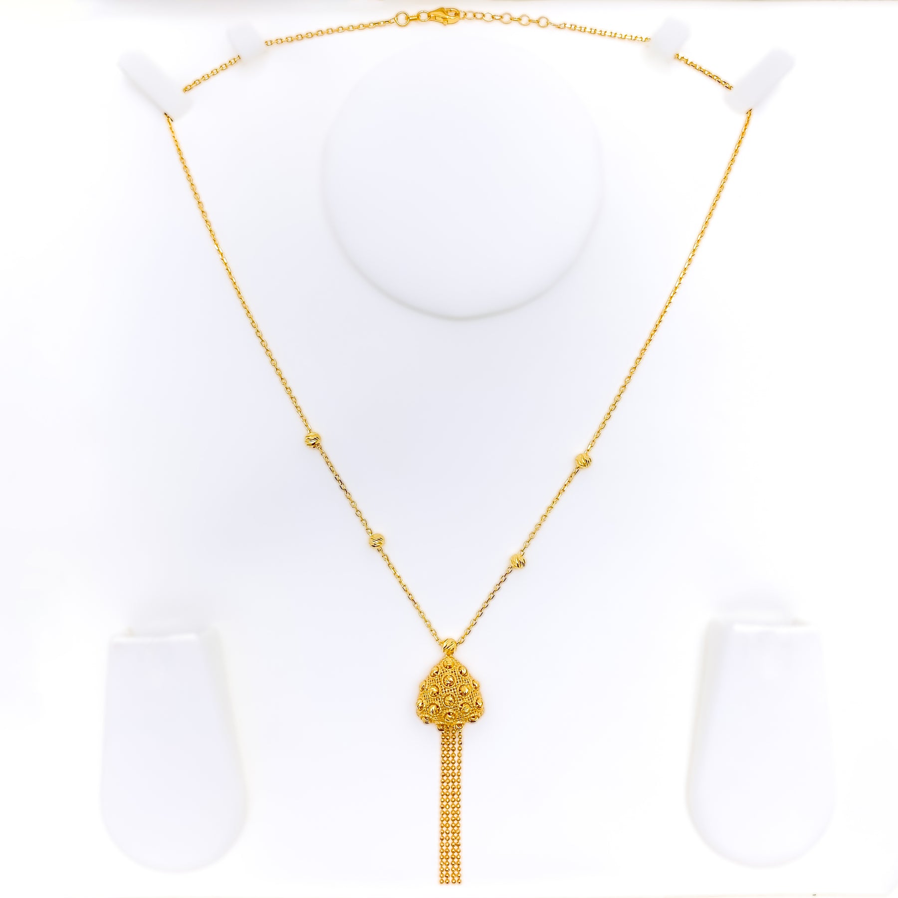 This 22k gold pendant and chain set, weighing 8.0 grams, exudes sophistication with its polished yellow gold finish. The pendant, measuring 2.25 inches in length, features an elegant dangling design that pairs seamlessly with the 18.5-inch chain. Secured with a lobster lock, this timeless set offers both style and versatility, perfect for elevating your everyday or formal attire.