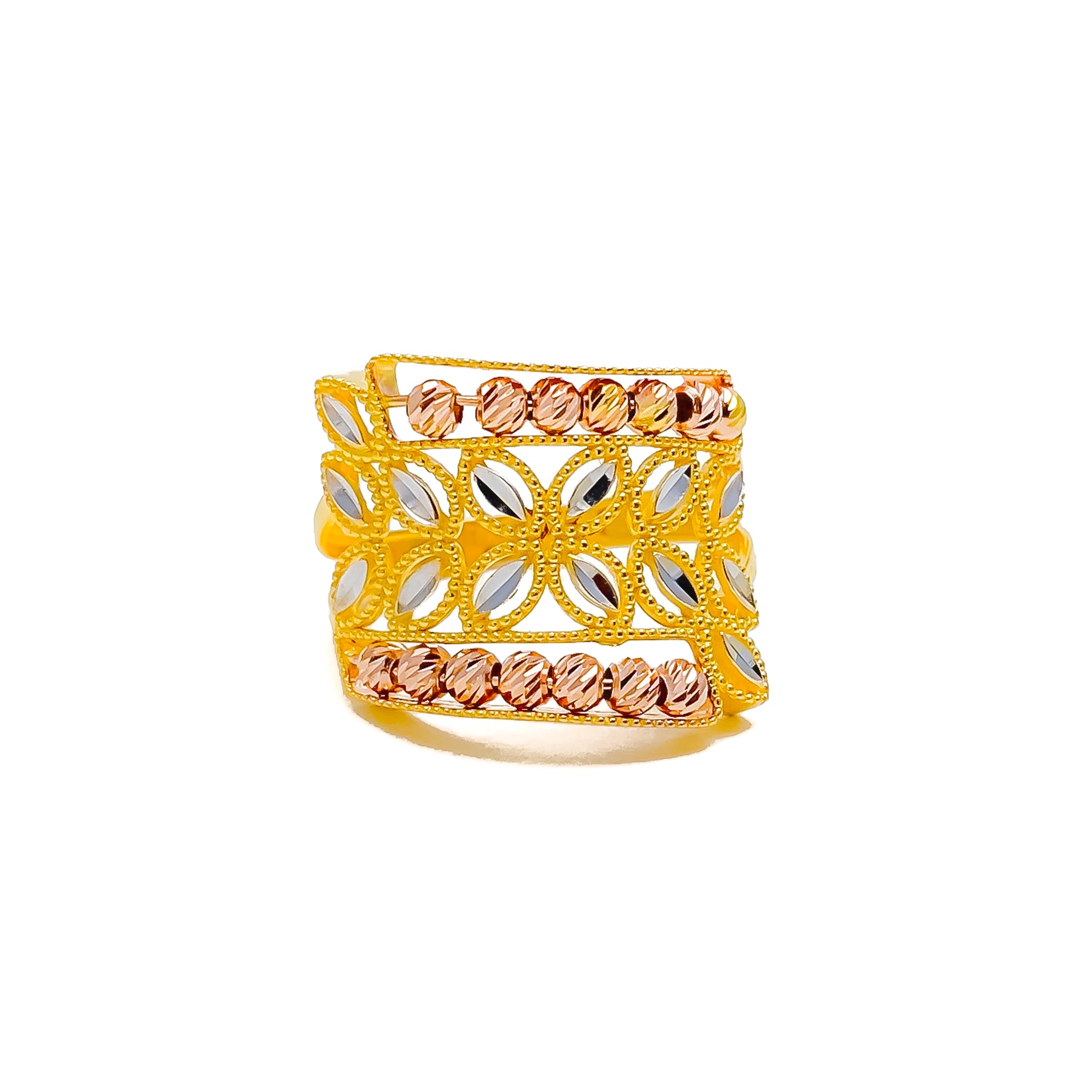 Infused with contemporary flair, this 22k yellow gold ring weighs 4.3 grams and features playful, colorful detailing that adds a fresh twist to tradition. Sized at 7.25 with resizing available, it offers both comfort and bold personality. A vibrant piece perfect for making a modern statement.