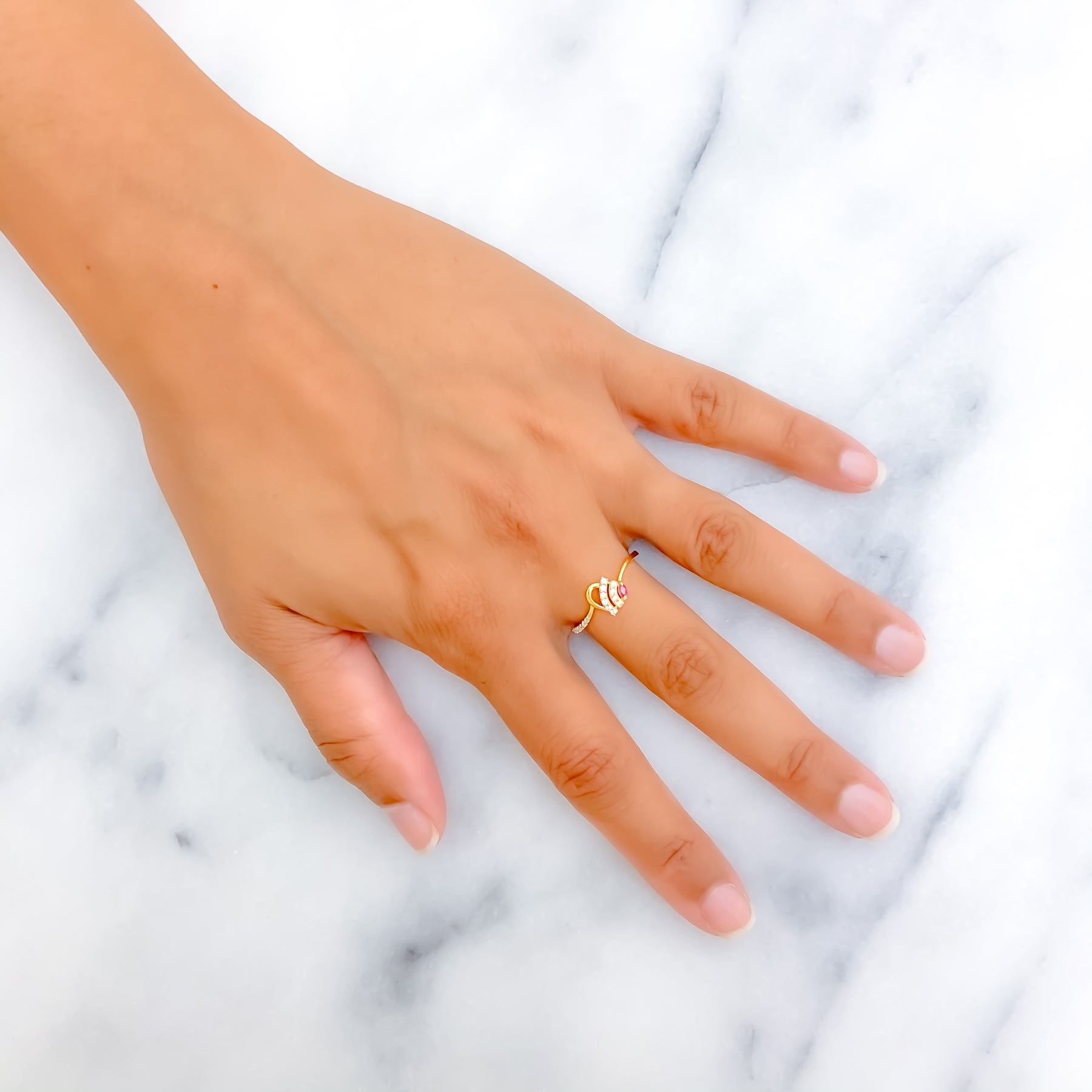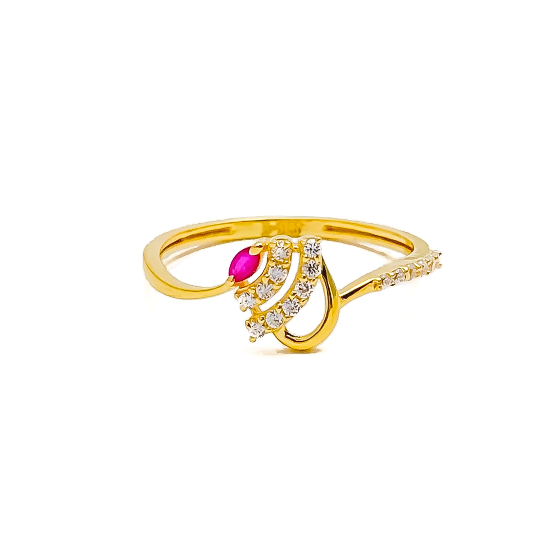 This graceful 22k yellow gold ring is enhanced with sparkling cubic zirconia, offering a refined and dressy appeal. Its elevated setting and clean silhouette make it a sophisticated choice for elegant everyday looks. Weighing just 1.5 grams, it delivers a light and comfortable fit. Ideal for stacking or wearing solo as a subtle statement piece.