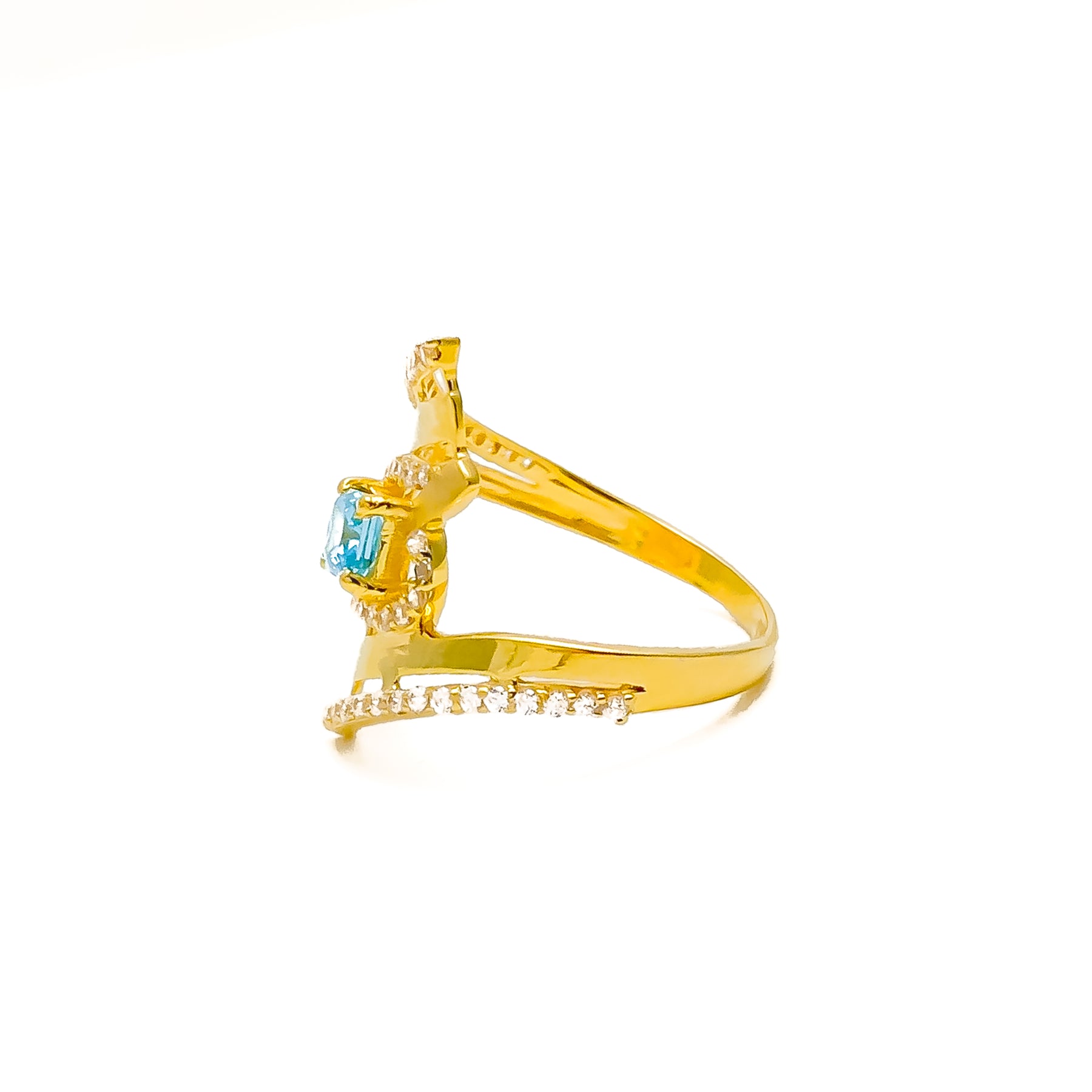 Bold yet refined, this 22k yellow gold ring features an artistic layered design accented with sparkling cubic zirconia. Weighing 3.3 grams and sized at 6.75, it strikes the perfect harmony between architectural style and wearable elegance. Ideal for elevating everyday looks or complementing modern ensembles.
