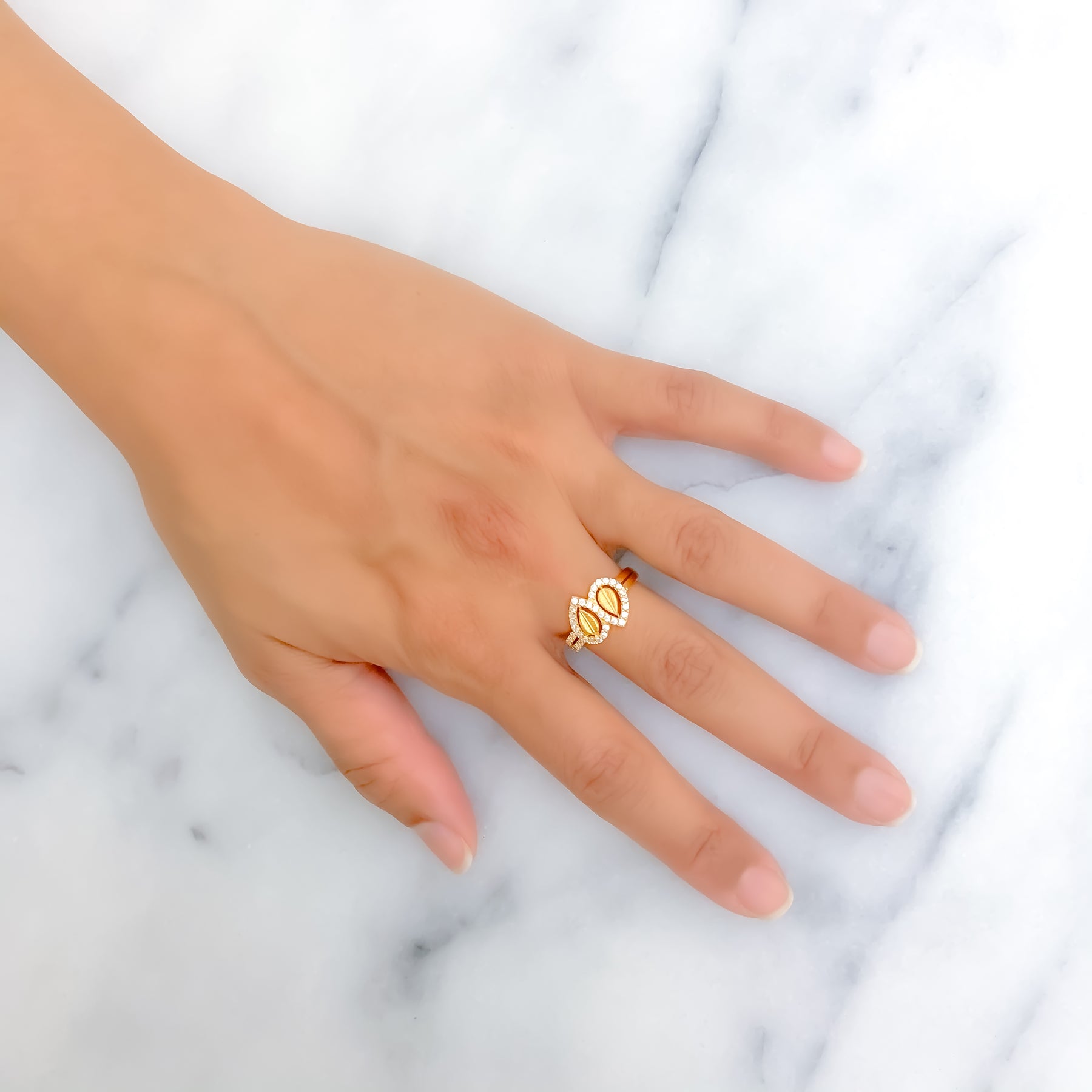 This elegant 22k gold ring, weighing 2.7 grams, showcases a fluid, flowy design accented with sparkling cubic zirconia for a radiant touch. The polished yellow gold finish enhances its sleek and contemporary appeal, creating a refined yet modern aesthetic. Designed in a size 7 with resizing options available, it ensures a perfect and customizable fit. A seamless blend of sophistication and trendiness, this ring is a must-have addition to any jewelry collection, ideal for those who appreciate graceful artistry with a chic twist.