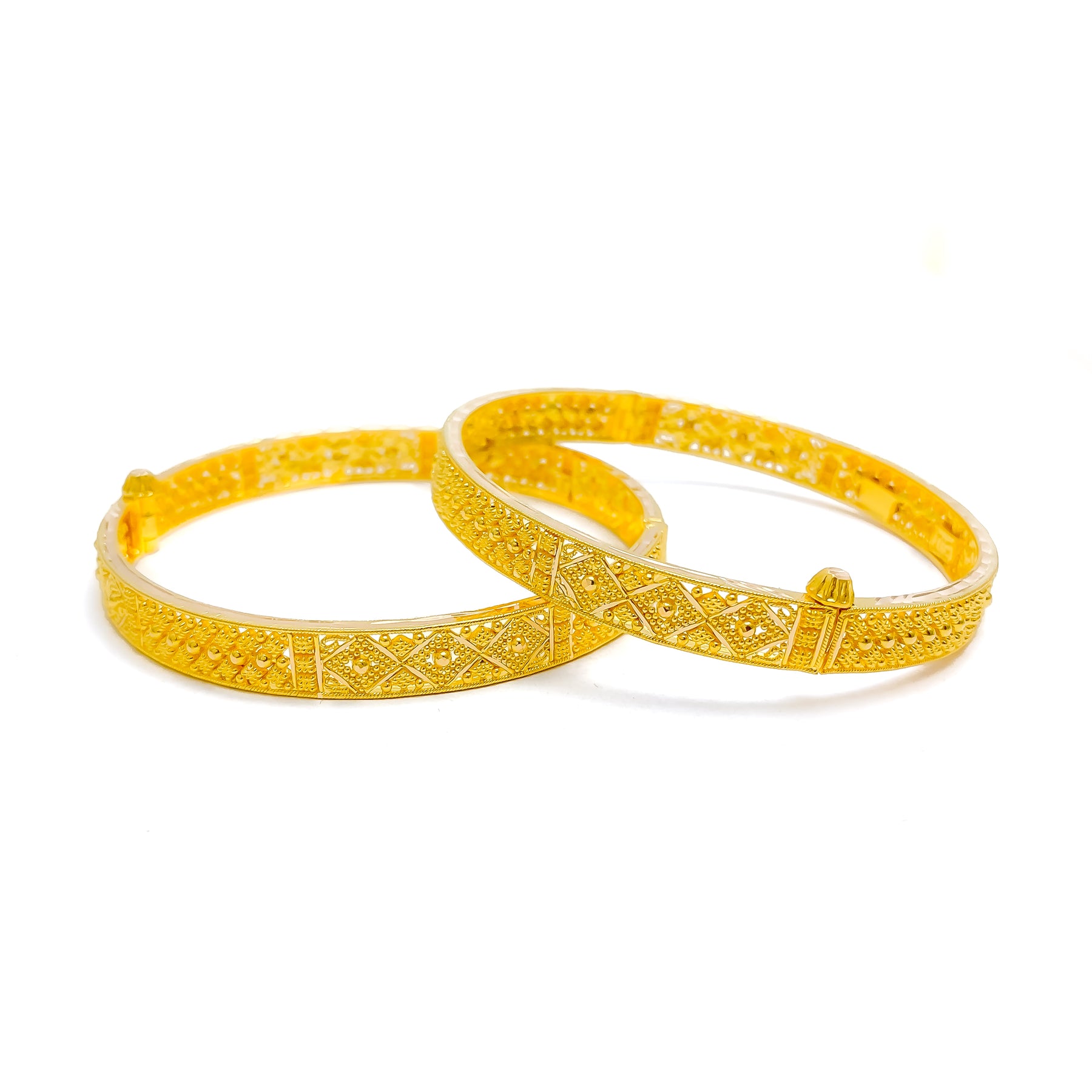 Regal in presentation, this 22k yellow gold bangle pair weighs 29.7 grams and features richly layered multi-bead detailing finished with a smooth, luminous polish. Crafted in a 2.4 size with a 2.25-inch opening diameter, the pair offers a balanced, comfortable fit that sits gracefully on the wrist. The openable construction includes a secure screw mechanism paired with a hinge, ensuring ease of wear while maintaining refined structure. Bold yet timeless, this two-bangle set delivers classic elegance ideal for festive occasions and heirloom-inspired styling.