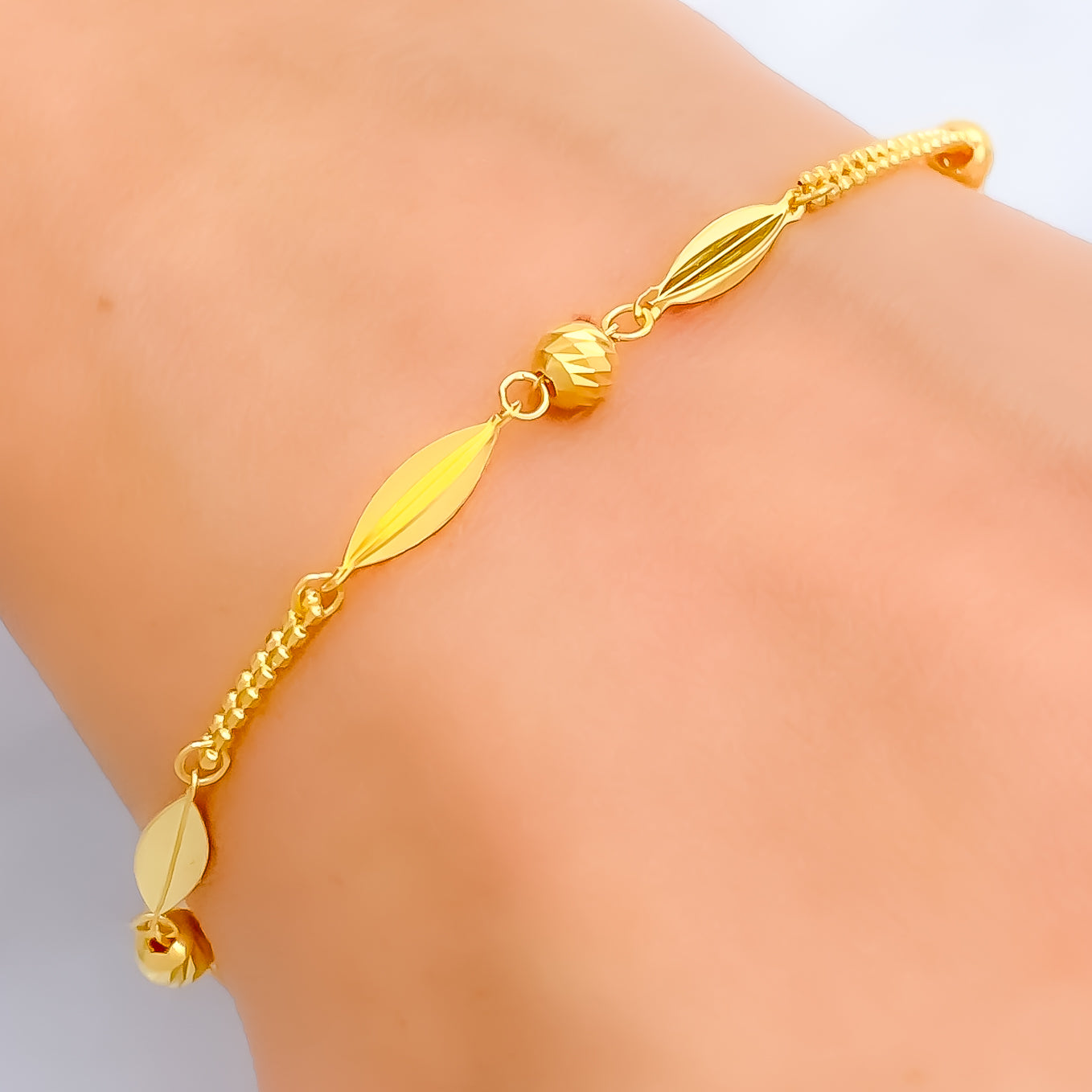 Chic 22k yellow gold bracelet weighs 3.2 grams, presenting a stylish design with radiant luminous appeal. The 7.5 inch length provides a comfortable balanced fit along the wrist. A secure lobster lock ensures dependable wear while maintaining a sleek polished finish. Its refined presence delivers timeless sophistication with graceful contemporary charm.