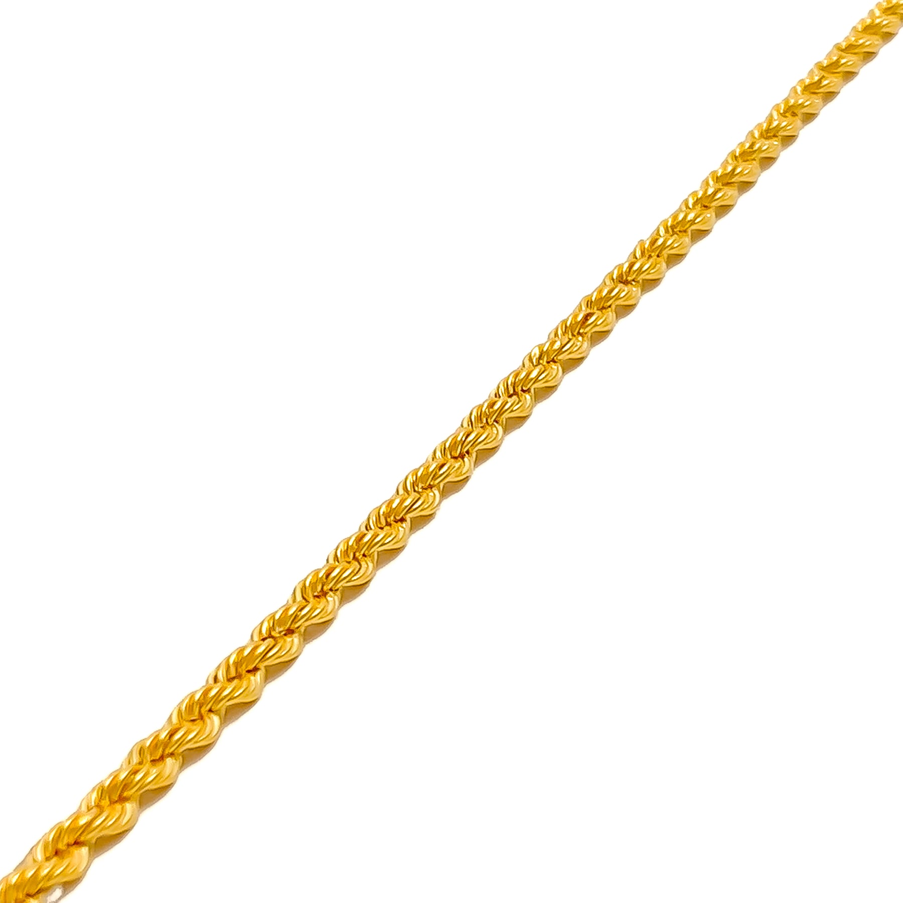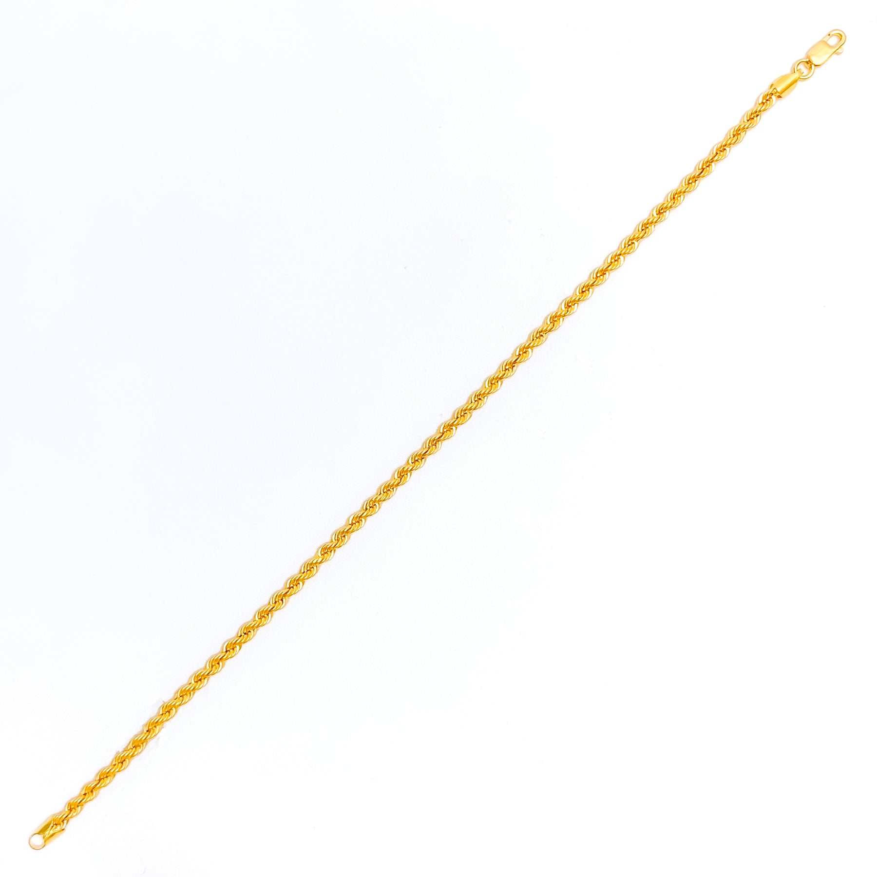 This luxurious 22k yellow gold bracelet weighs 3.6 grams, blending lightweight comfort with radiant elegance. Its 7.6-inch length provides a graceful fit, perfect for everyday sophistication or special occasions. The polished finish enhances its brilliant golden glow, elevating its timeless appeal. Fastened with a lobster lock, it offers both beauty and secure wear.