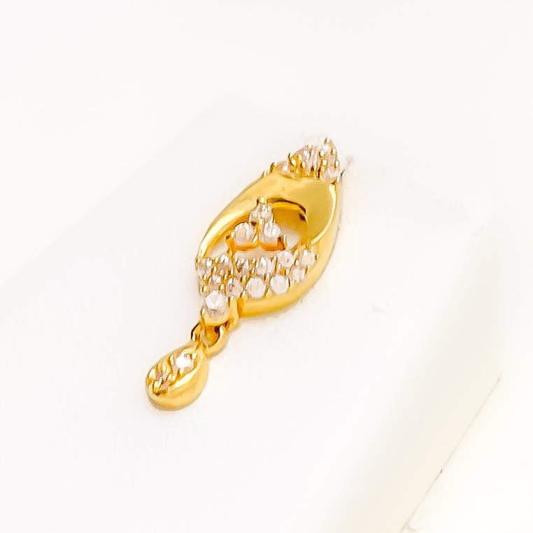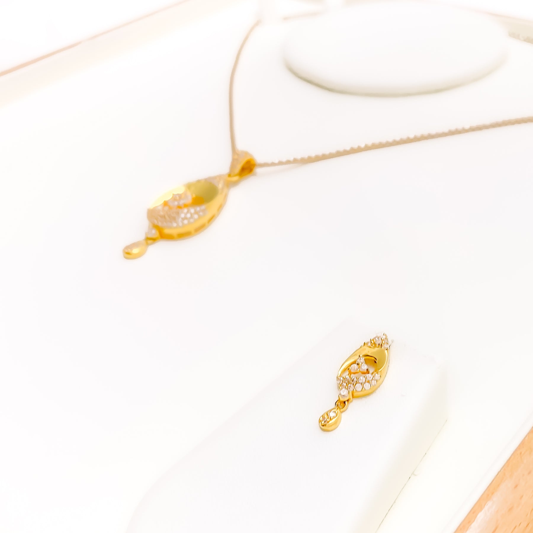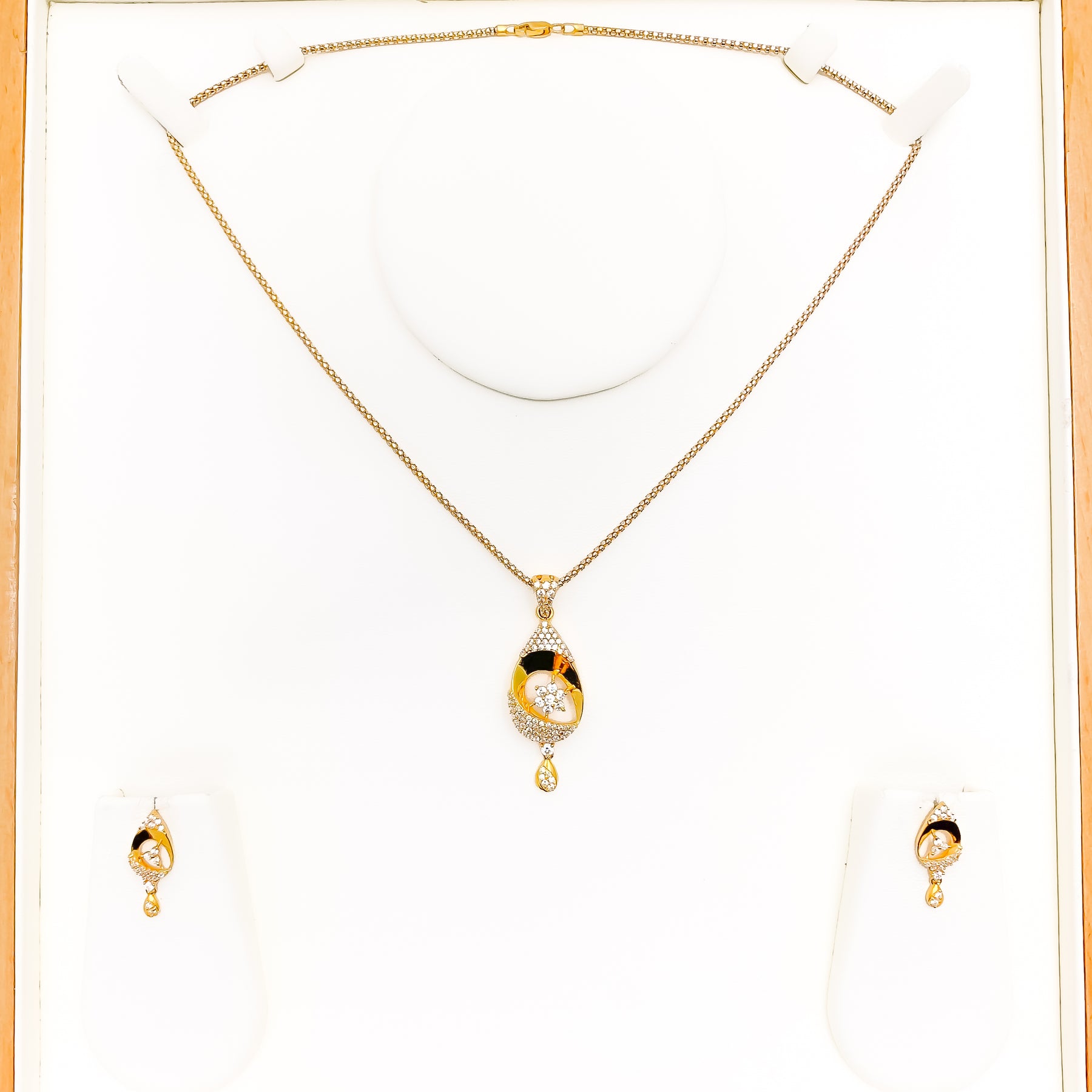 Presented with luminous allure, this 22k gold pendant set showcases an 8.1-gram profile highlighted by sparkling CZ stones that illuminate its graceful 1.75-inch centerpiece. Its warm yellow-gold finish enriches every curve with radiant depth and refined charm. The matching 0.8-inch screw-back earrings offer a harmonious blend of elegance and everyday versatility suited for many styles. This three-piece ensemble delivers a delightful touch of golden brilliance, perfect for elevating any thoughtfully curated look.