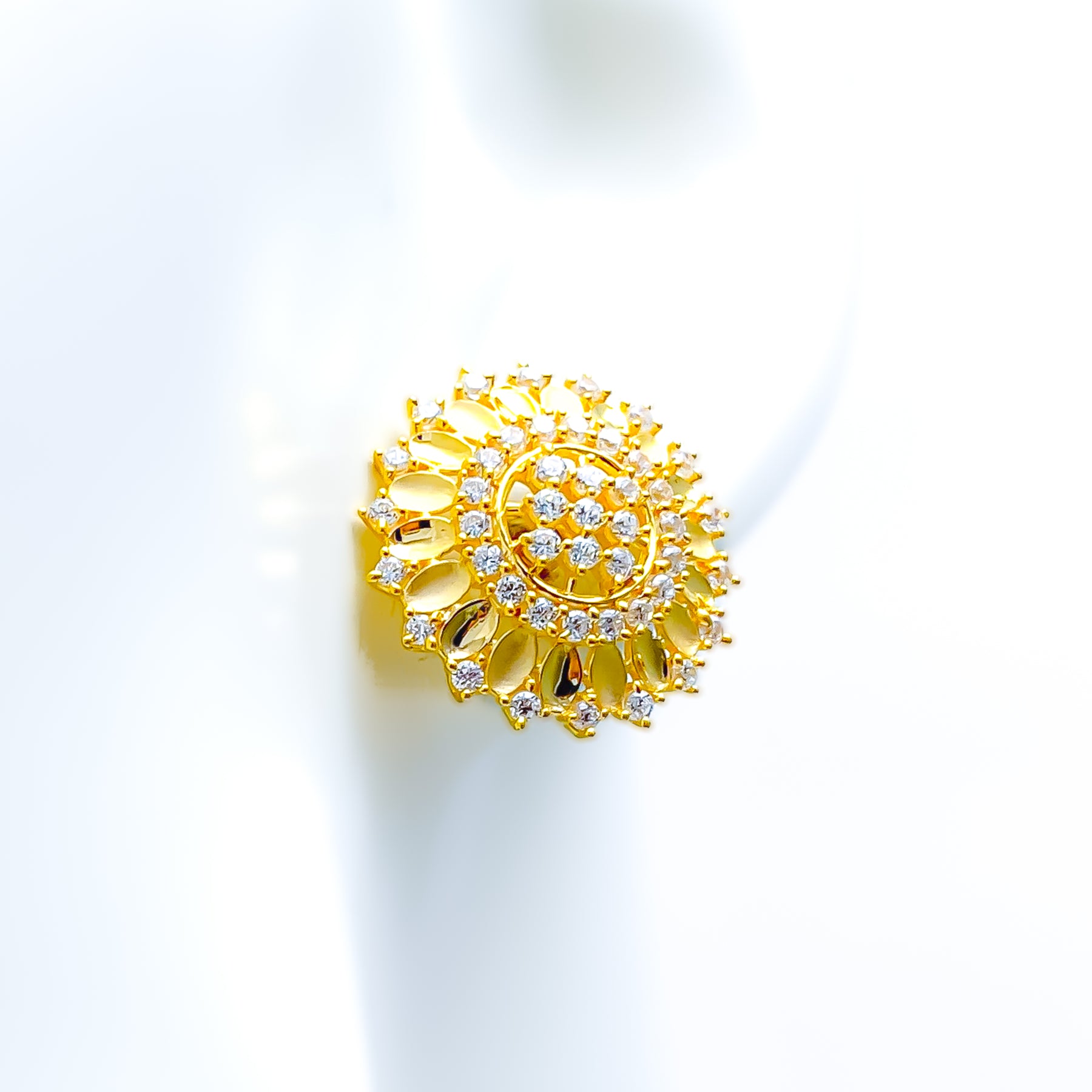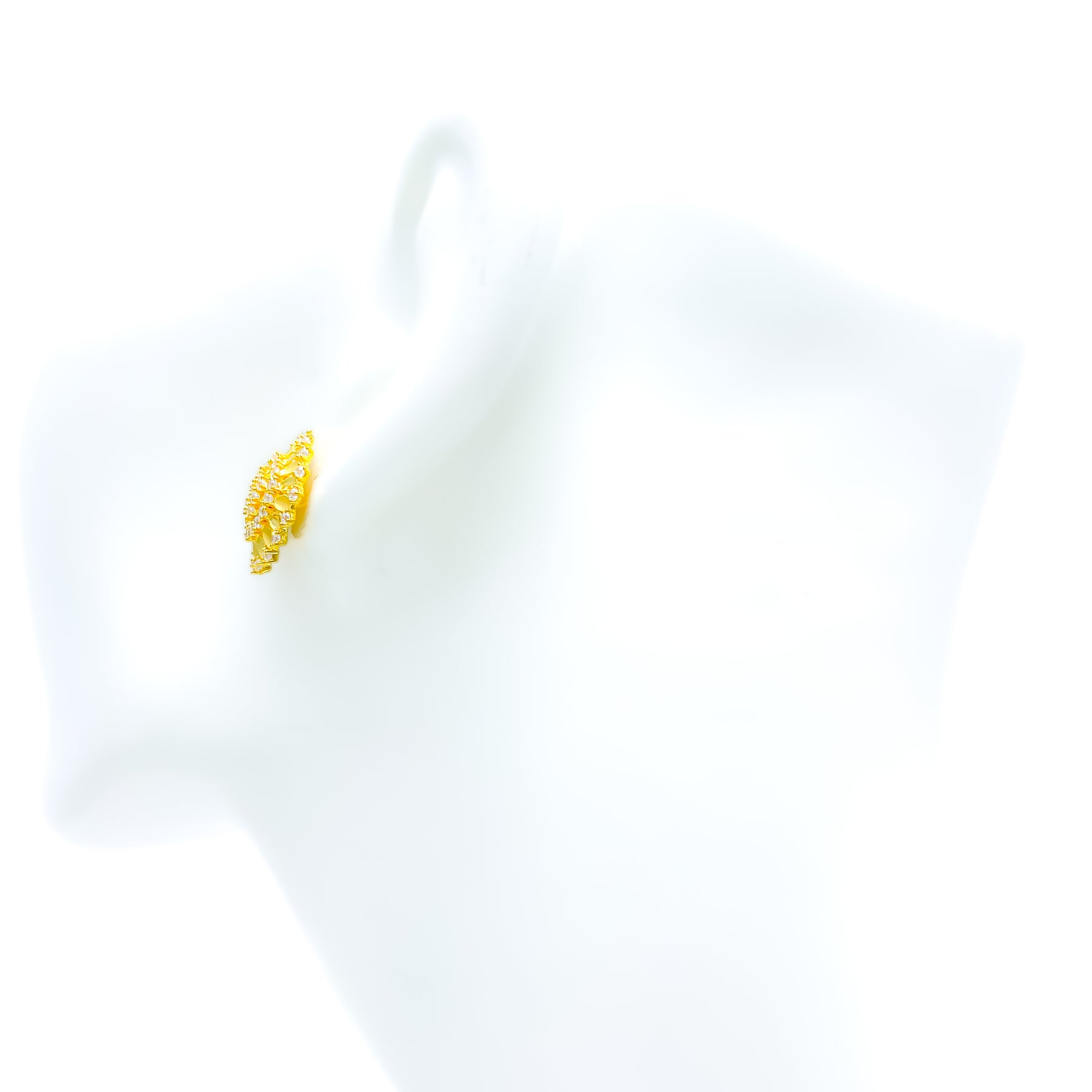 Rich in detail, these 22k yellow gold earrings weigh 8.2 grams and showcase intricate filigree craftsmanship accented with luminous cubic zirconia. Measuring 0.75" in diameter, they offer a bold yet elegant profile, secured comfortably with screw-back posts. Designed to exude refinement, these tops are perfect for special occasions, blending traditional artistry with sophisticated sparkle.