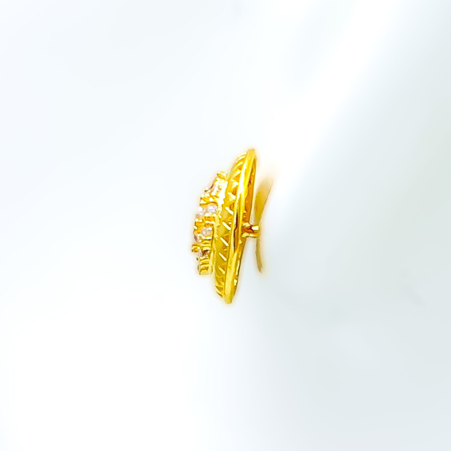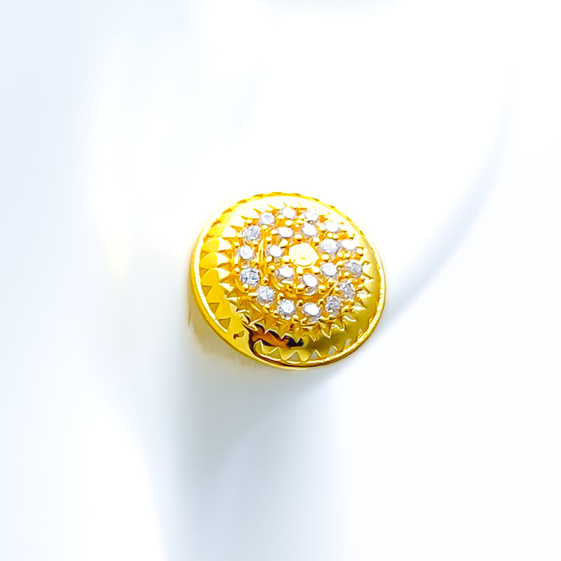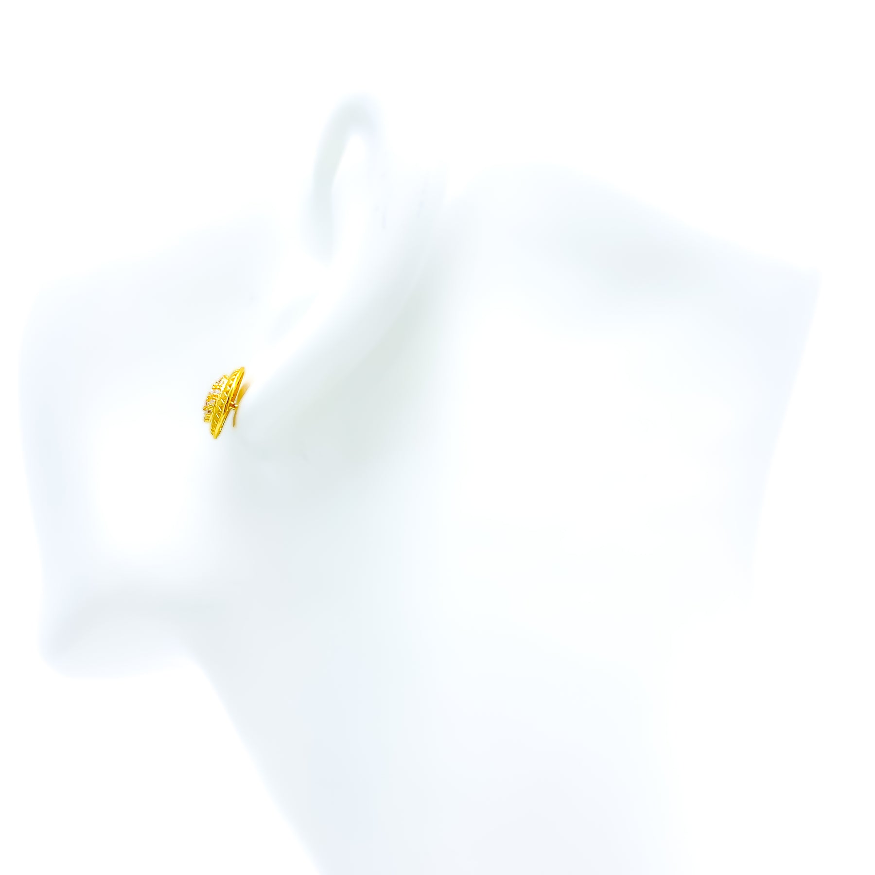 Impressively poised, these 22k yellow gold earrings weigh 3.9 grams and feature a stately design enhanced by radiant cubic zirconia. With a 0.5" diameter and reliable screw-back posts, they provide both elegance and ease for all-day wear. Blending regal style with refined shimmer, these tops are a distinguished addition to any collection—ideal for both traditional charm and contemporary grace.