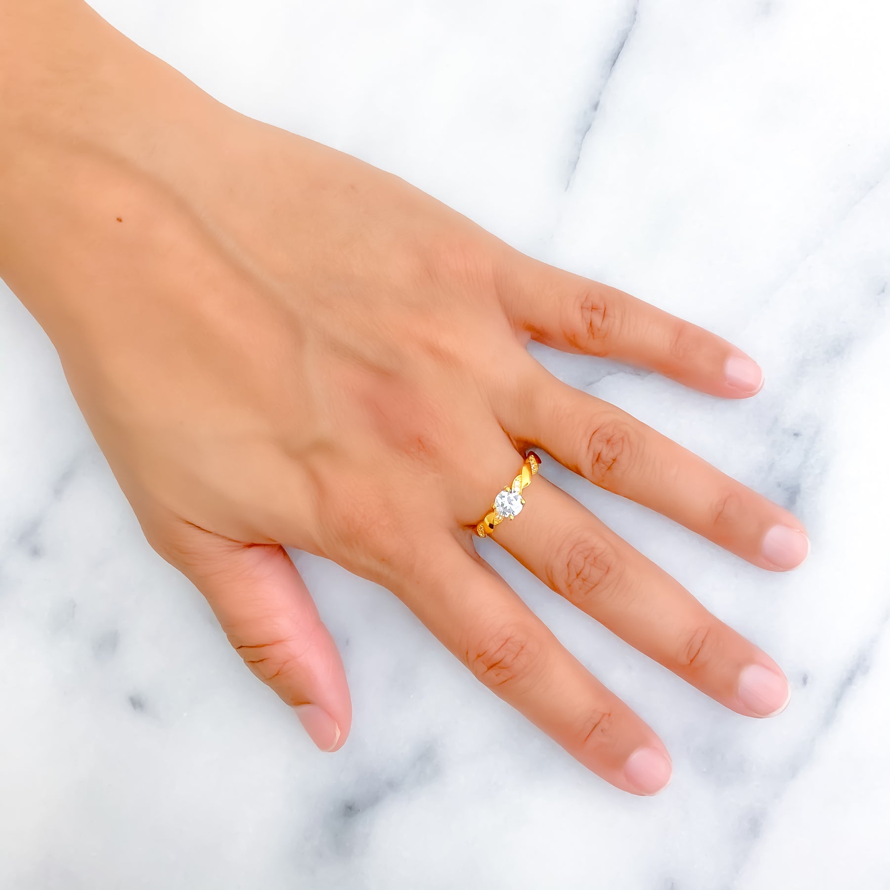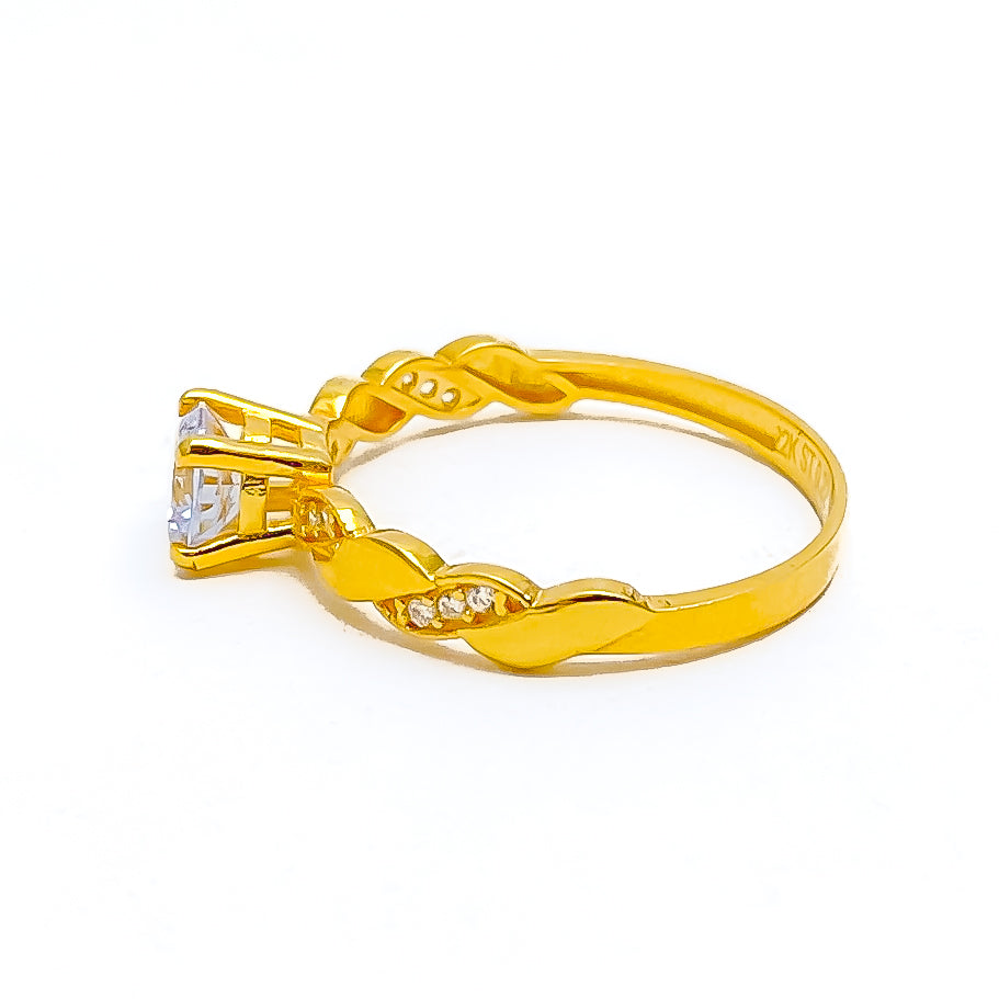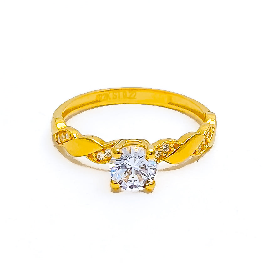 Sophisticated 22k yellow gold ring weighs 2.6 grams, showcasing sparkling cubic zirconia with rich radiant charm. The brilliant stones enhance its polished look while adding graceful everyday presence. Sized at 8.25, professional re sizing is available for comfortable flexible wear. Its refined finish conveys timeless elegance with luminous contemporary appeal.