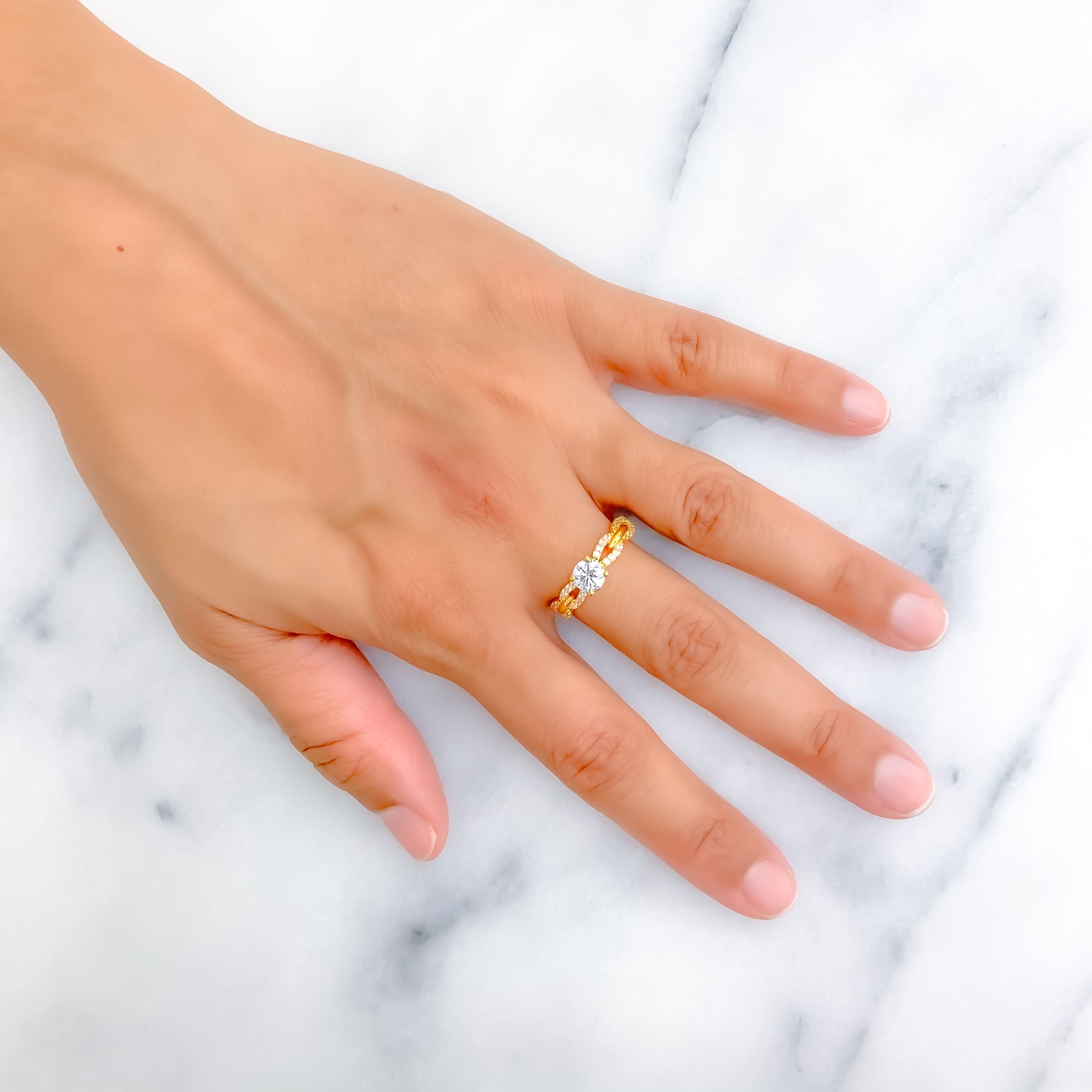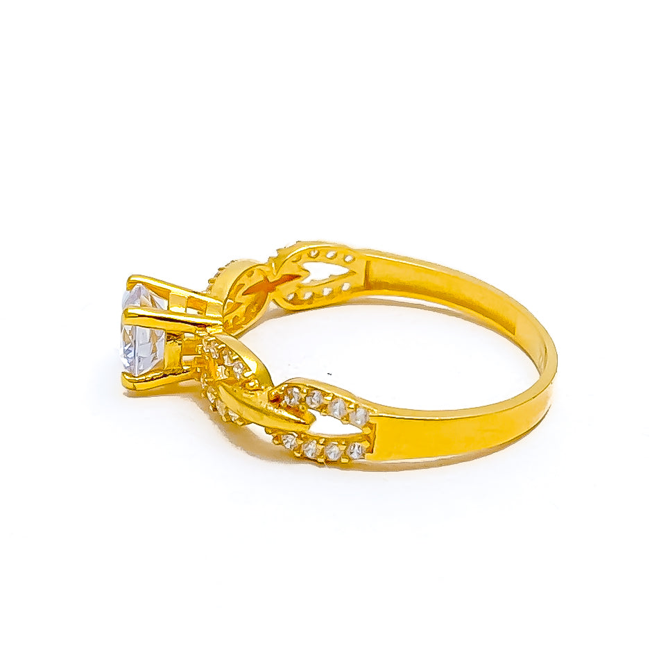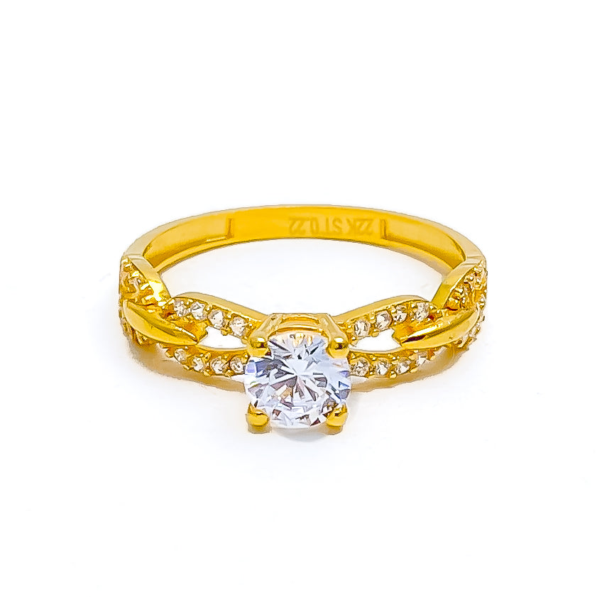 Radiant 22k yellow gold ring weighs 2.7 grams, showcasing sparkling cubic zirconia with warm luminous glow. The brilliant stones enhance its polished appearance while adding refined everyday elegance. Sized at 8.25, professional re sizing is available for comfortable flexible wear. Its gleaming finish conveys timeless sophistication with graceful contemporary charm.