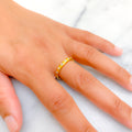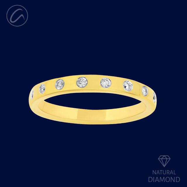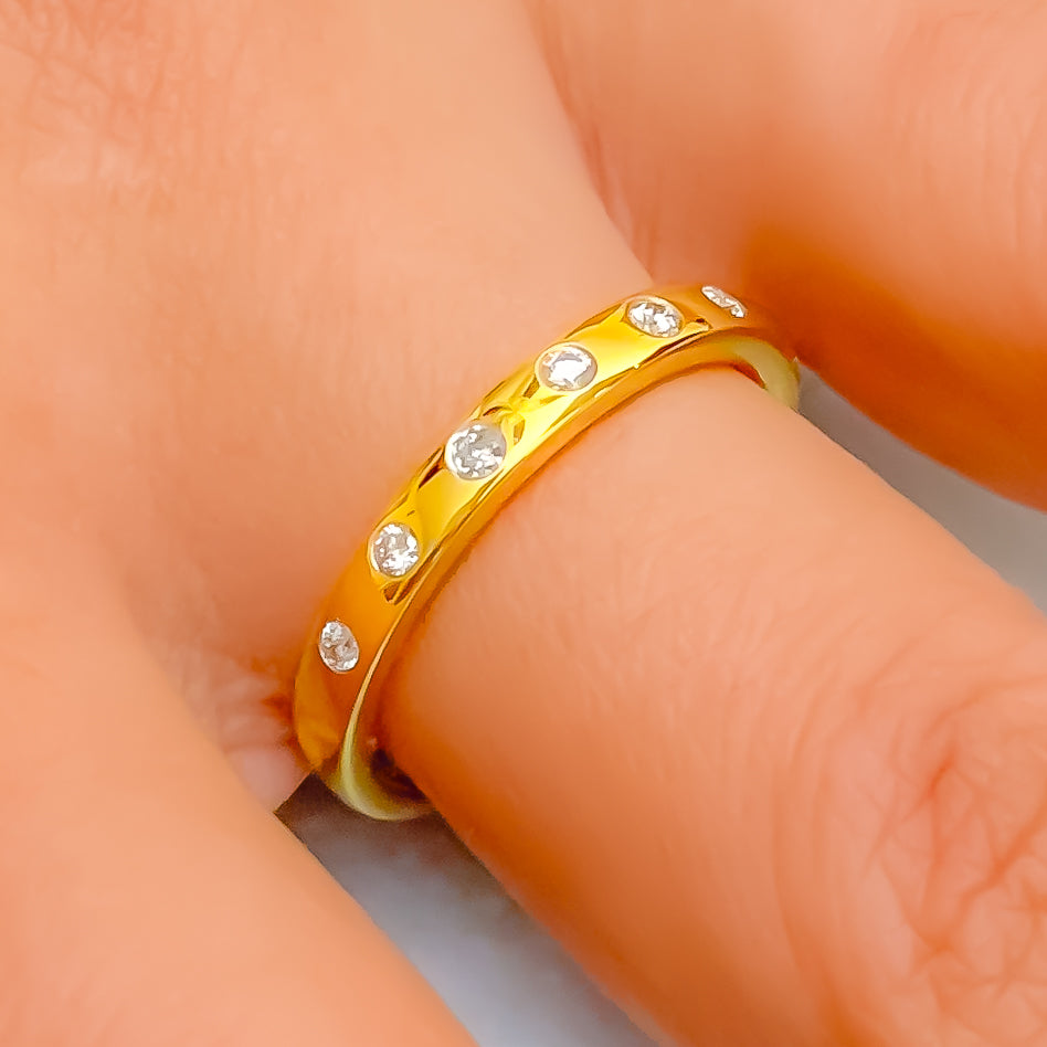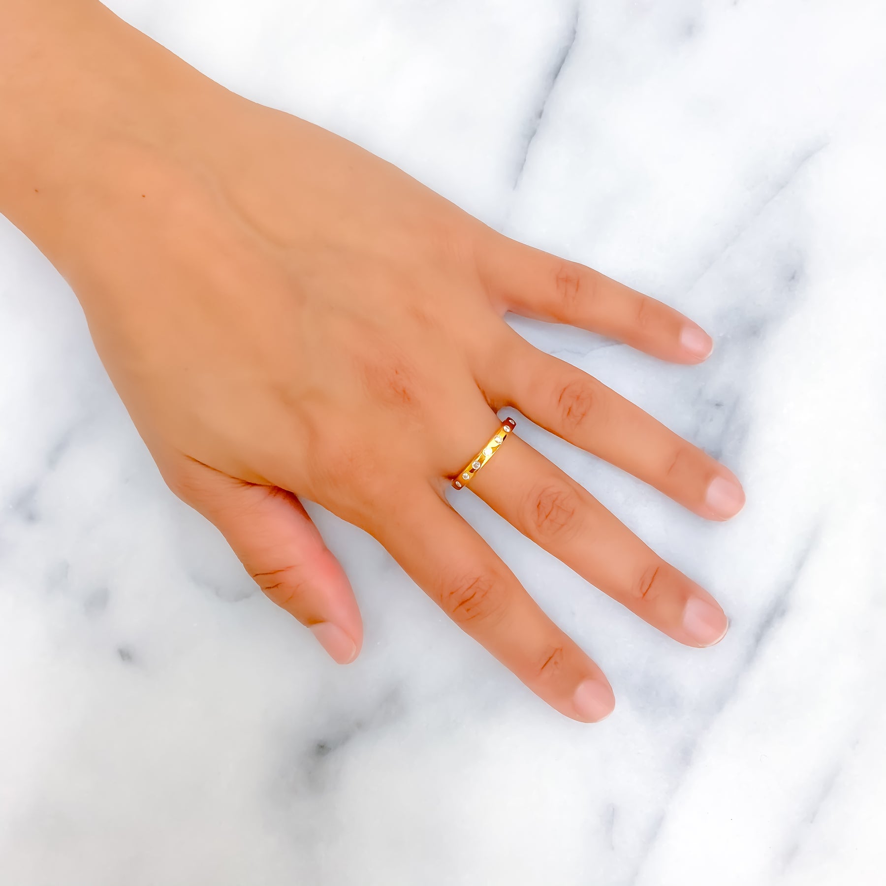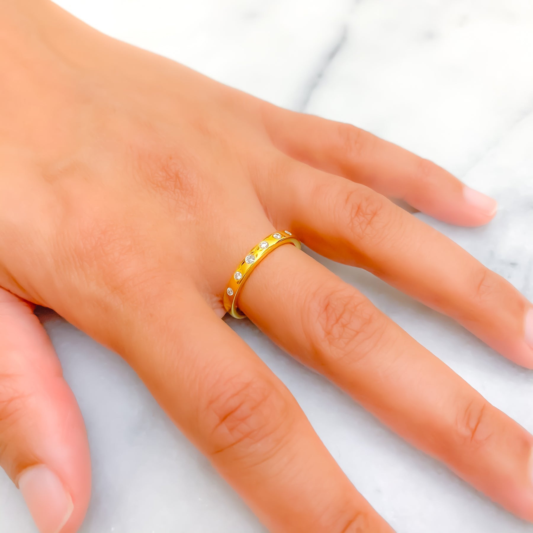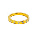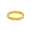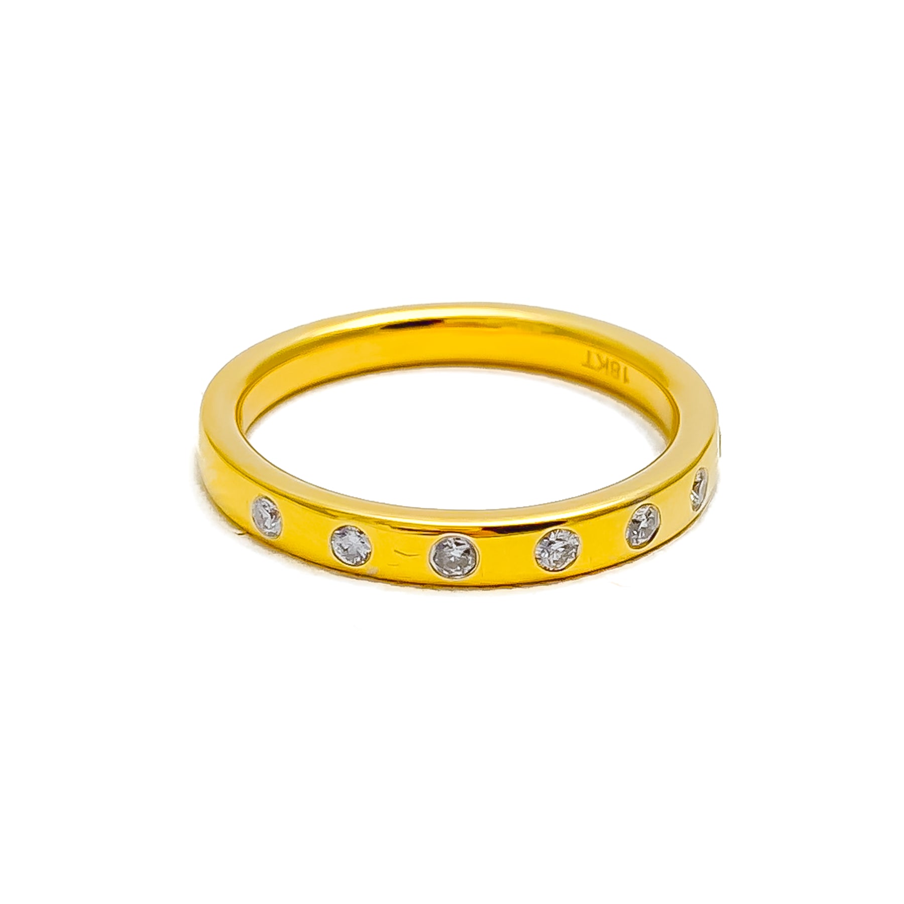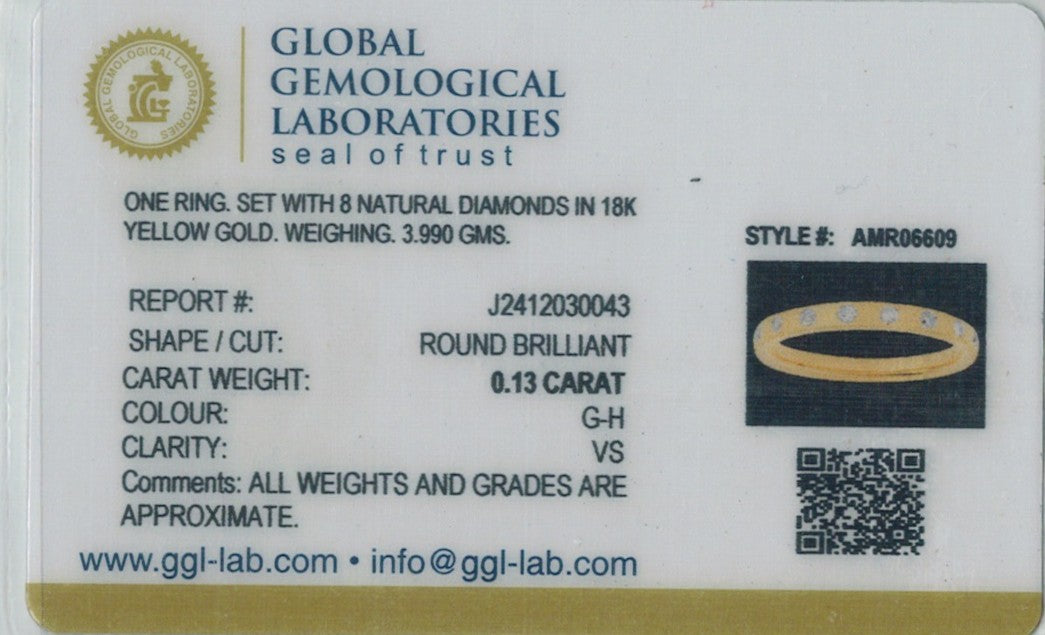 Crafted in polished 18k yellow gold and weighing 4.0 grams, this elegant band features a refined lined design accented by 0.13 carats of round brilliant cut diamonds. Graded G-H in color and VS in clarity, the diamonds add a graceful sparkle that complements its sleek structure. Sized at 7.25 with re-sizing available, this ring effortlessly blends classic charm with contemporary styling—ideal for dressy occasions or elevated everyday wear.