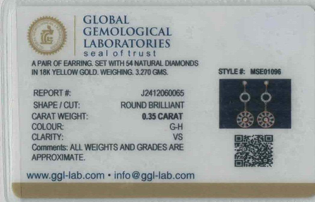 Modern and radiant, these 3.27-gram earrings in 18k yellow gold feature 0.35ct of G-H color, VS clarity diamonds in round and baguette cuts. Measuring 1.2 inches with secure screw backs, they offer a sleek hanging silhouette. GGL certified, they bring a chic upscale touch to any refined look.
