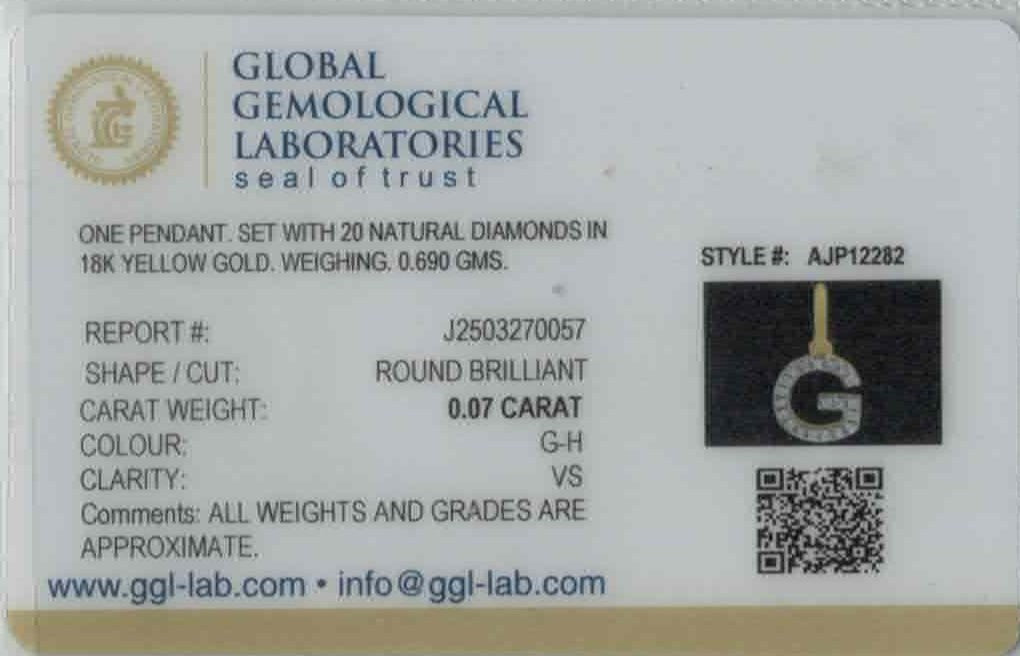 Radiating elegance and charm, this 18k yellow gold pendant features the letter G adorned with a sparkling 0.07ct VS-quality diamond. Weighing 0.69 grams and measuring 0.6 inches in length, it delivers a graceful blend of personalization and brilliance. The polished finish enhances its refined appeal. Chain not included, and it is GGL certified to ensure authenticity and trusted quality.