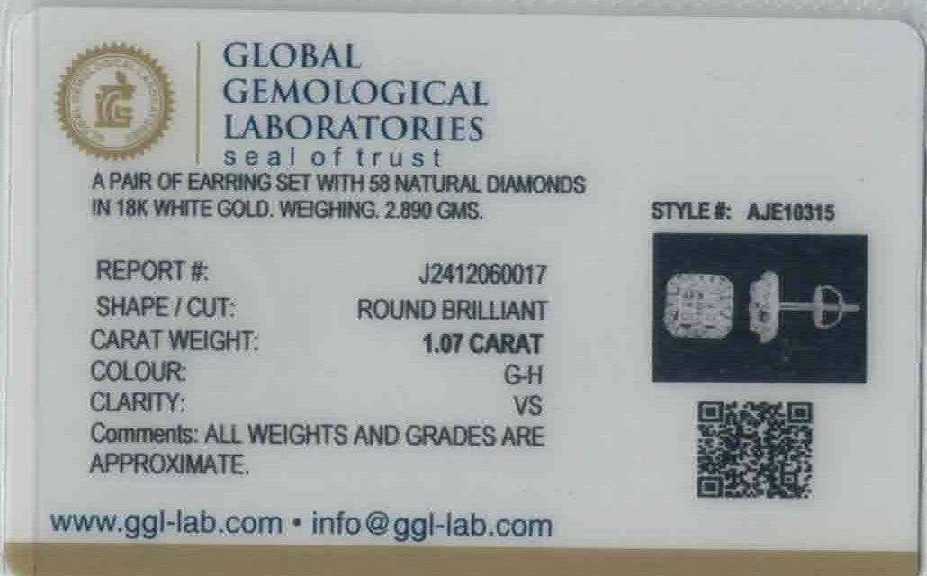 Elegantly crafted, these 18k white gold diamond earrings exude brilliance with refined sophistication. Weighing 2.89 grams, they offer a perfect blend of delicacy and radiance. The 1.07ct of G-H color, VS clarity round brilliant-cut diamonds dazzle with captivating sparkle. Measuring 0.4 inches, they’re a timeless expression of luxury and modern grace.