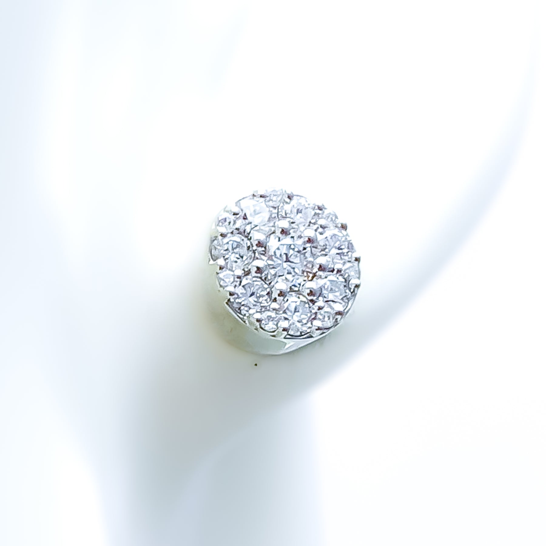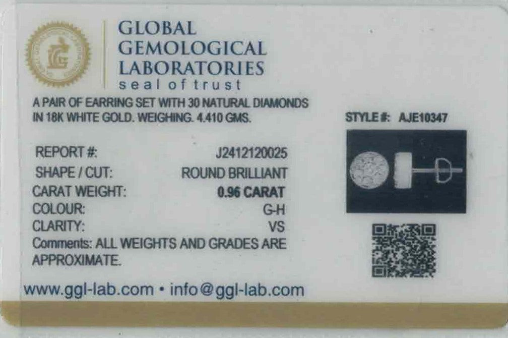 Exquisitely designed, these 18k white gold diamond earrings radiate refined sophistication with their brilliant sparkle. Weighing 4.41 grams, they offer a graceful balance of luxury and lightness. The 0.96ct of G-H color, VS clarity round brilliant-cut diamonds shimmer with timeless allure. Measuring 0.3 inches, they’re perfect for adding understated elegance to any occasion.