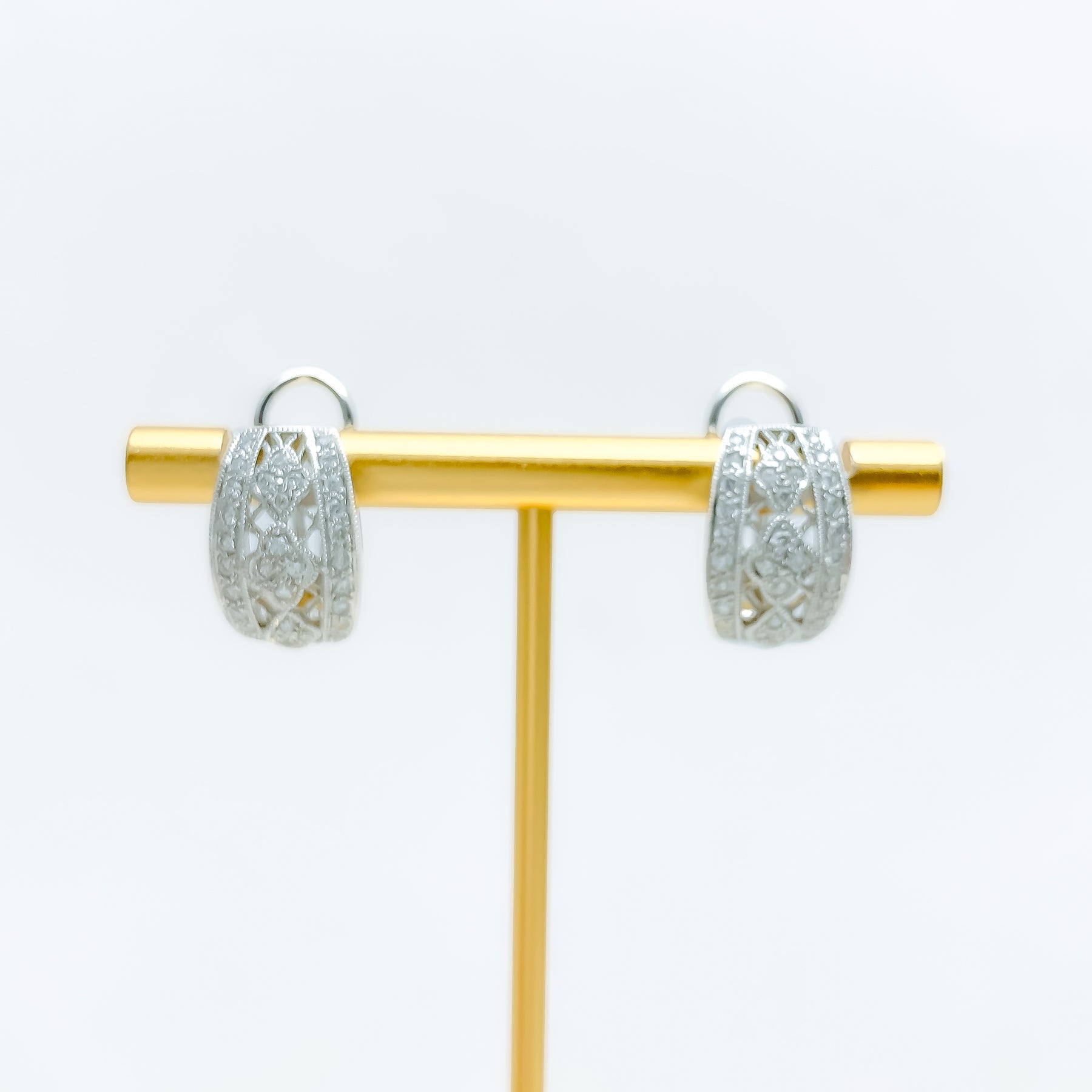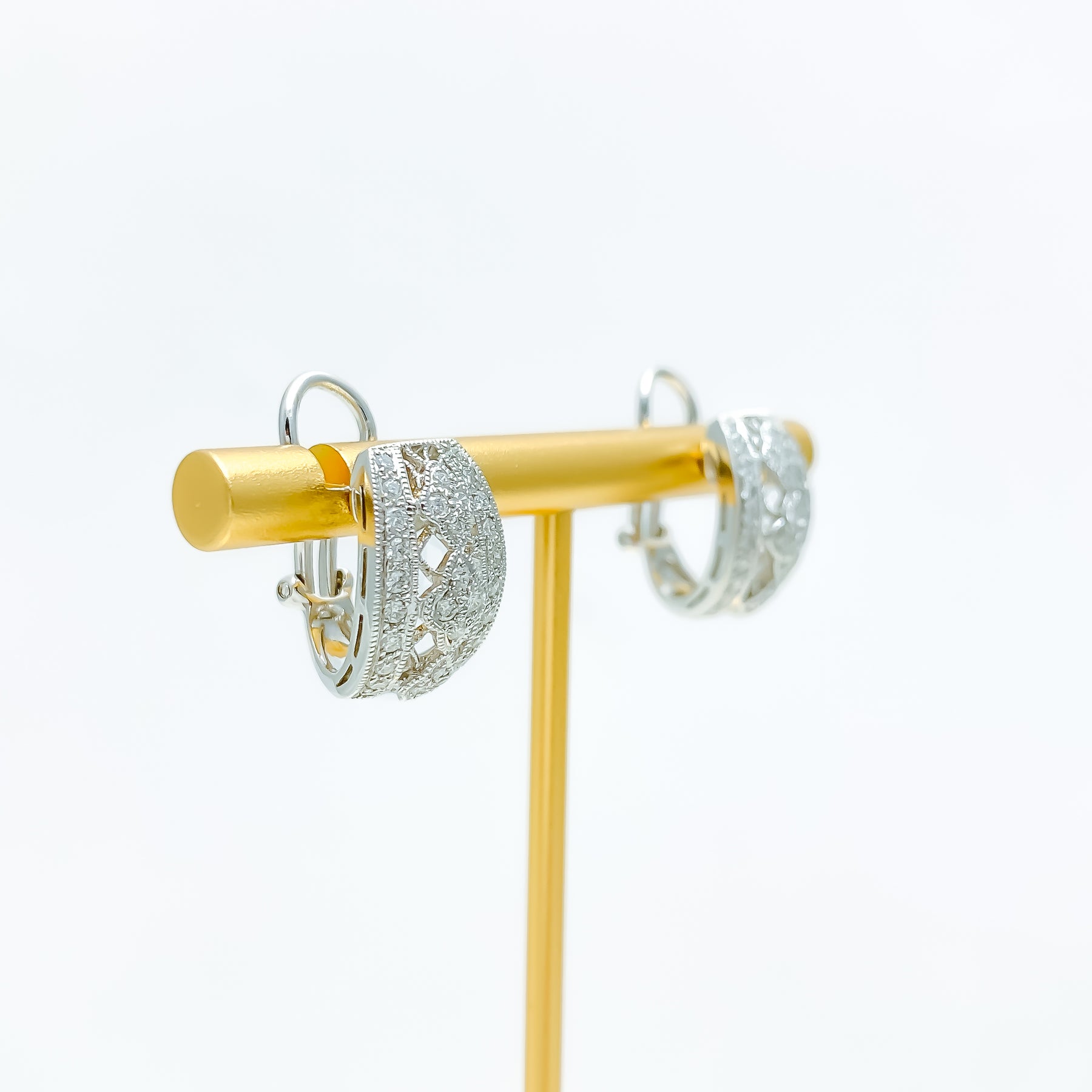 Enriched with radiant sophistication, these 18k white-gold earrings highlight an elegant 8.4-gram profile adorned with 0.68ct of VS-clarity G–H diamonds in brilliant round cuts that illuminate the refined half-Bali silhouette. The cool white-gold finish enhances each shimmering facet with crisp, iridescent depth, giving the compact 0.6-inch design a polished and evergreen charm. Styled in a hybrid tops-and-Bali form, they offer a graceful blend of modern sparkle and timeless versatility suited for many elevated looks. Completed with secure push-back clasps, they bring an enduring touch of luminous diamond elegance to any thoughtfully curated collection.