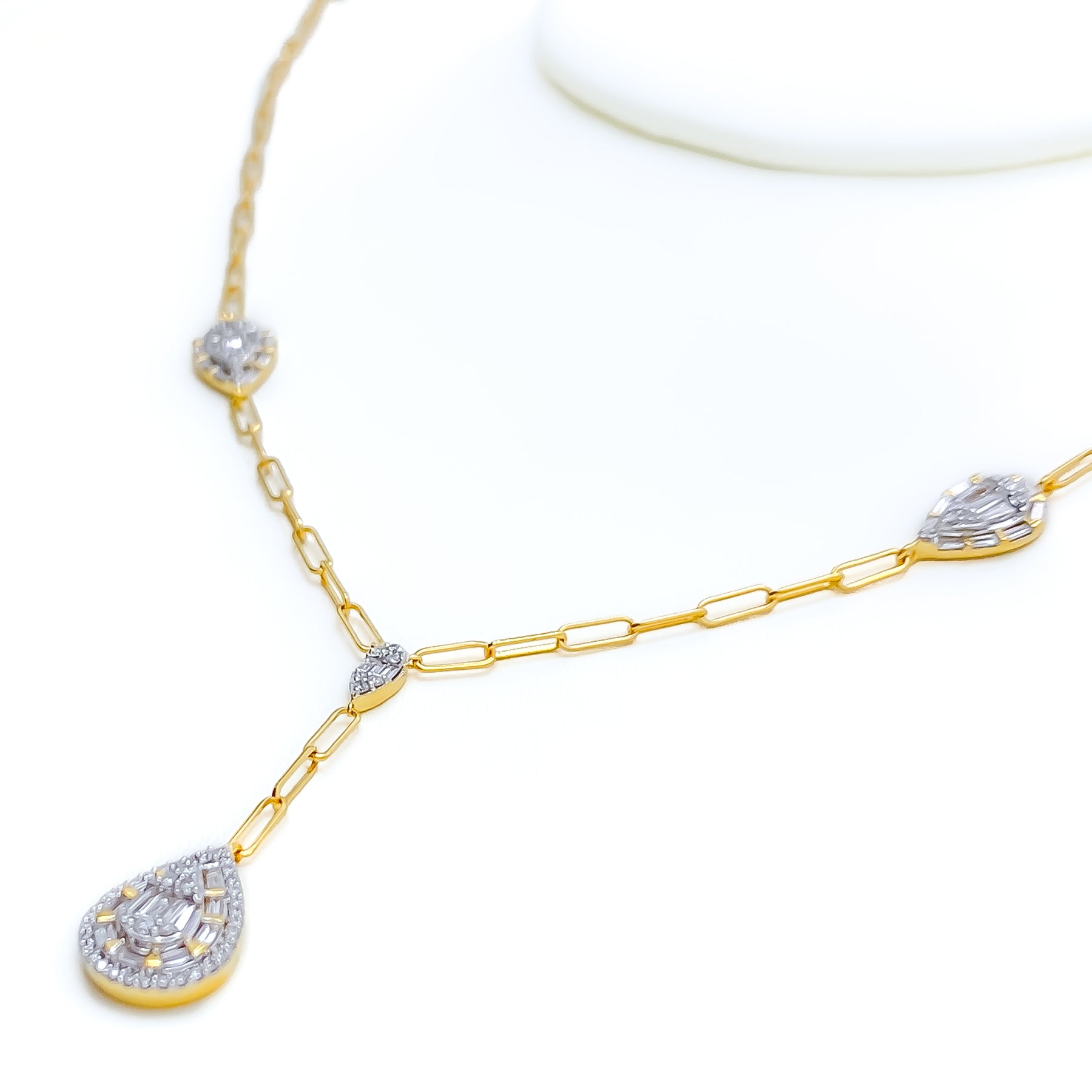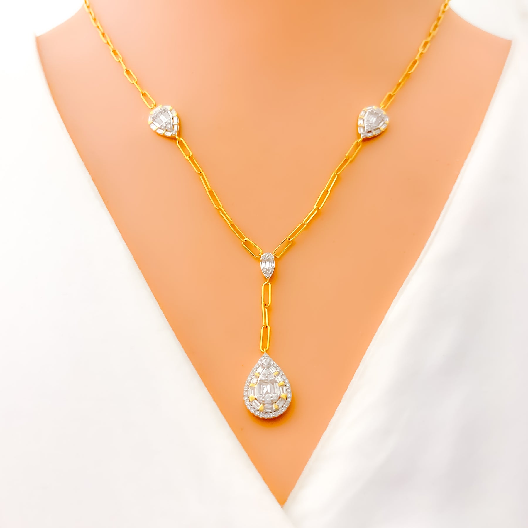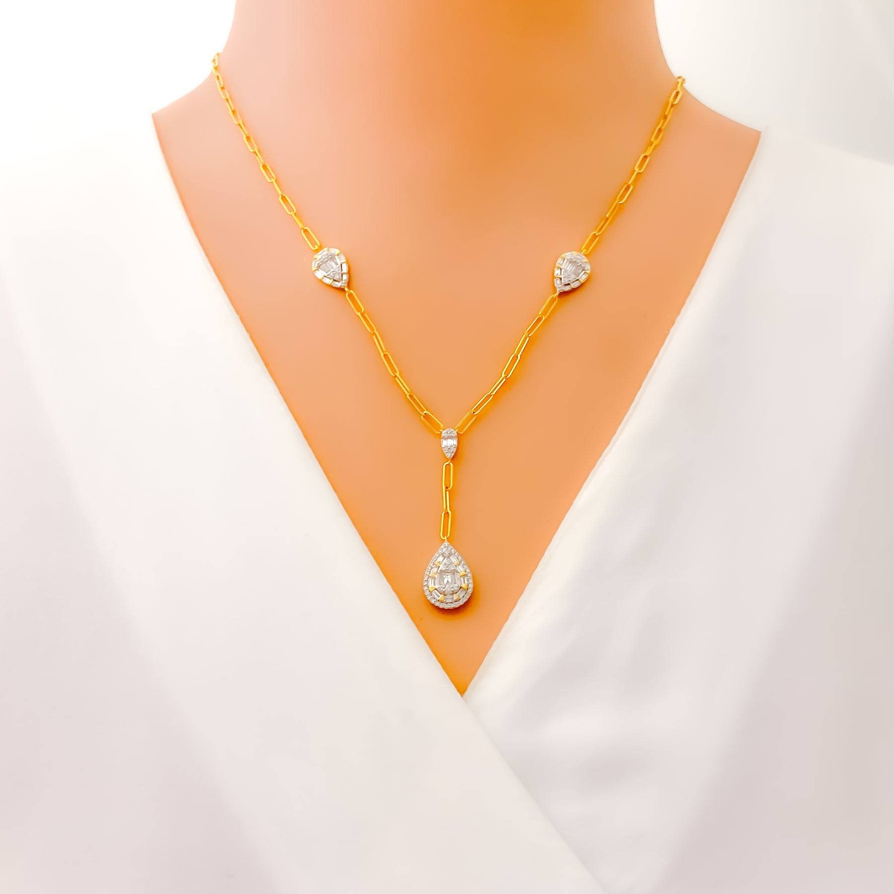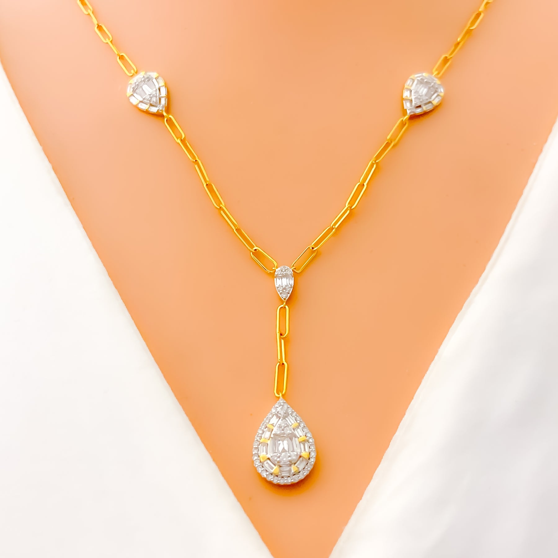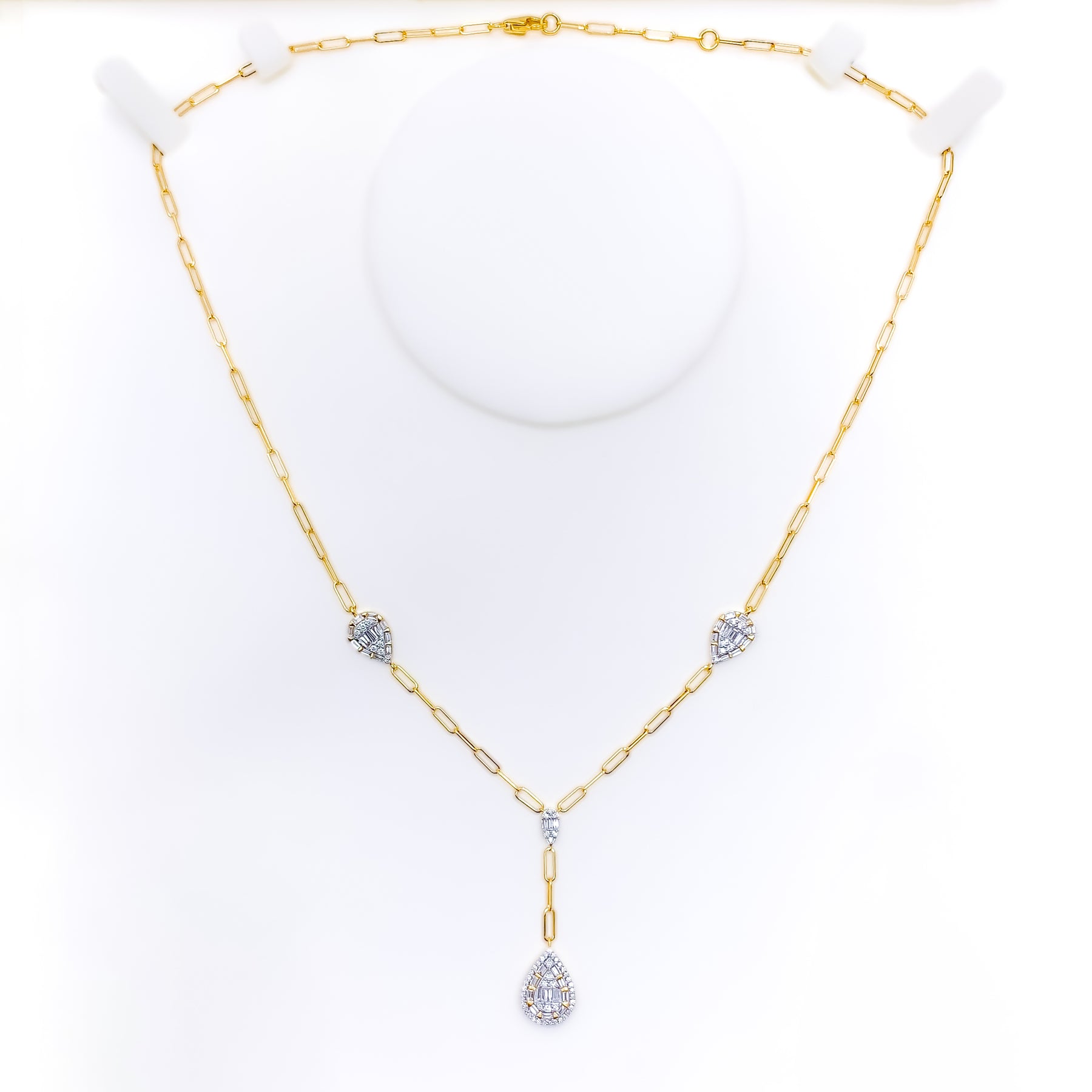 This luxurious 18k yellow gold necklace, weighing 7.3 grams, showcases a refined drop design adorned with 0.85ct of sparkling round and baguette diamonds. The polished finish enhances its radiant brilliance, exuding timeless elegance. Measuring 18" in length with a 1.5" drop, it includes 2" adjustable links and secures with a lobster lock. A certified GGL piece that beautifully blends sophistication with modern allure, perfect for both formal occasions and elevated daily wear.