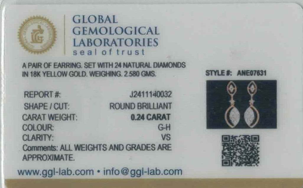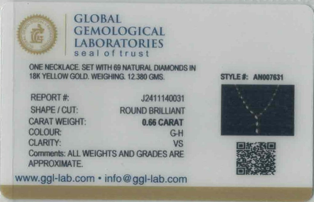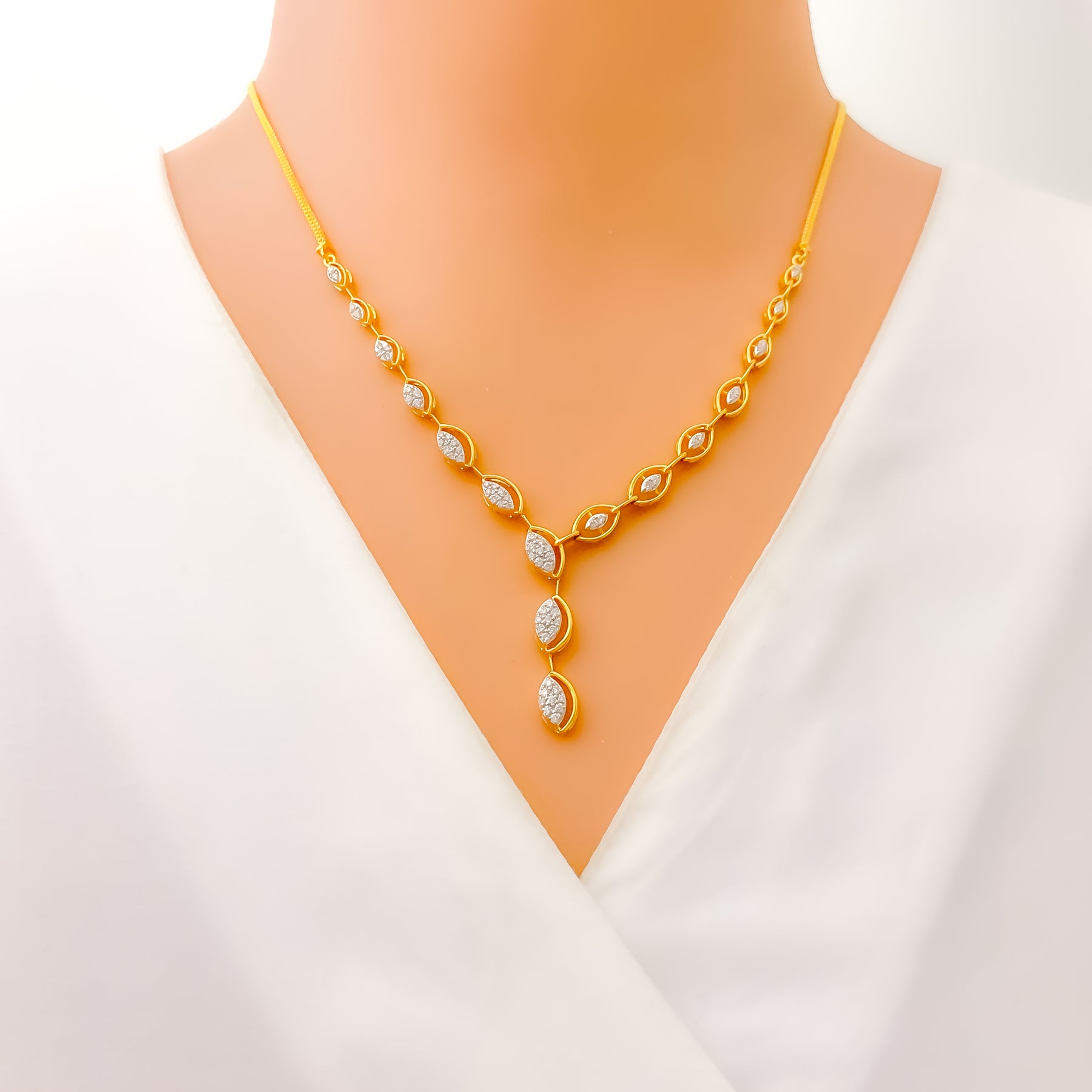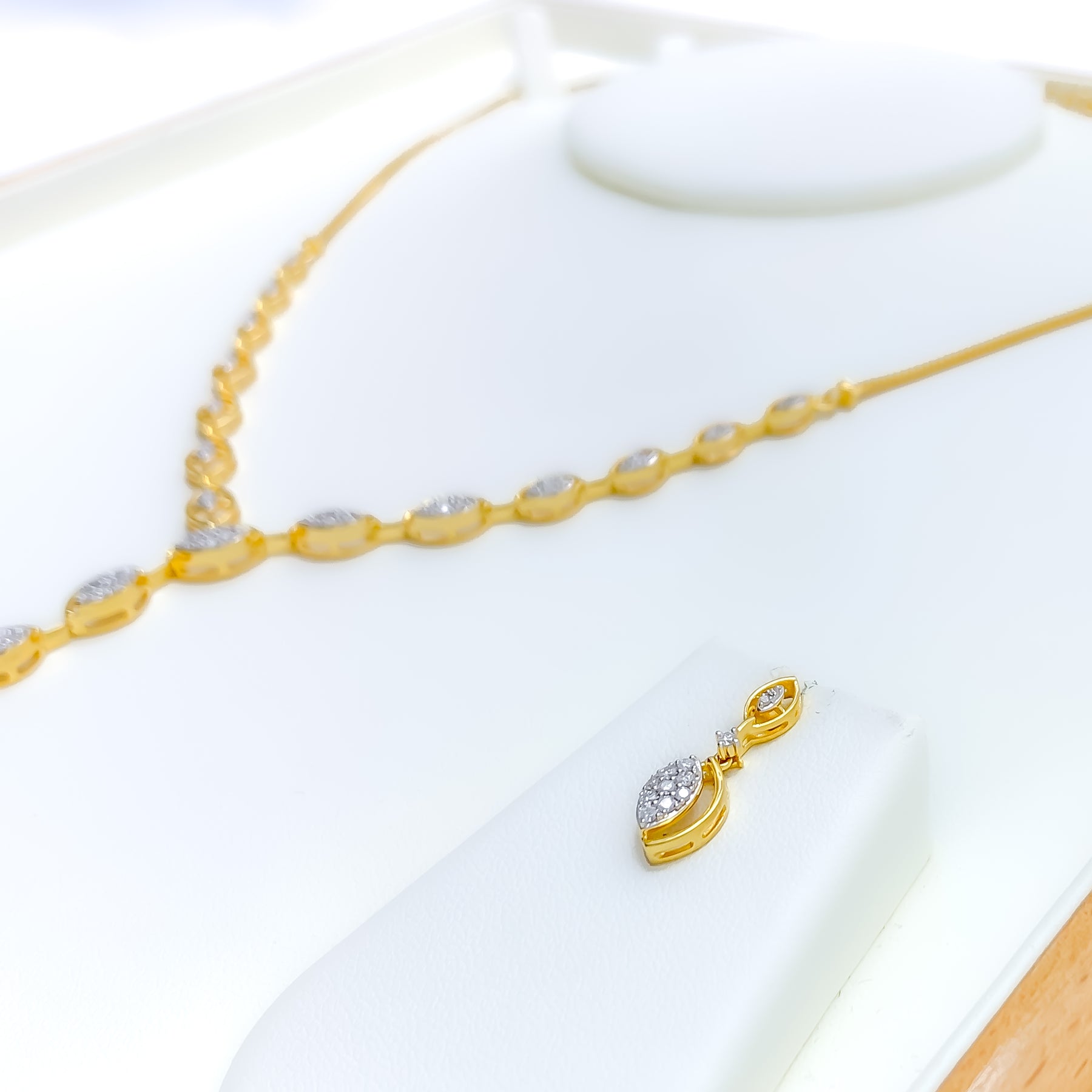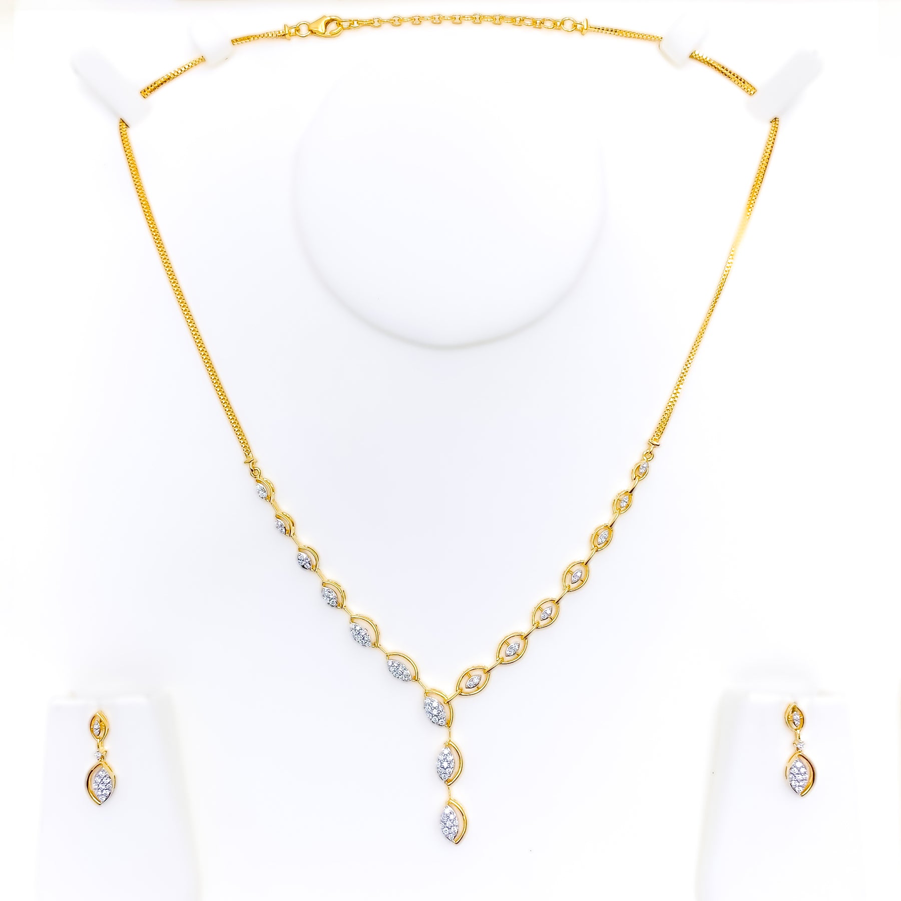 Stylishly crafted, this 18k yellow gold necklace set showcases modern elegance through its marquise-inspired diamond arrangement. Weighing 14.96 grams, it offers a luxurious balance of brilliance and grace. The 0.9ct of G-H color, VS quality diamonds radiate captivating sparkle. Measuring 18 inches with 1.25-inch drop and matching 0.8-inch earrings, it defines refined sophistication.