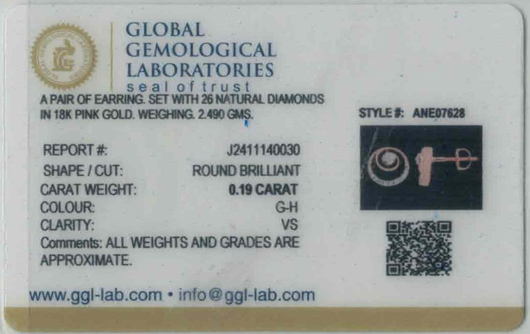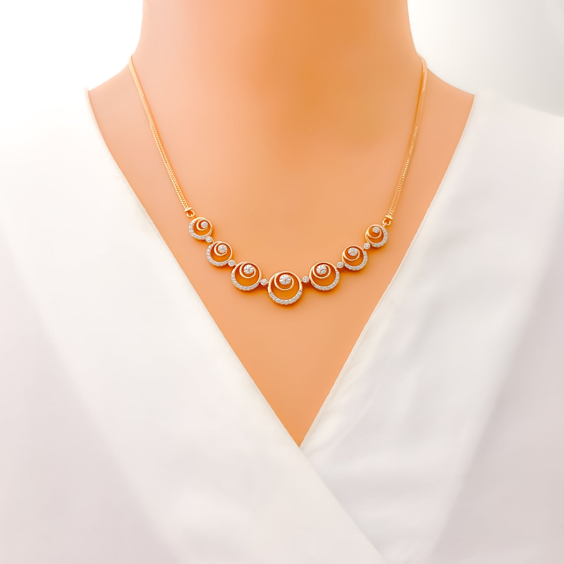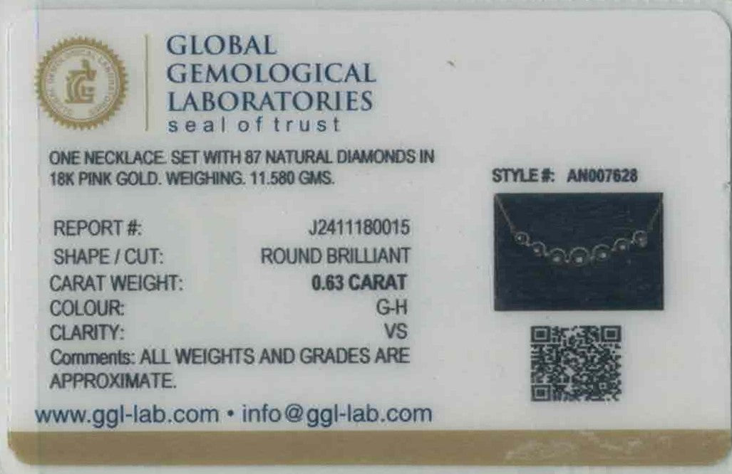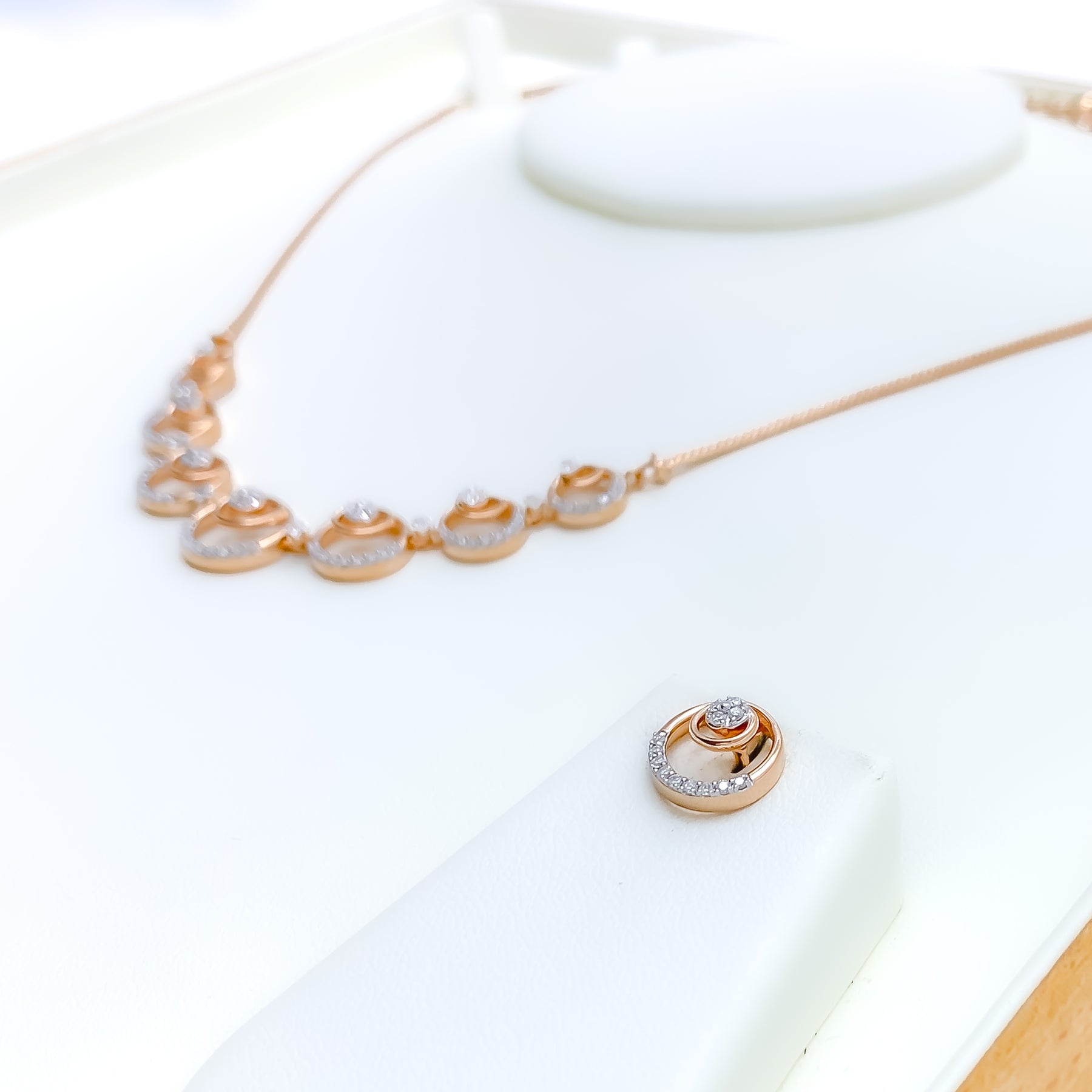 Exquisitely designed, this 18k rose gold necklace set radiates elegance with its cascading array of round brilliant-cut diamonds. Weighing 14.07 grams, it balances luxury and refinement in perfect harmony. The 0.82ct of G-H color, VS quality diamonds shimmer with breathtaking brilliance. Measuring 18 inches with matching 0.4-inch earrings, it embodies timeless sophistication and grace.