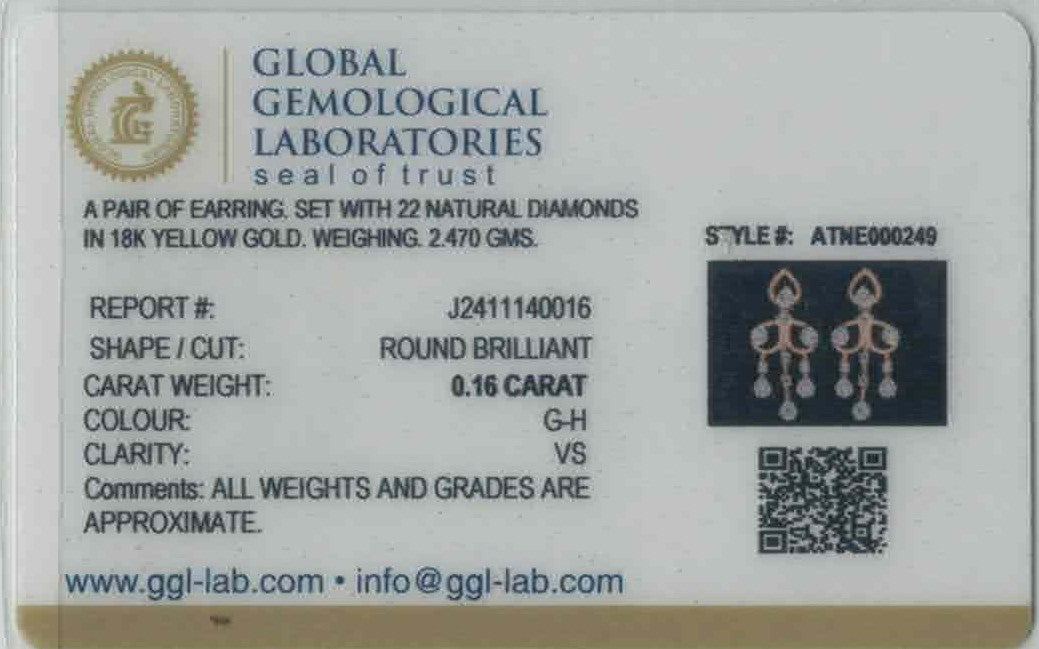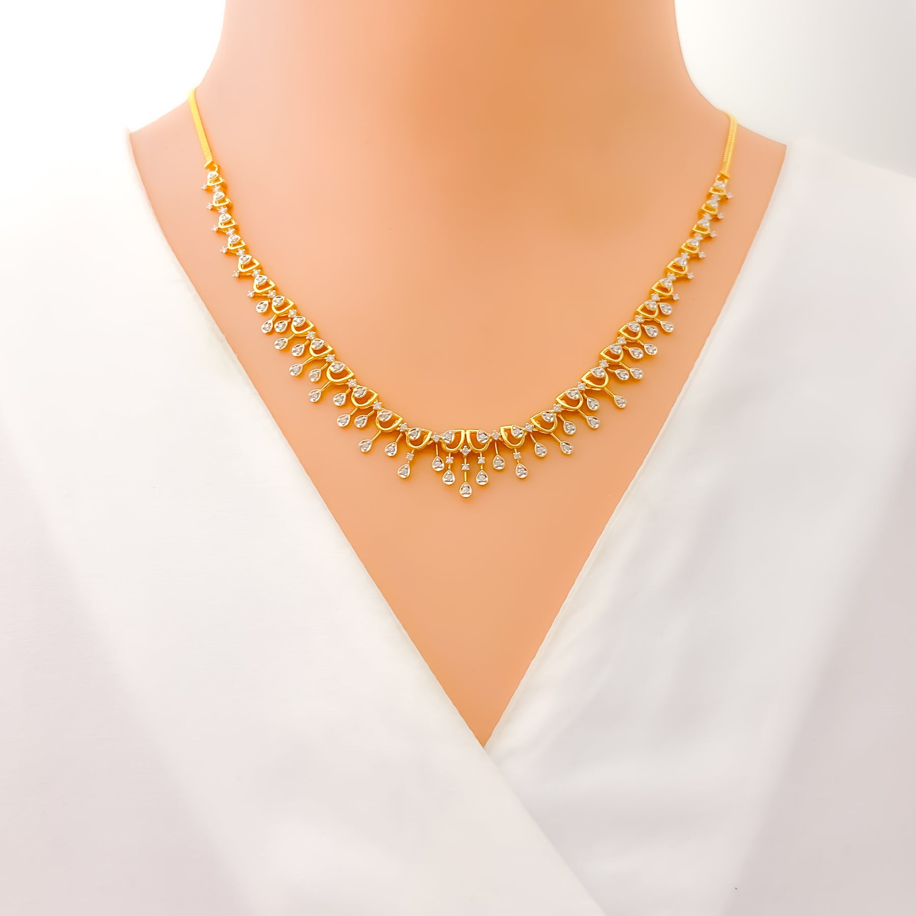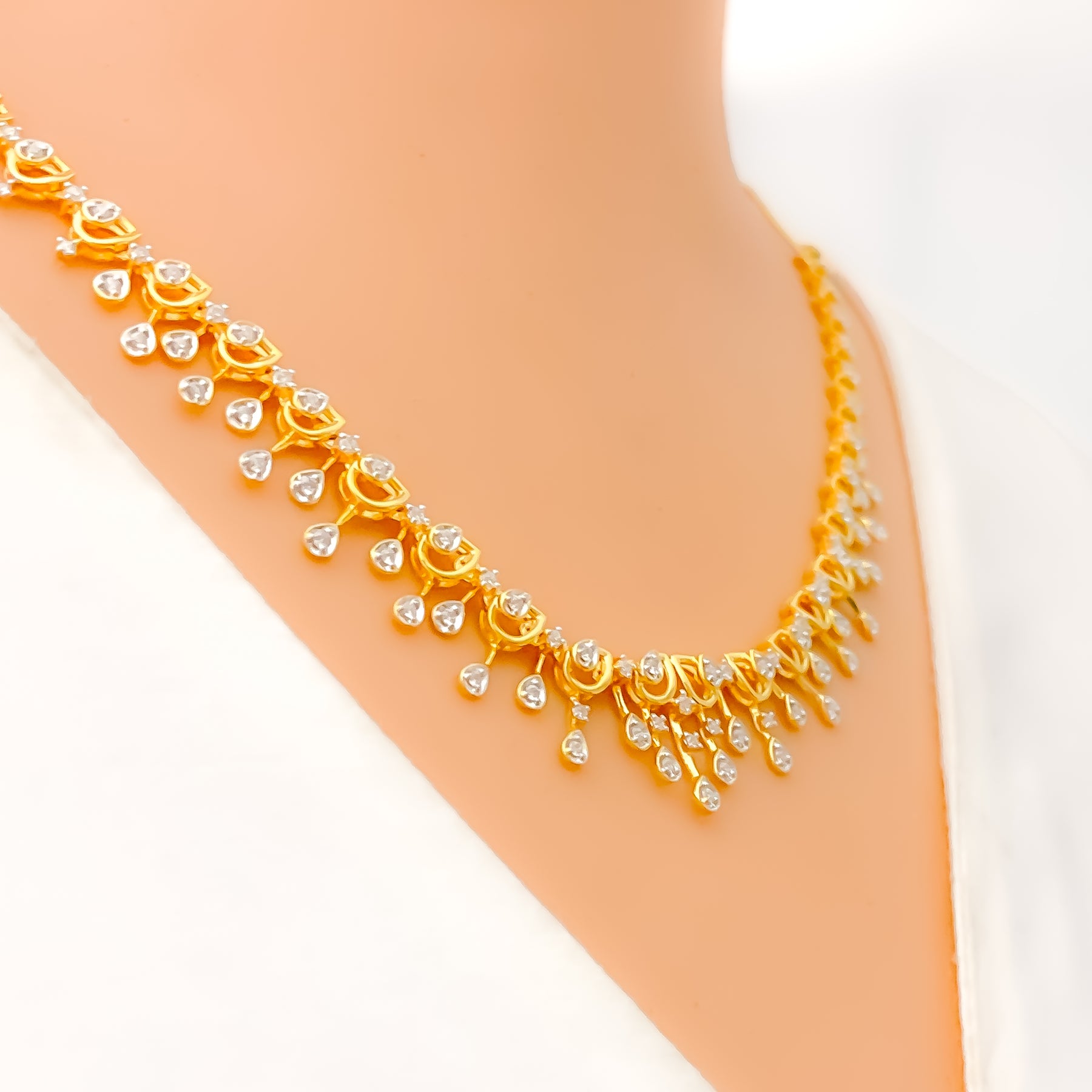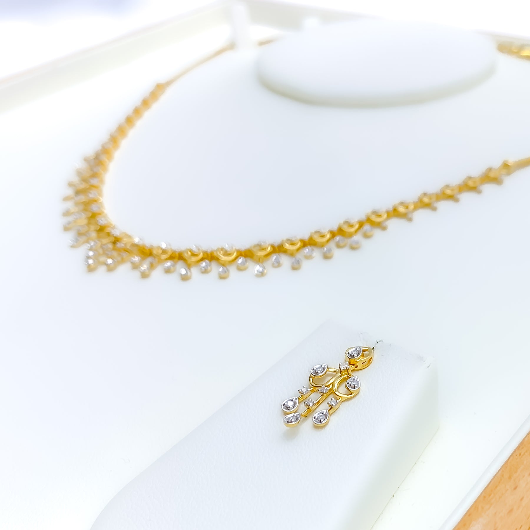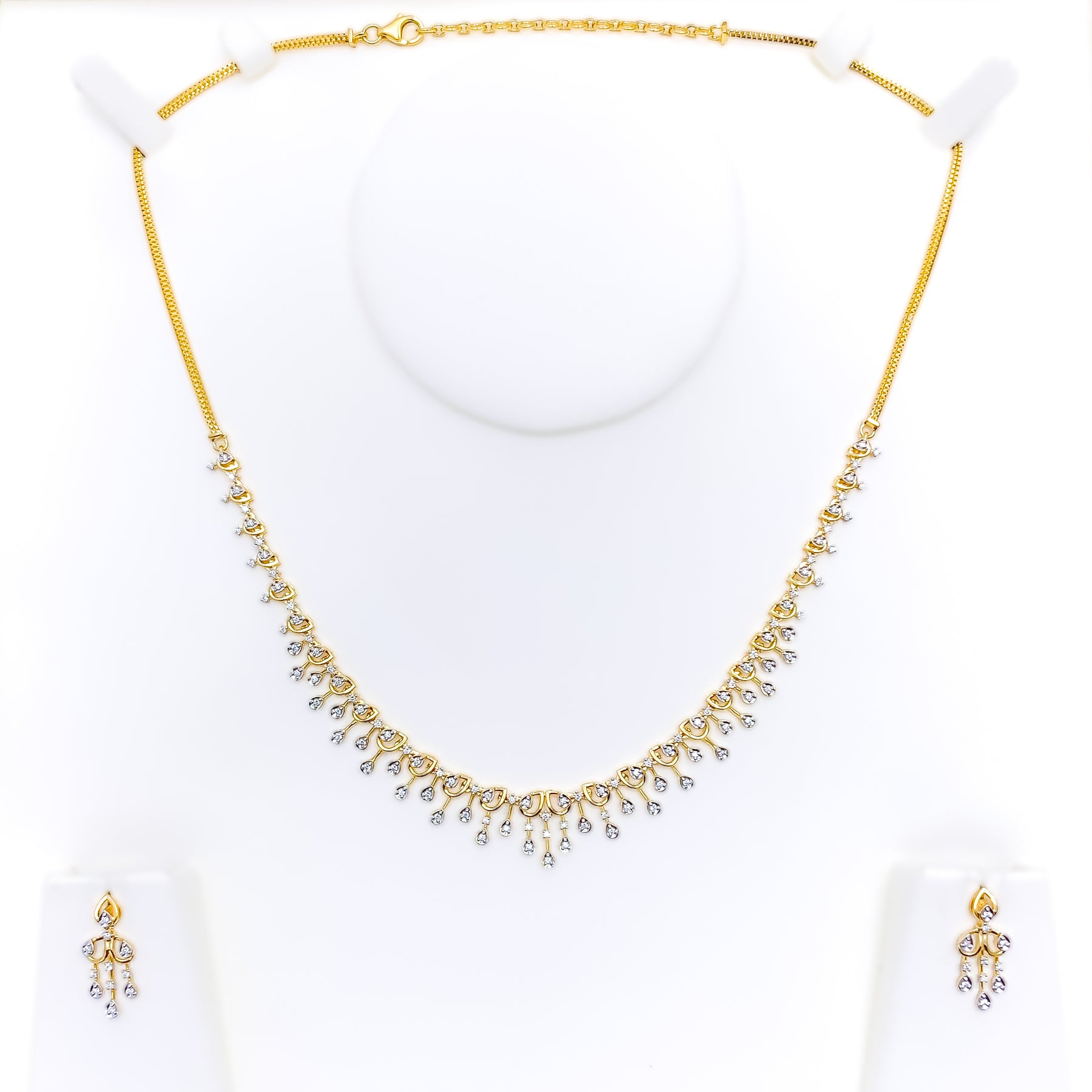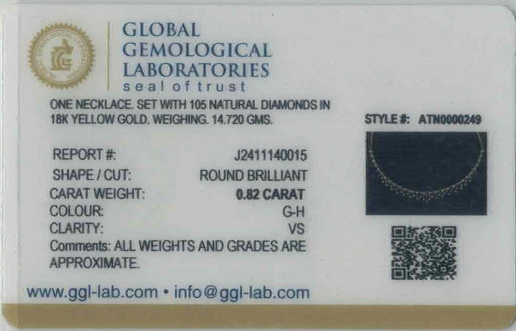 Finely crafted, this 18k yellow gold necklace set embodies royal elegance through its graceful diamond arrangement. Weighing 17.19 grams, it offers a luxurious yet refined presence. The 0.98ct of G-H color, VS quality round brilliant-cut diamonds sparkle with captivating allure. Measuring 18 inches with matching 0.75-inch earrings, it radiates timeless sophistication and charm.