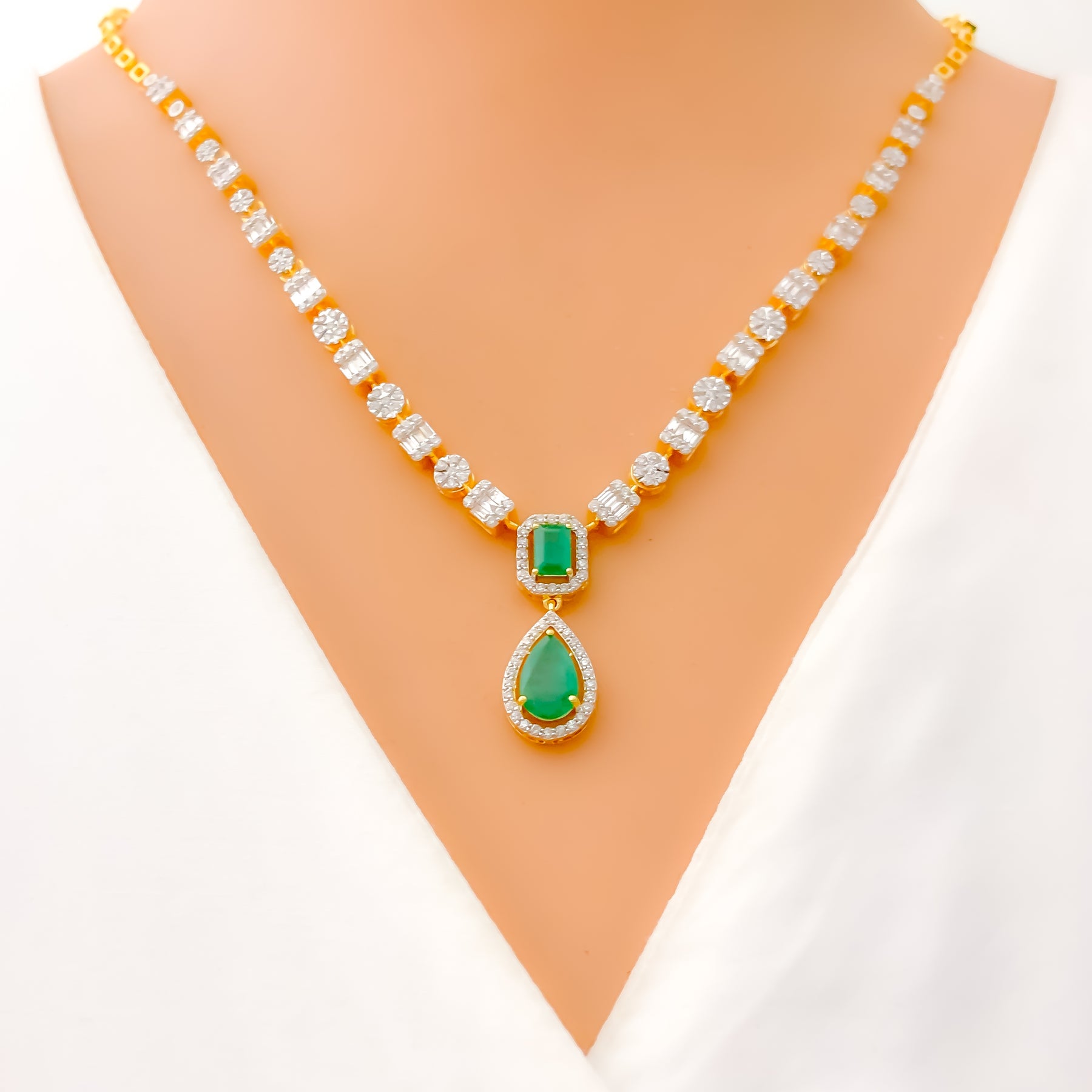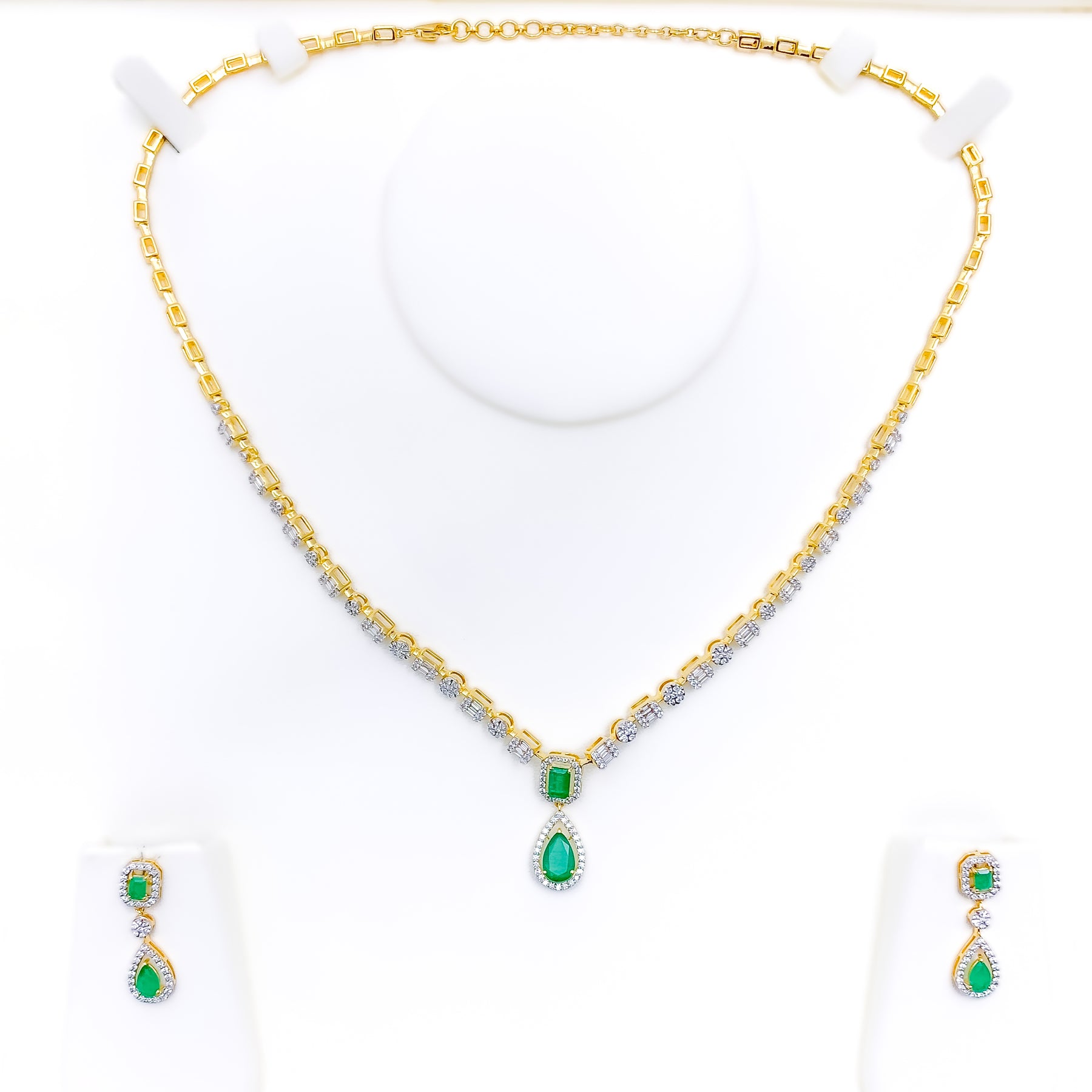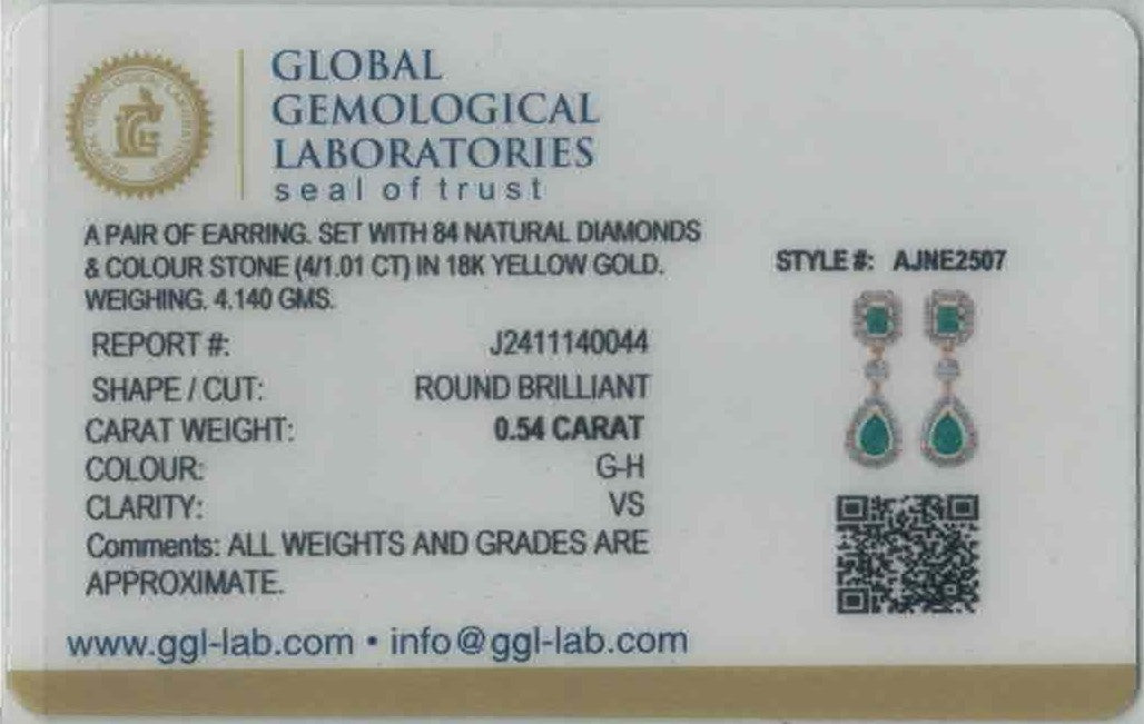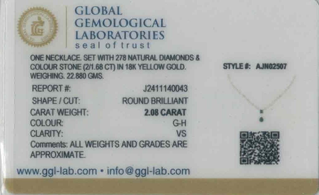 Refined and radiant, this 18k yellow gold necklace set features 2.62ct of G-H color, VS quality diamonds in round and baguette cuts, accented with cultured emerald stones in elegant drop and emerald cuts. The 18" necklace offers 2" adjustable links and a 1.1" drop centerpiece. Matching 1.1" earrings with screw backs complete this certified GGL ensemble.