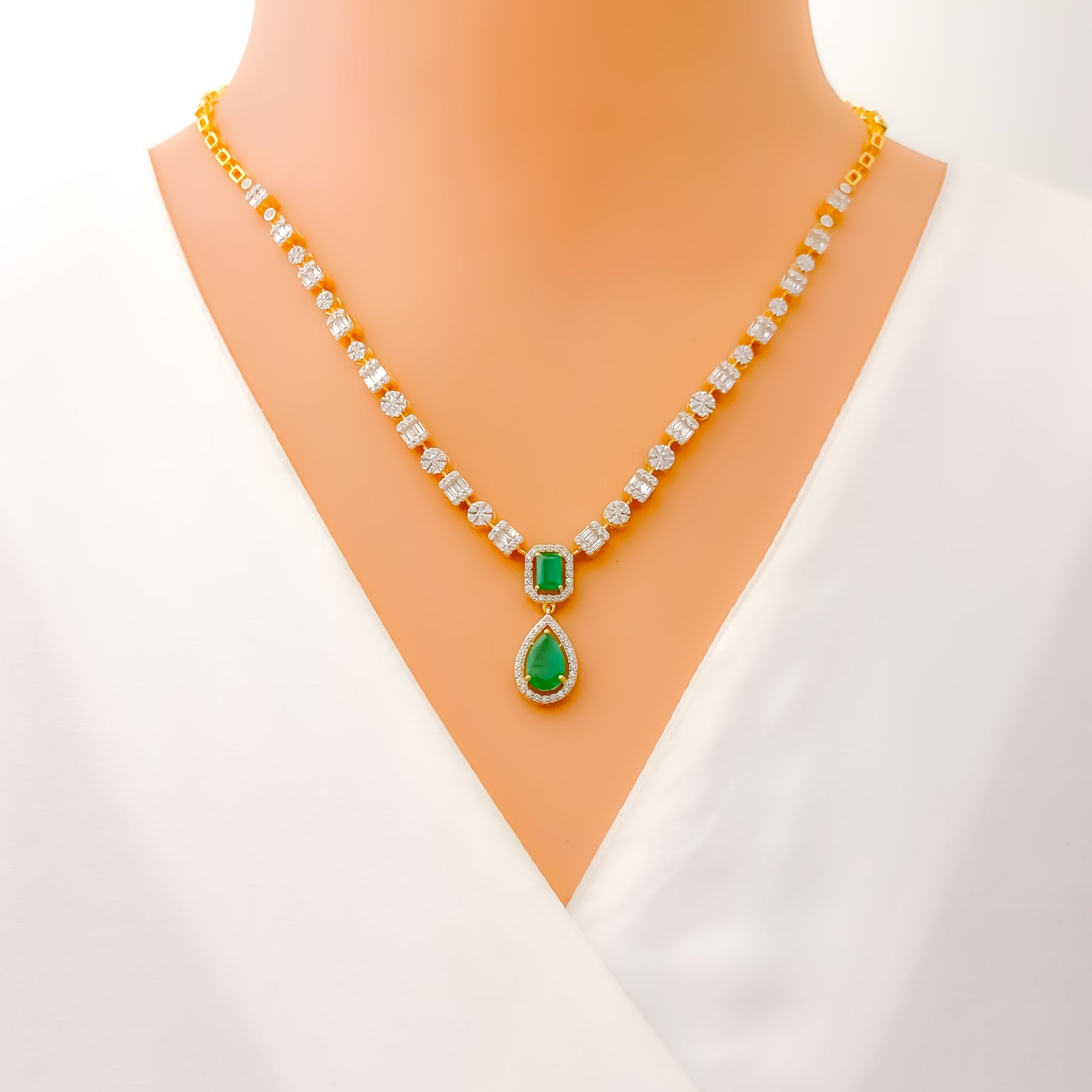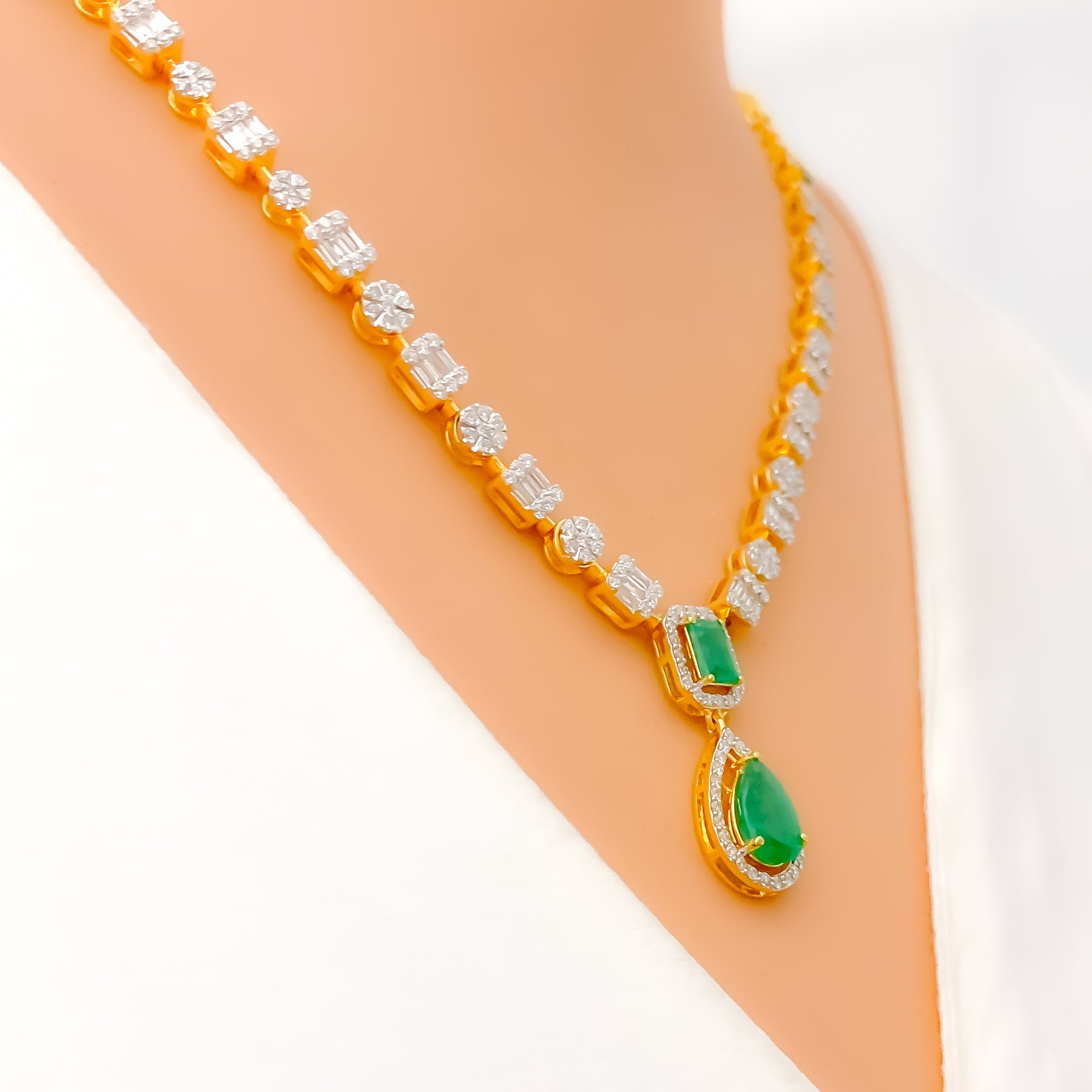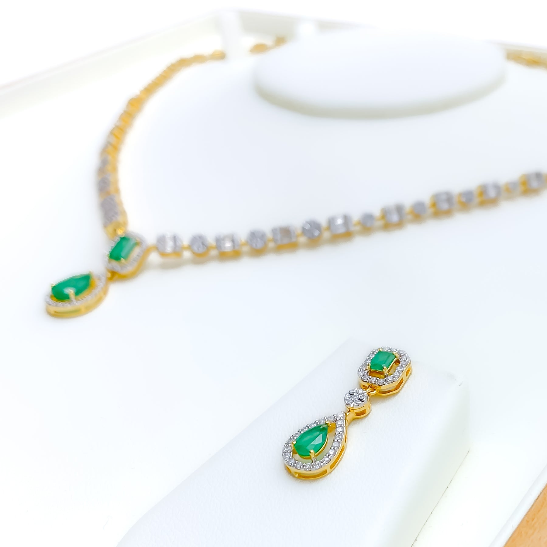 Refined and radiant, this 18k yellow gold necklace set features 2.62ct of G-H color, VS quality diamonds in round and baguette cuts, accented with cultured emerald stones in elegant drop and emerald cuts. The 18" necklace offers 2" adjustable links and a 1.1" drop centerpiece. Matching 1.1" earrings with screw backs complete this certified GGL ensemble.
