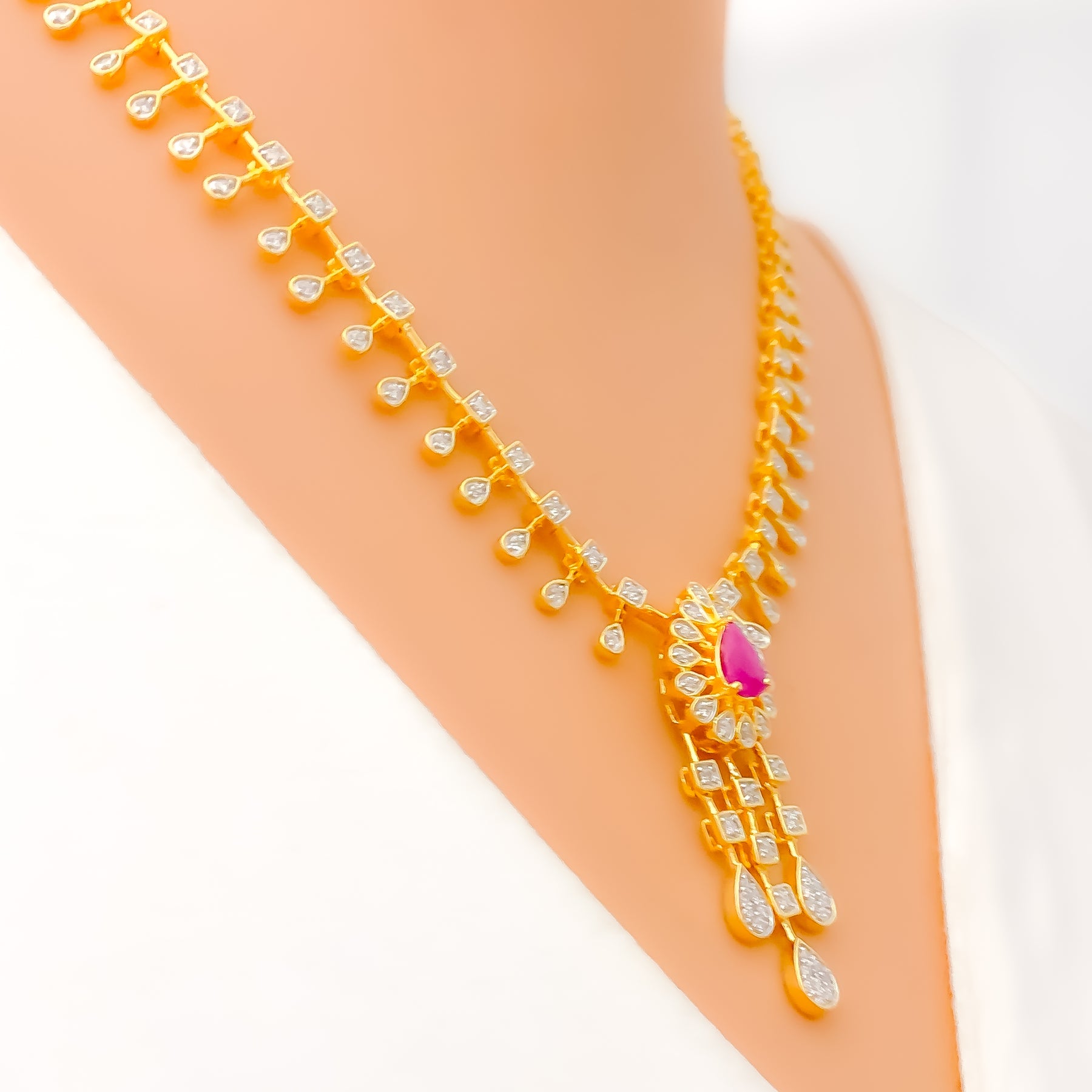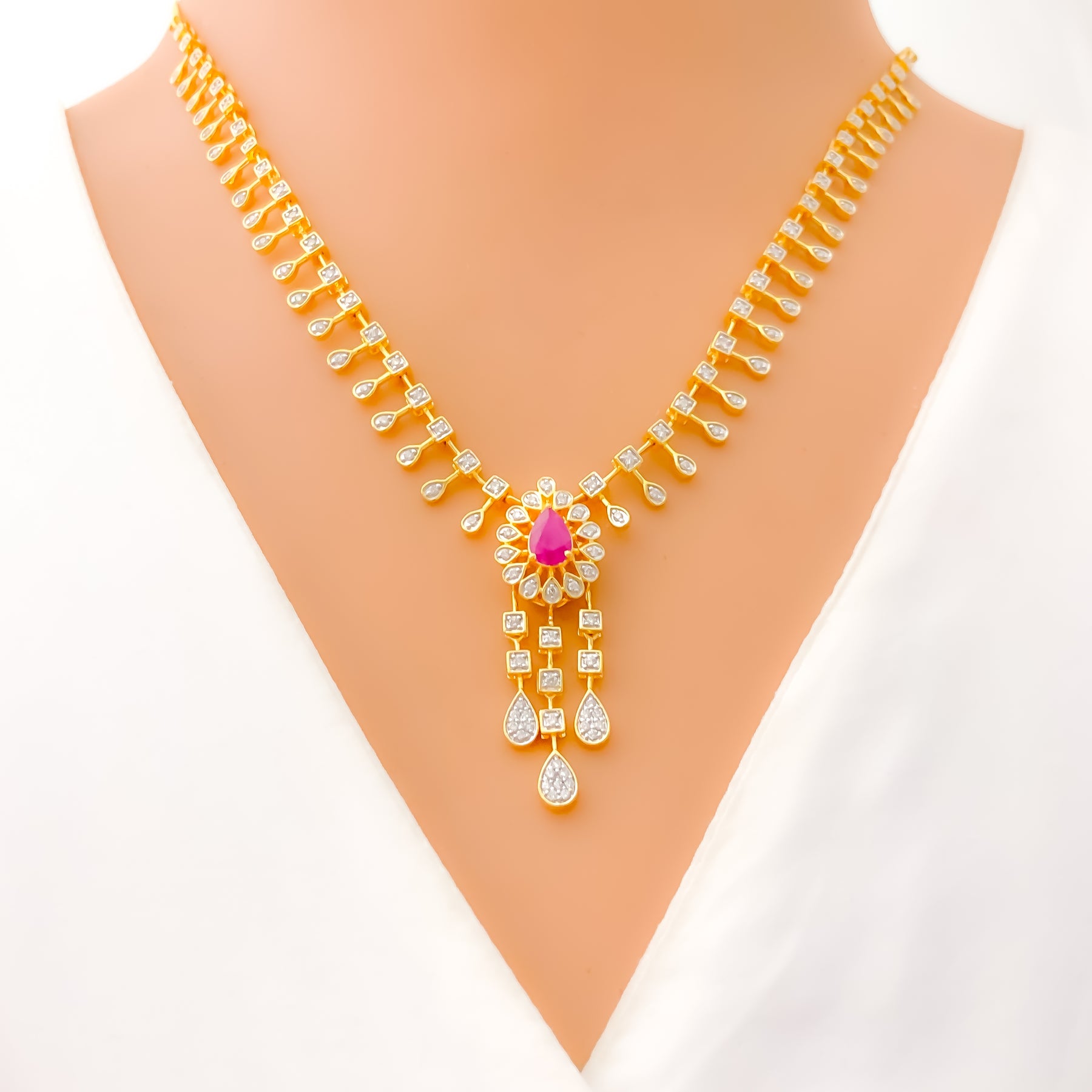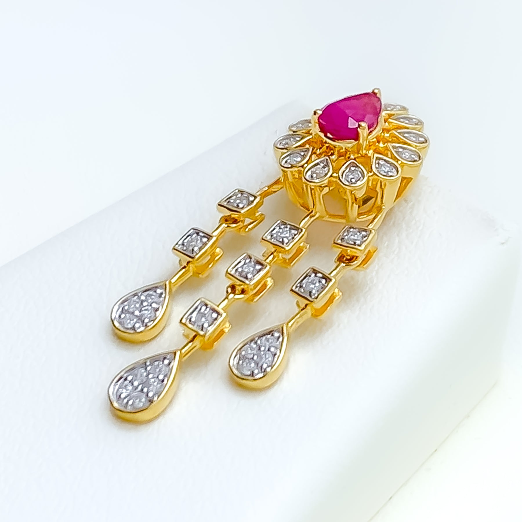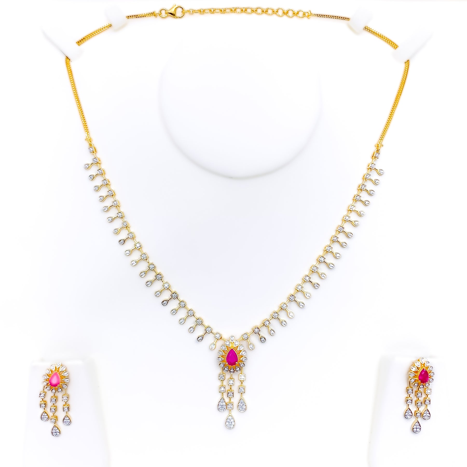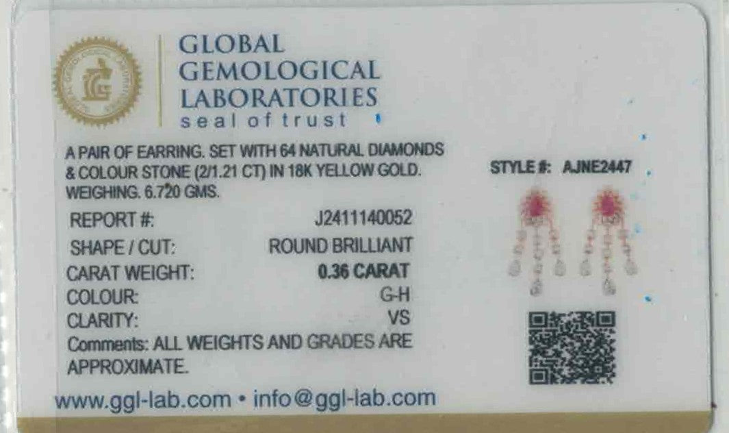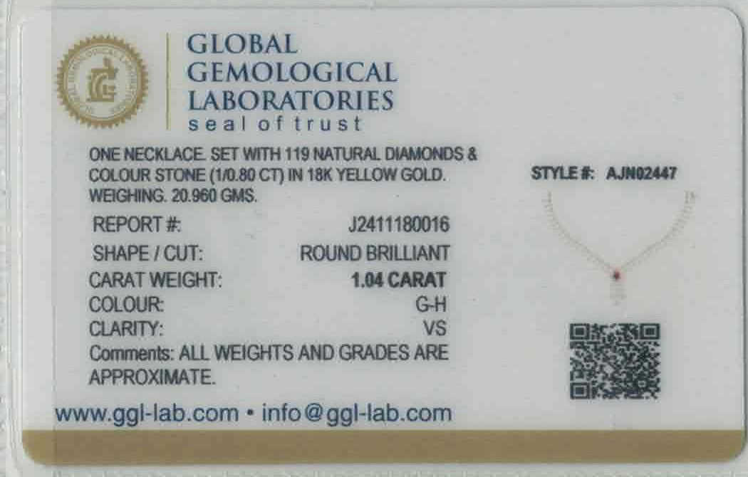 Elegant and vibrant, this 18k gold necklace set showcases a graceful floral drop motif accented by 1.4ct of VS-quality round brilliant diamonds and vivid cultured rubies. The 18" chain with 2" adjustable links is paired with coordinating 1.3" screw-back earrings. Thoughtfully crafted for special occasions, the design radiates timeless sophistication and charm. GGL-certified for authenticity and brilliance.